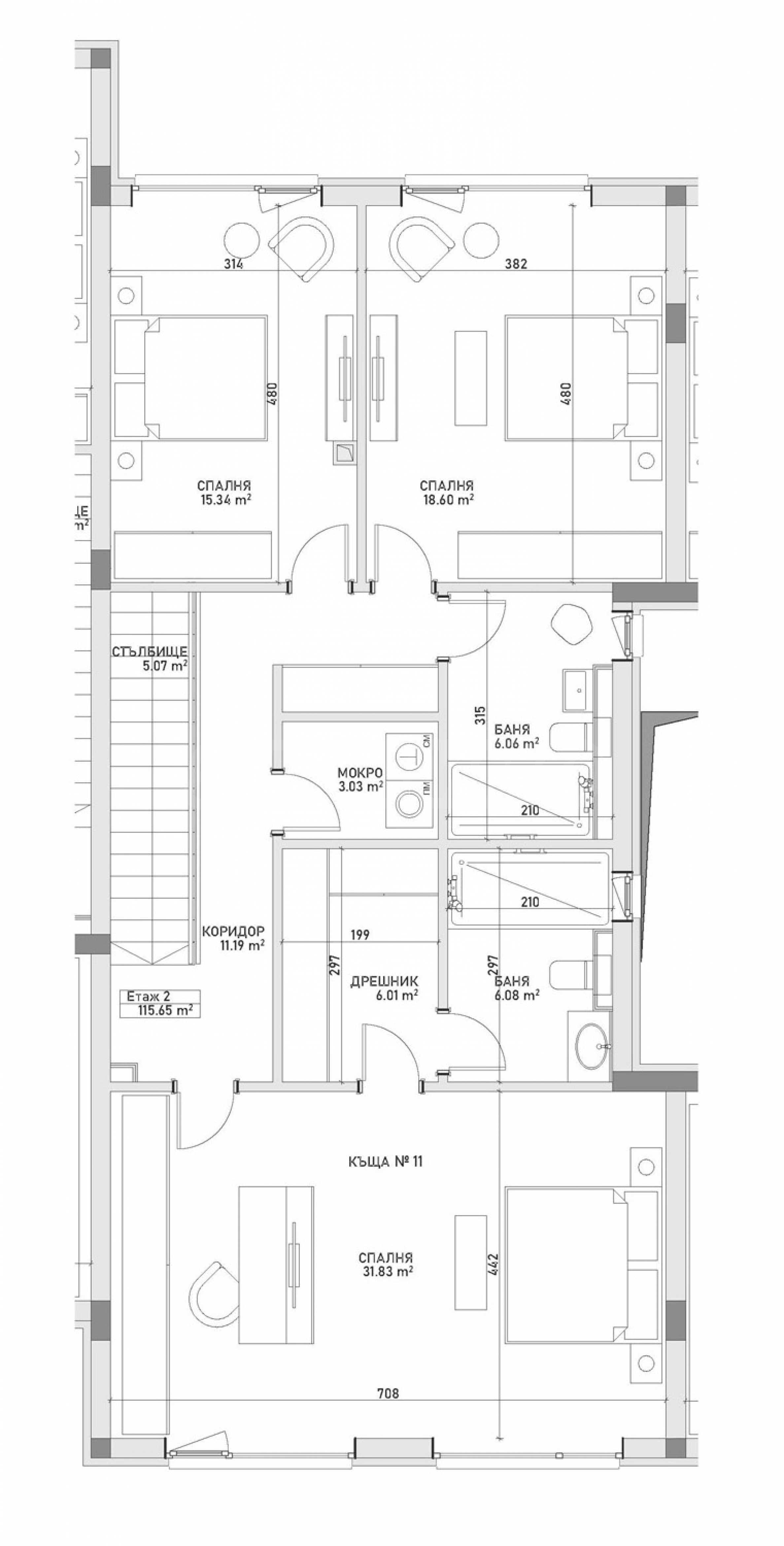 Second floor - three bedrooms, a closet, a utility room and two separate bathrooms with a toilet. The built-up area is 115.65 m2.