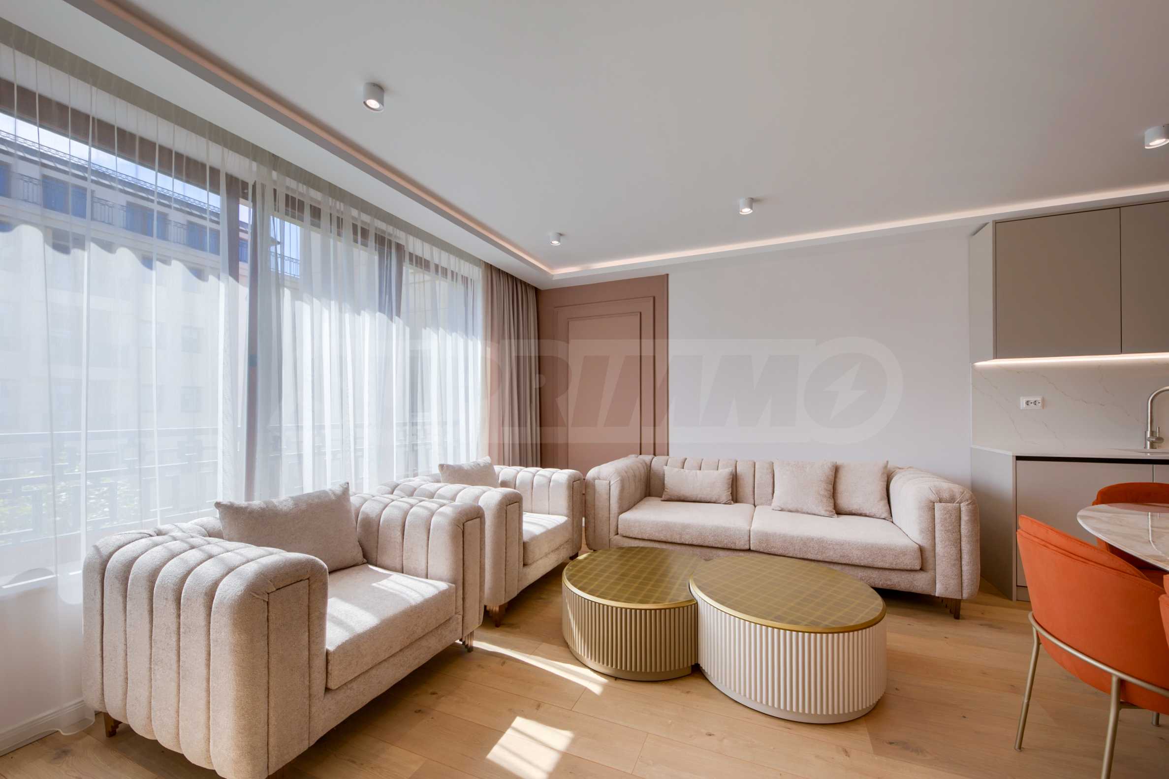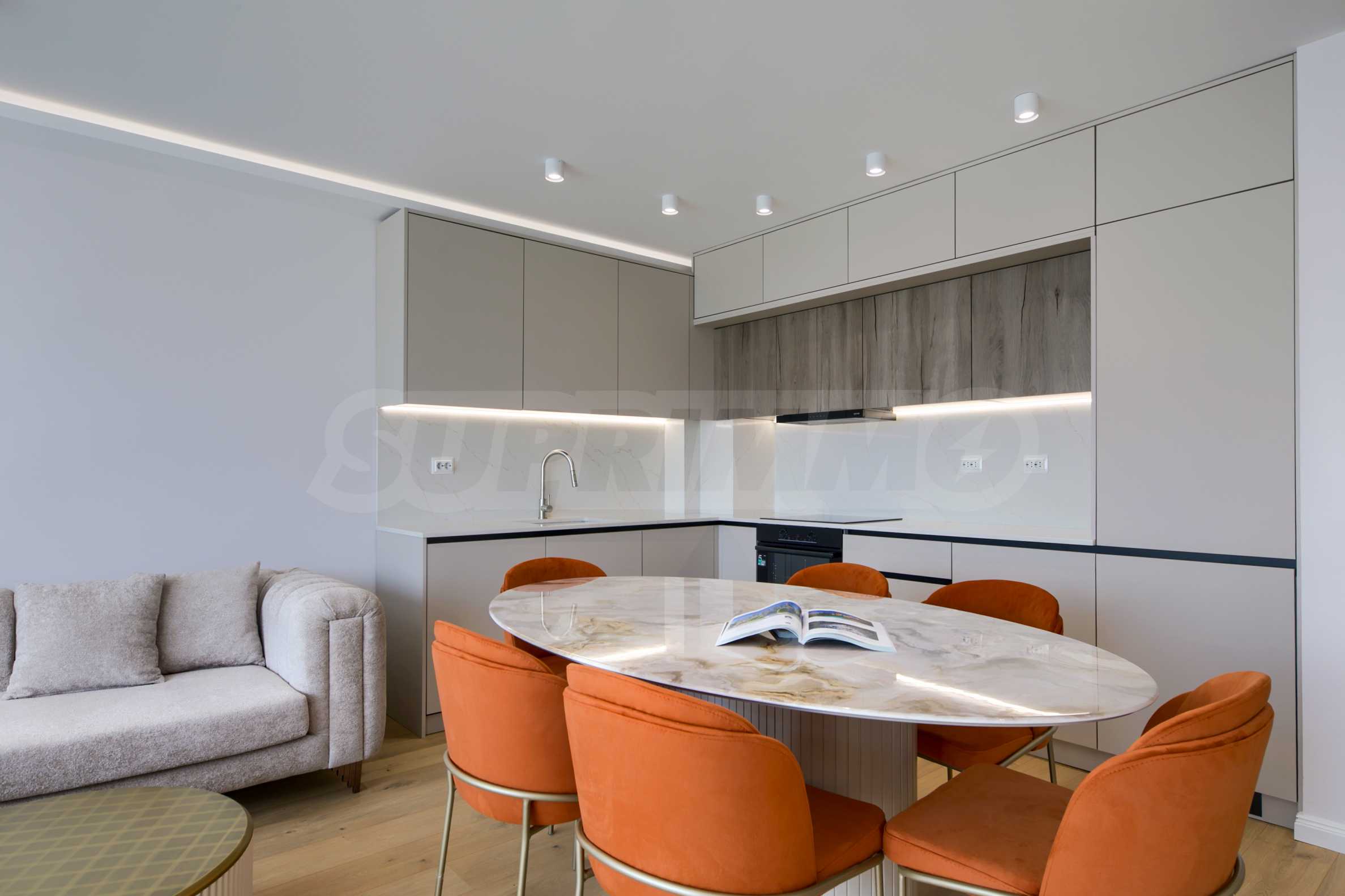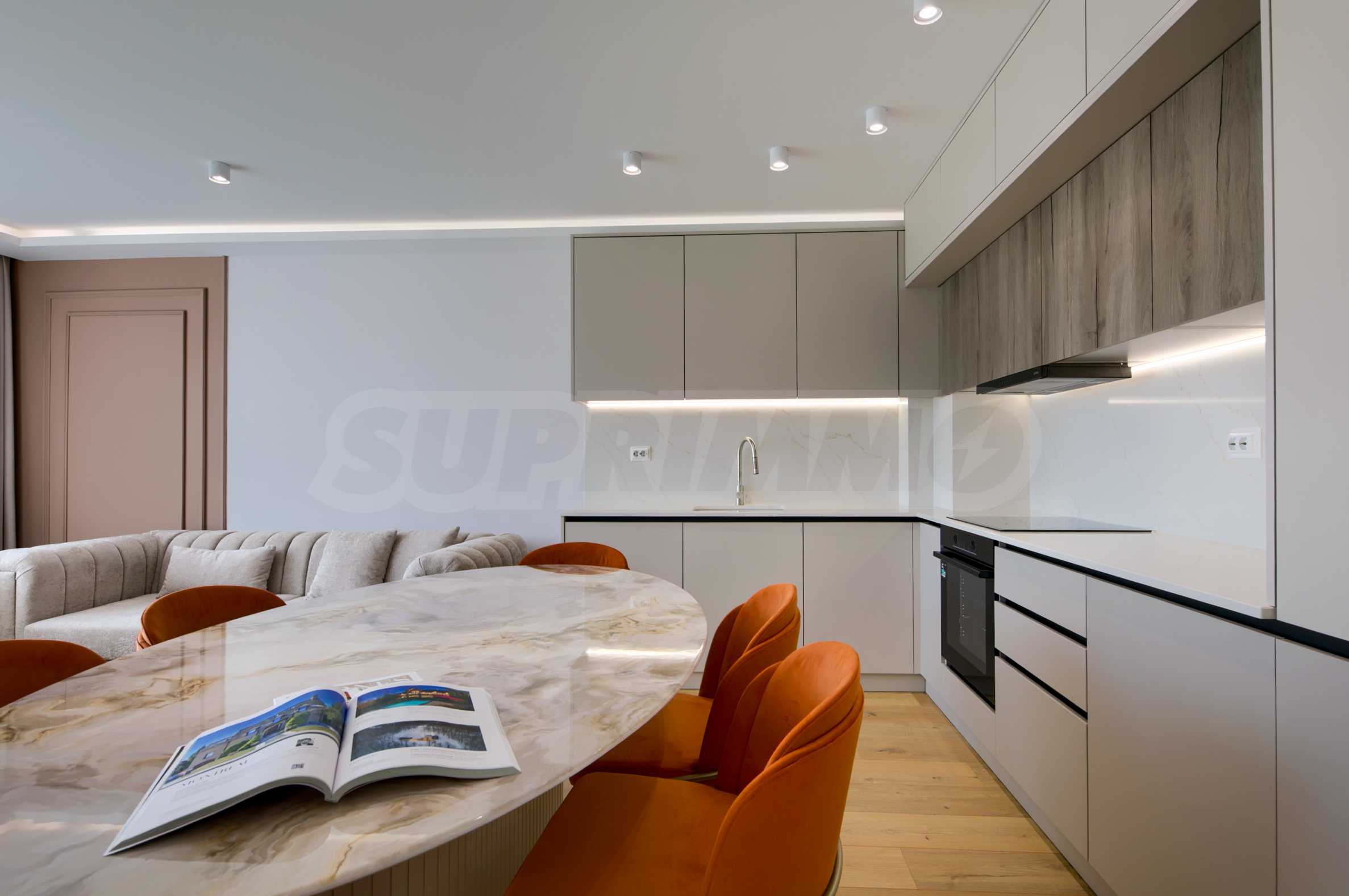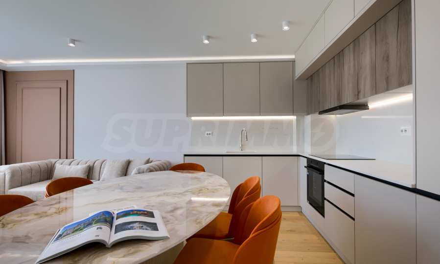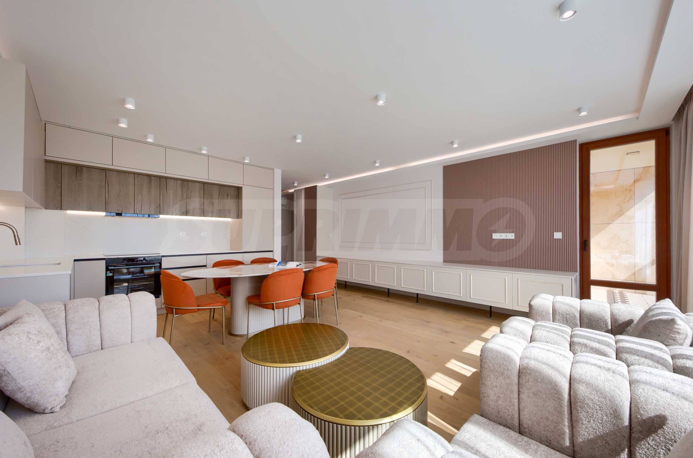 The living area is oriented to the east and overlooks the beautifully landscaped courtyard of the complex. The space combines a kitchen, dining area and relaxation area, with direct access to the terrace.
