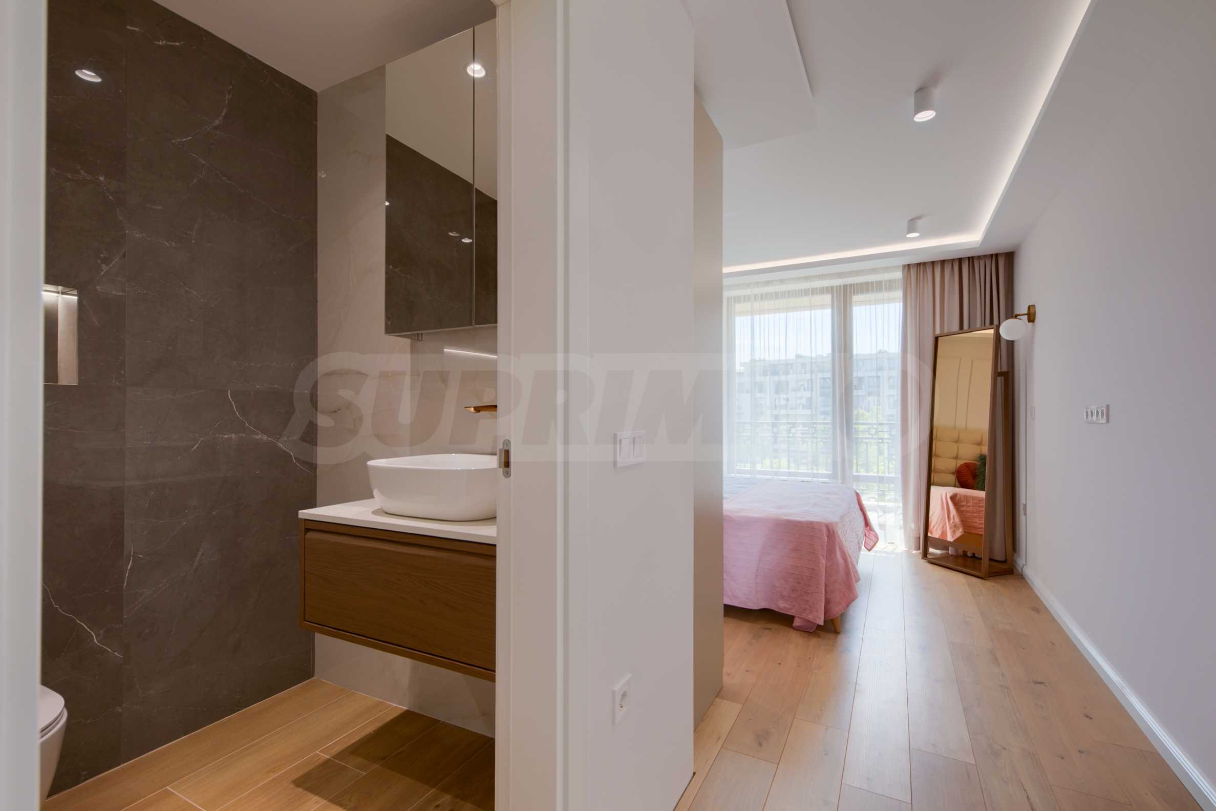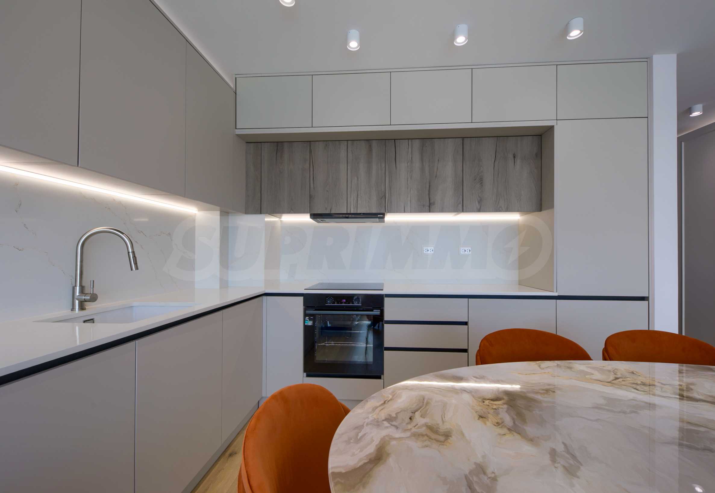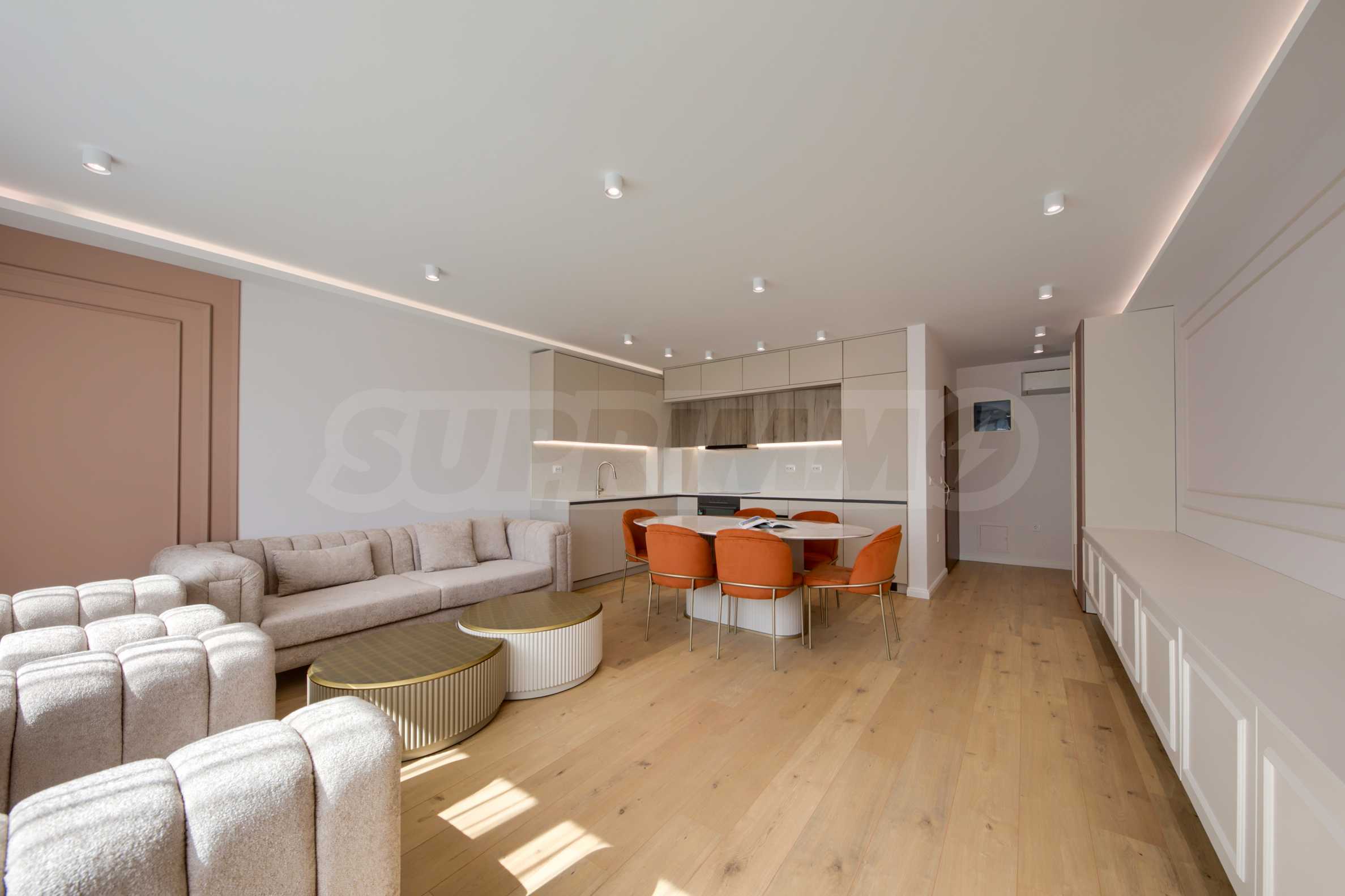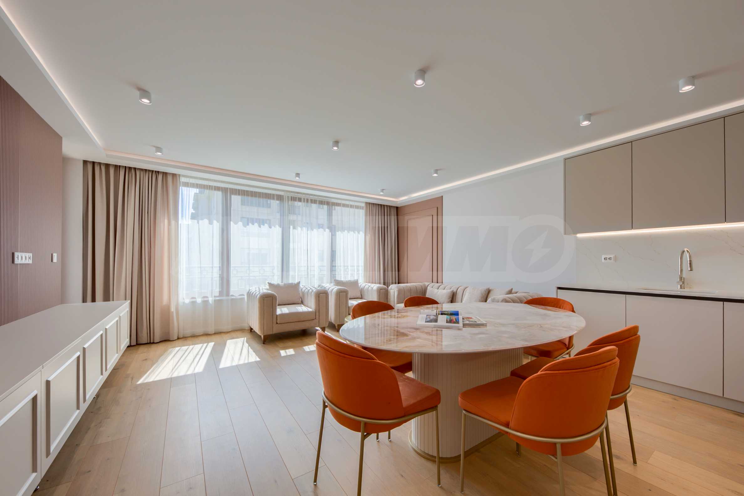 The living area is oriented to the east and overlooks the beautifully landscaped courtyard of the complex. The space combines a kitchen, dining area and relaxation area, with direct access to the terrace.