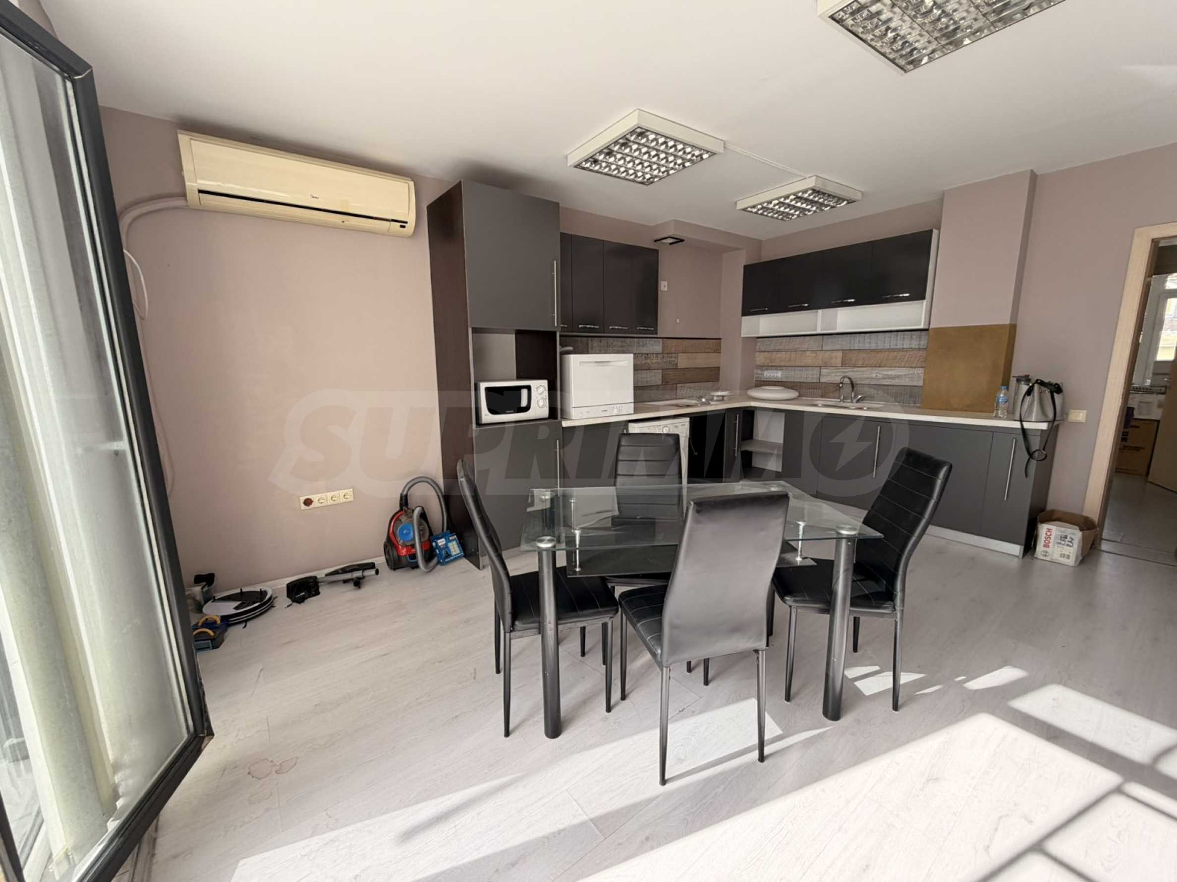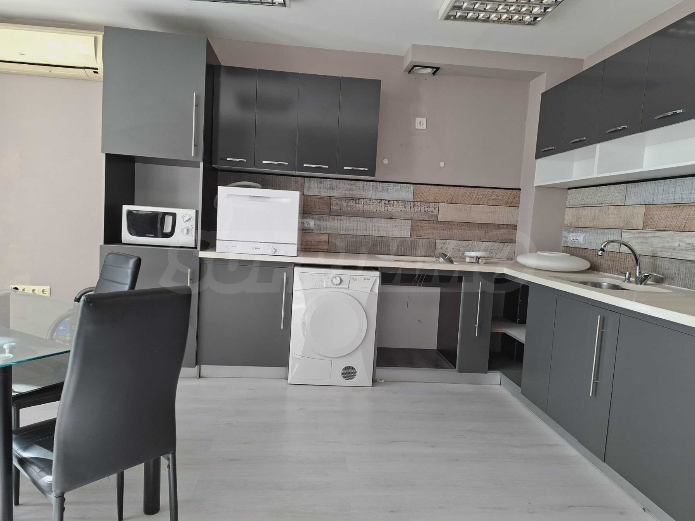 The apartment is partially furnished with kitchen furniture, washing machine and dryer, dishwasher, microwave, table with 4 chairs, air conditioners in each room. The floors are laminate, the walls are plasterboard, newly painted.