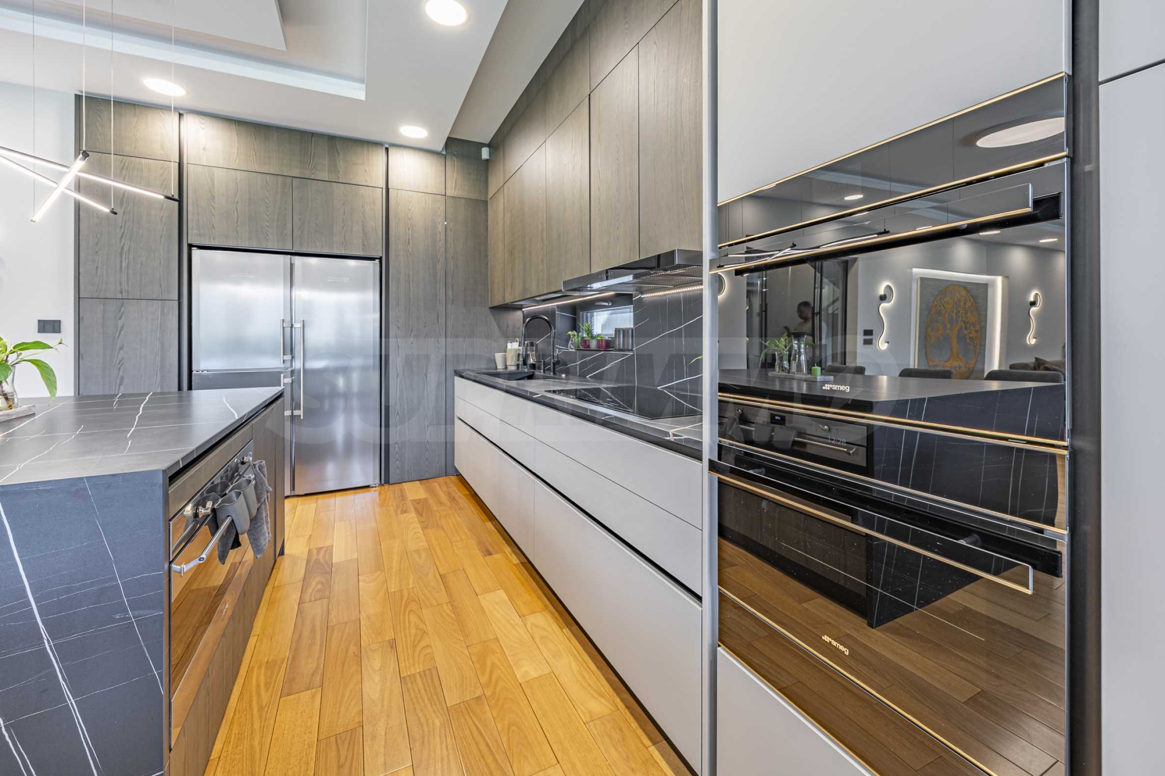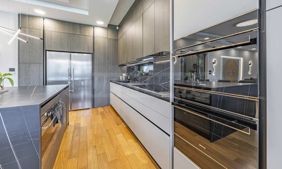 • The main space is occupied by a spacious living area with a fireplace, a dining area and a modern kitchen. The kitchen is equipped with high-end Smeg appliances and a double Liebherr refrigerator, combining style and functionality.