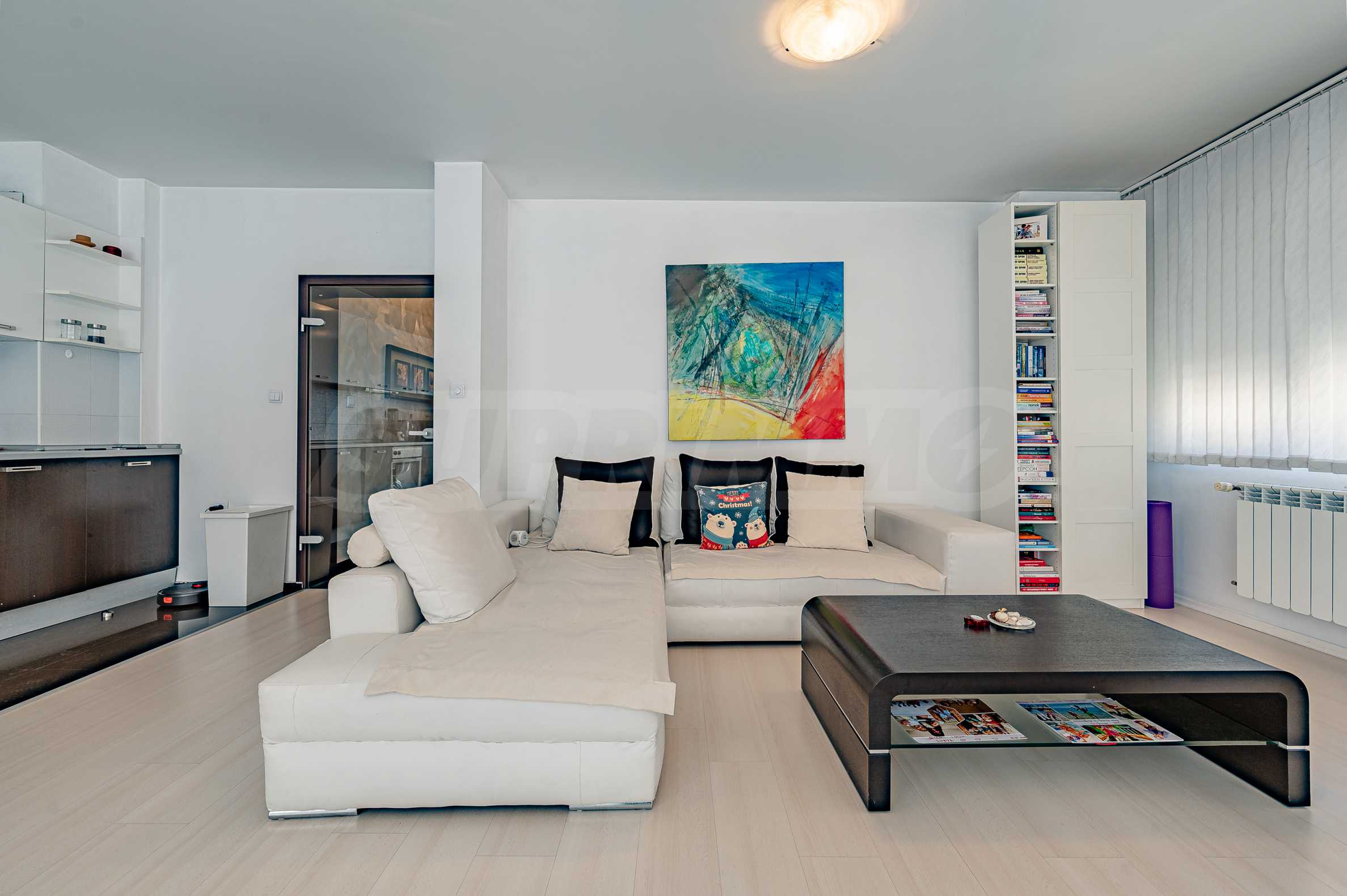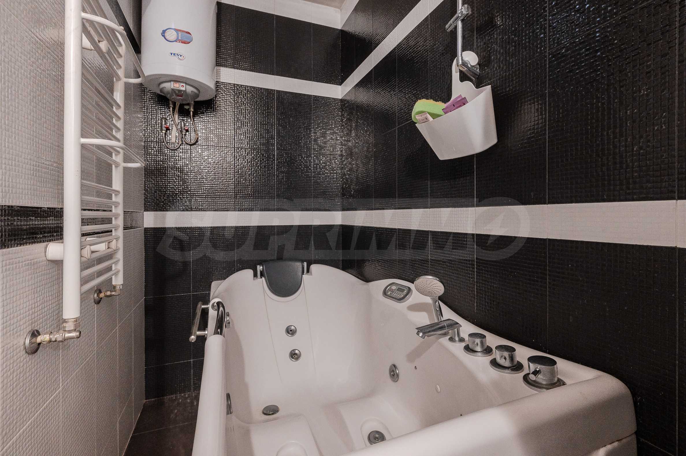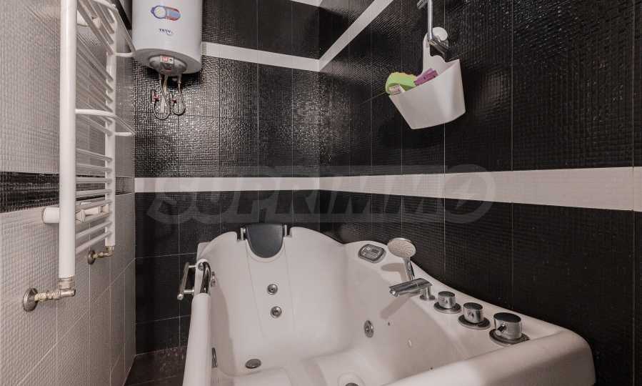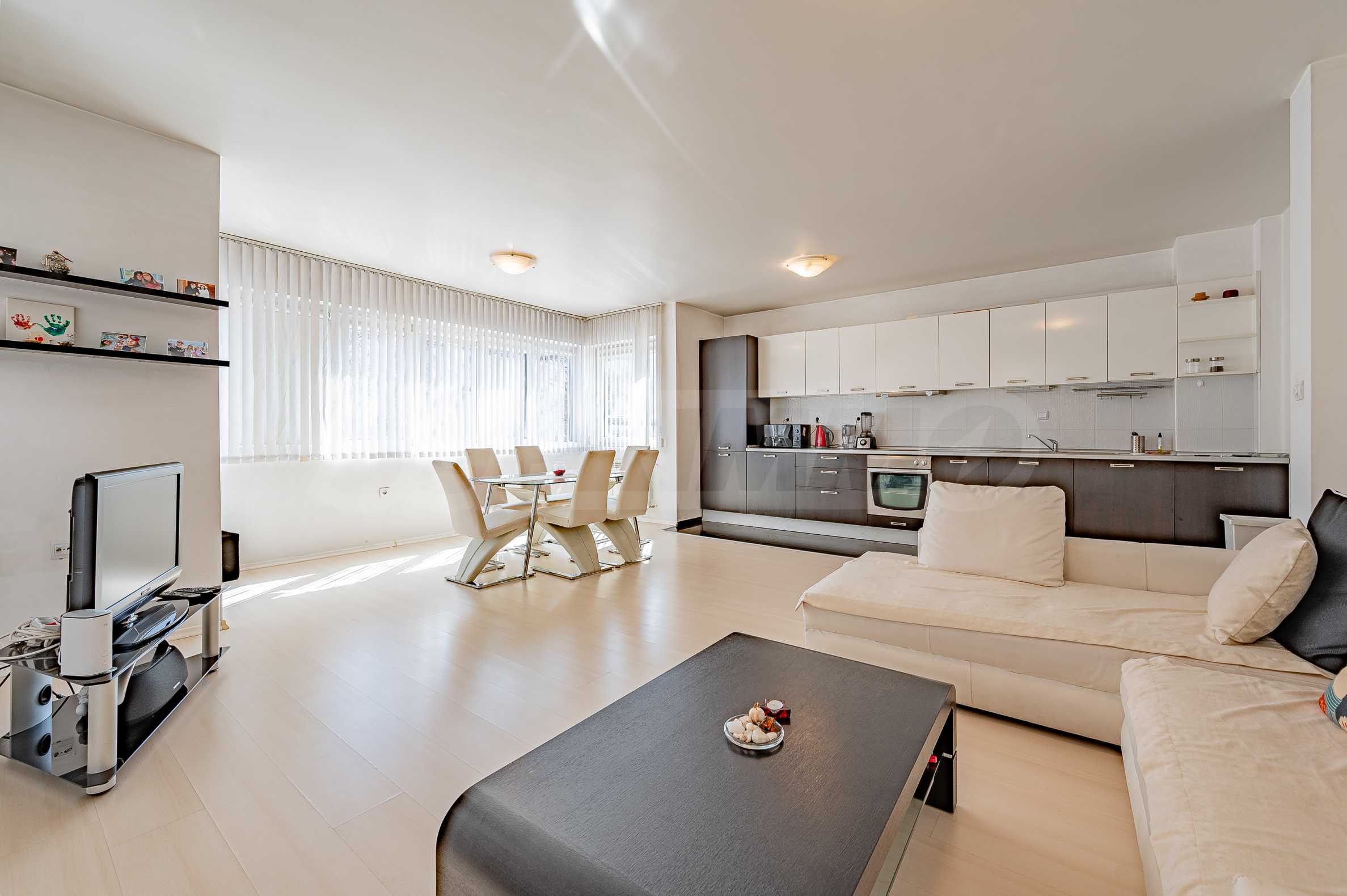 The apartment facilities a large and very bright living room with access to a terrace, designed with a kitchenette and fully equipped with built-in appliances - refrigerator with freezer, oven with sensor hobs, extractor hood, dishwasher, as well as a washing machine with dryer. The interior is designed with luxurious furniture, leather sofa and chairs, plasma TV and double blinds, which complement the comfort of the space.