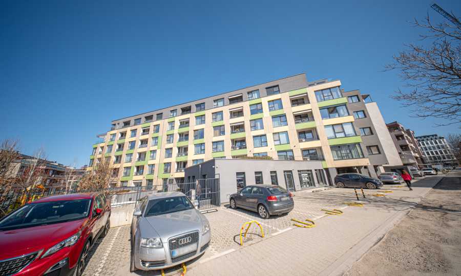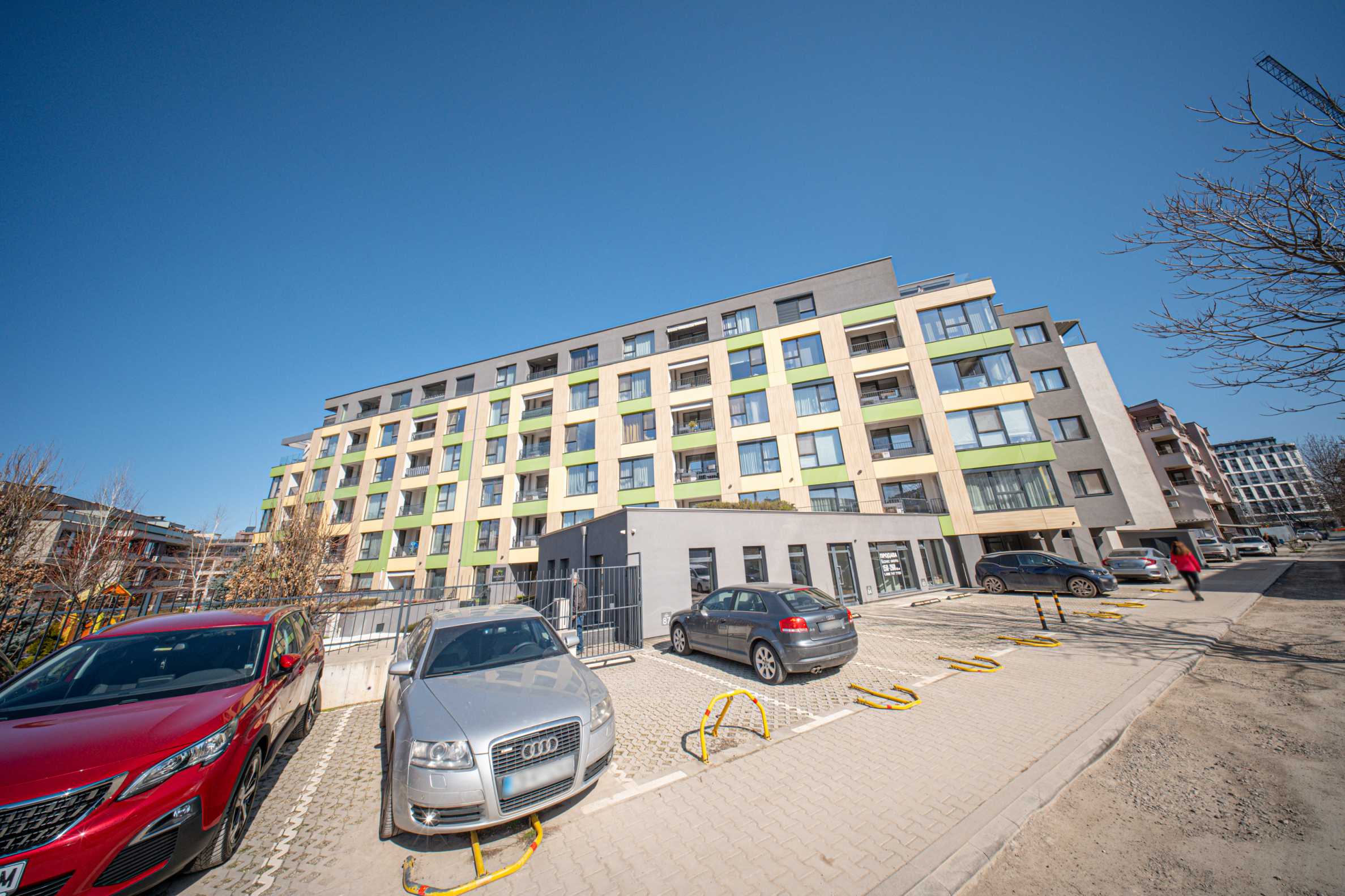 The building stands out with a spectacular colorful facade, has commercial premises and a children's playground on the territory. It is finished with high-class materials, such as REHAU windows and HPL cladding, has Act 16.
