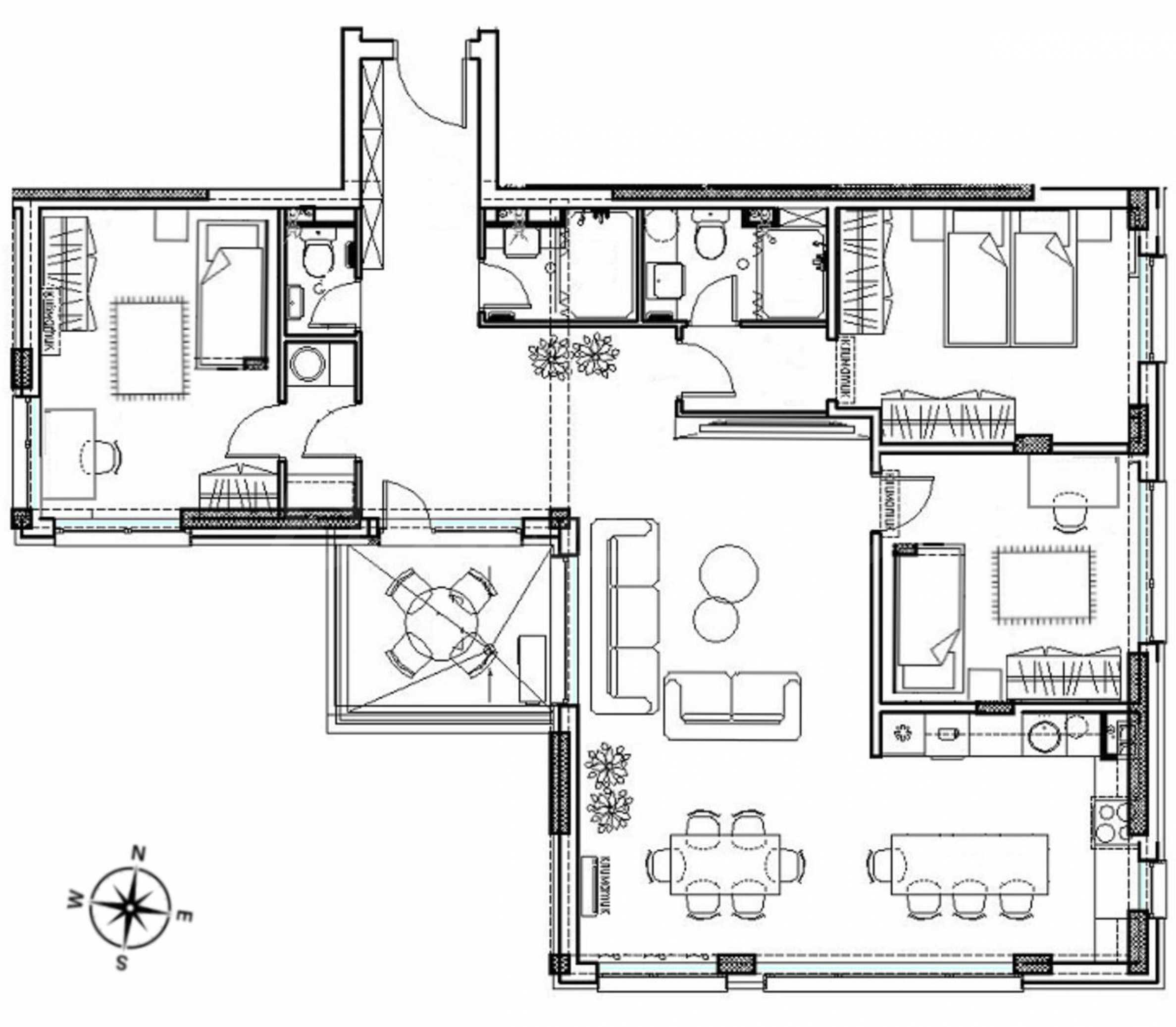 The apartment is located on the 4th floor of 6 and has a total area of 154 sq m, with a favorable south/west exposure, which provides light and comfort throughout the day.