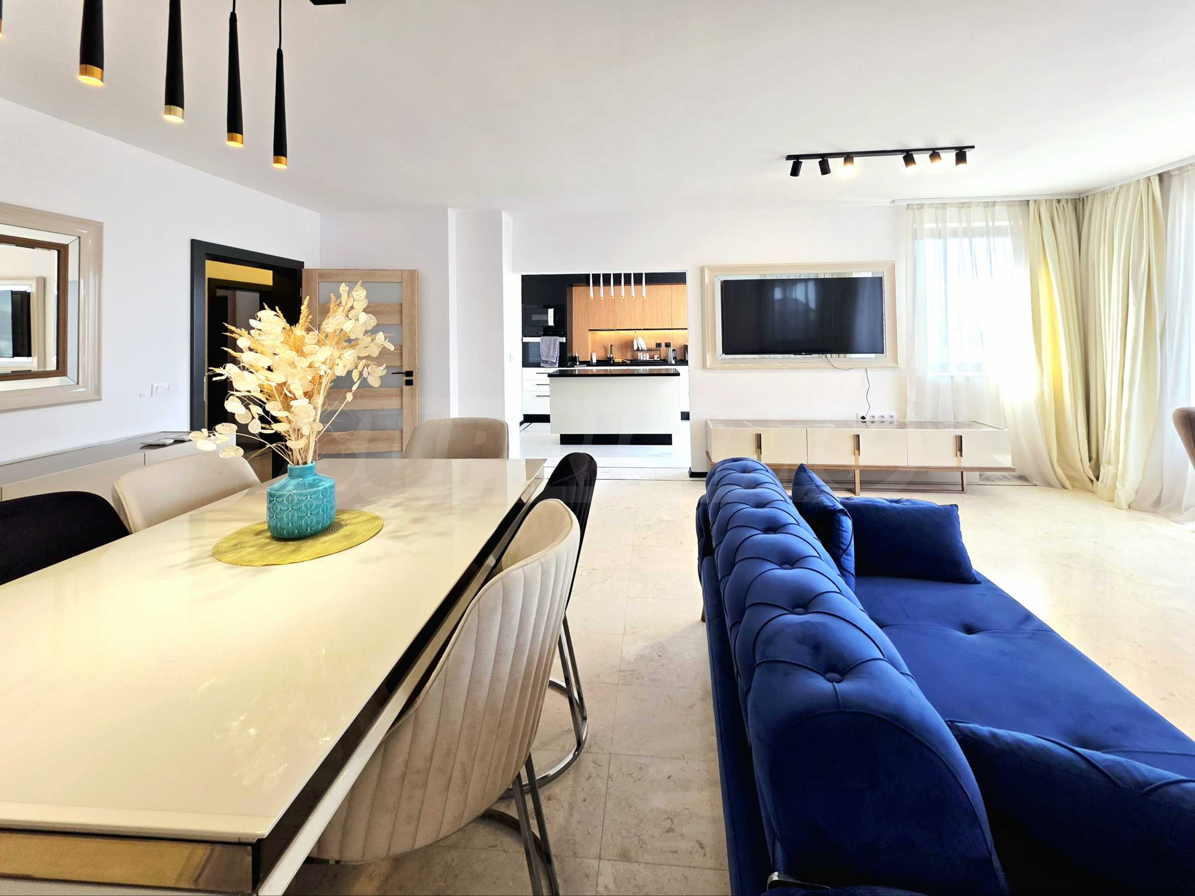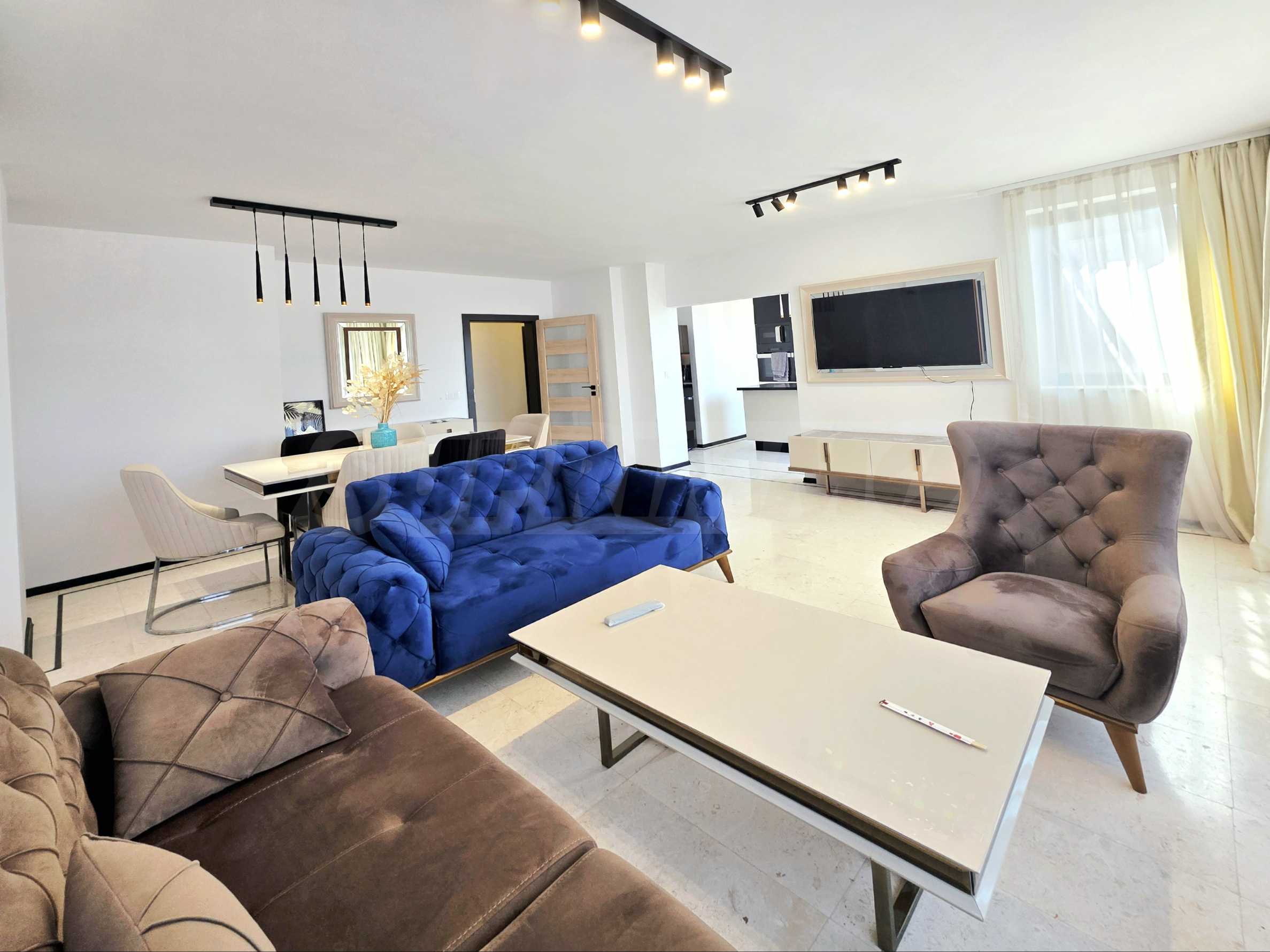 The flooring is natural stone in the living room, kitchen and hallway, carpet in the bedrooms. The building is connected to a central heating system, the radiators are not installed, but are available and included in the sale price. Heating and cooling are provided by the latest generation of energy-saving air conditioners "Samsung".