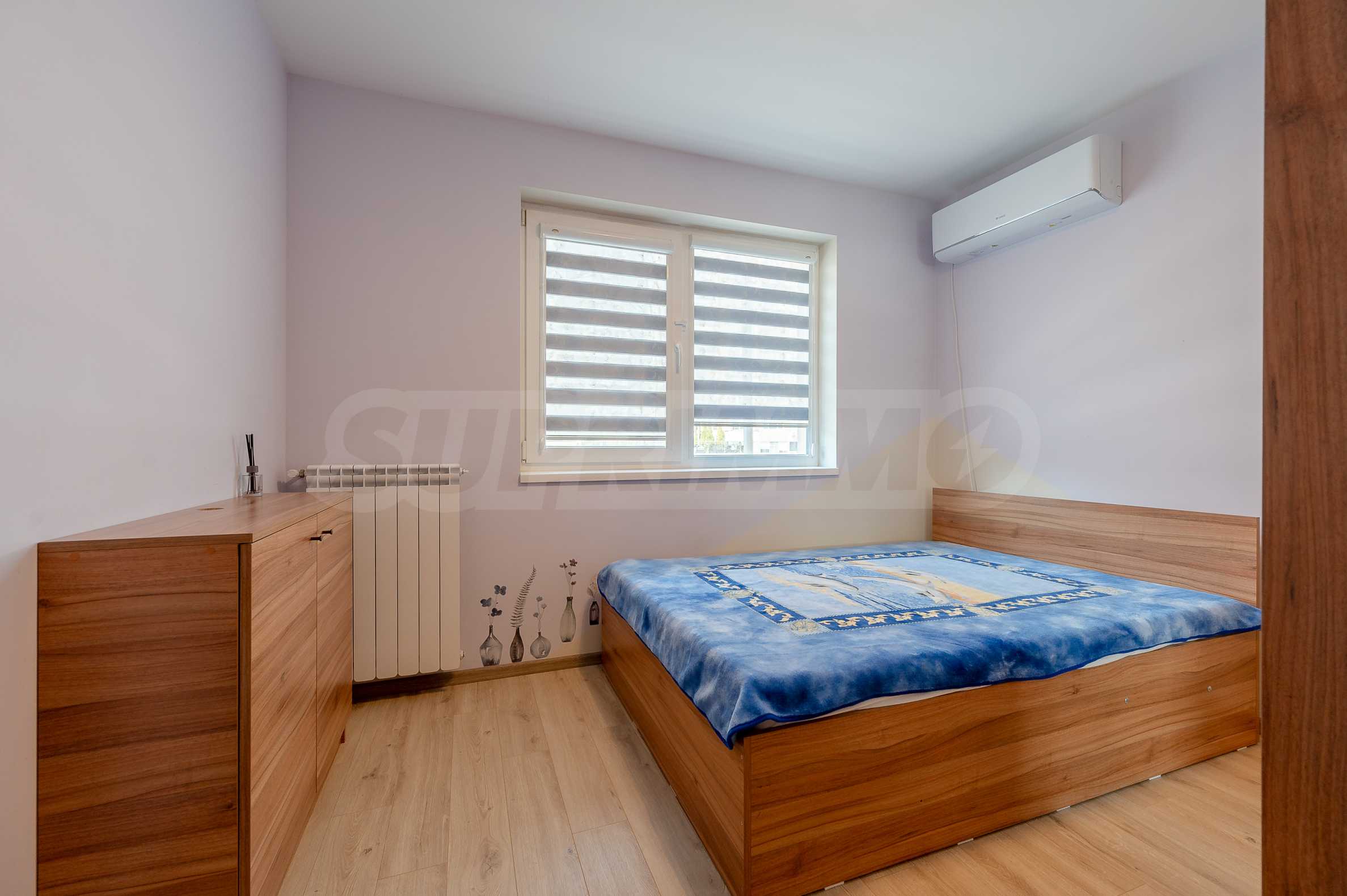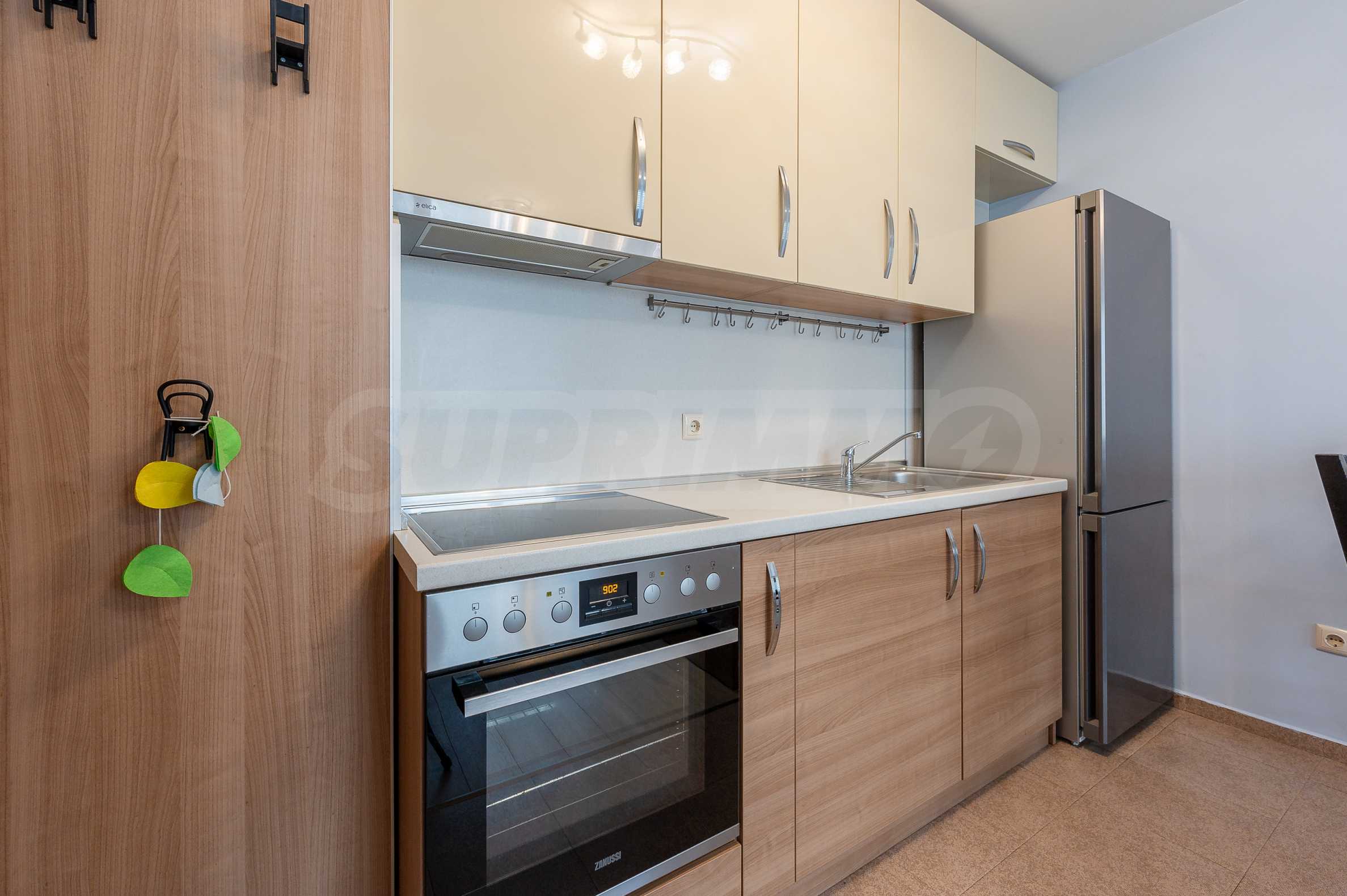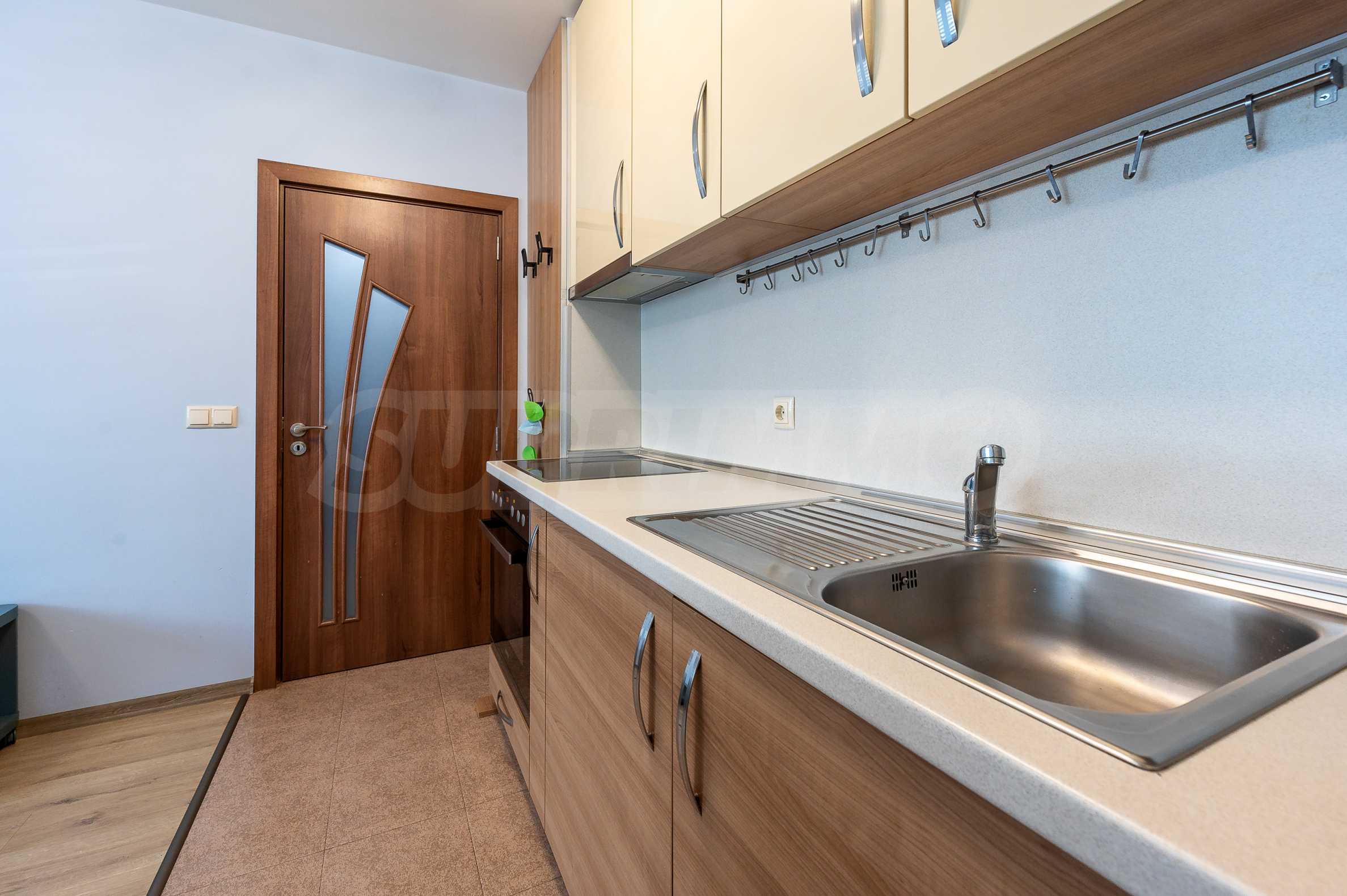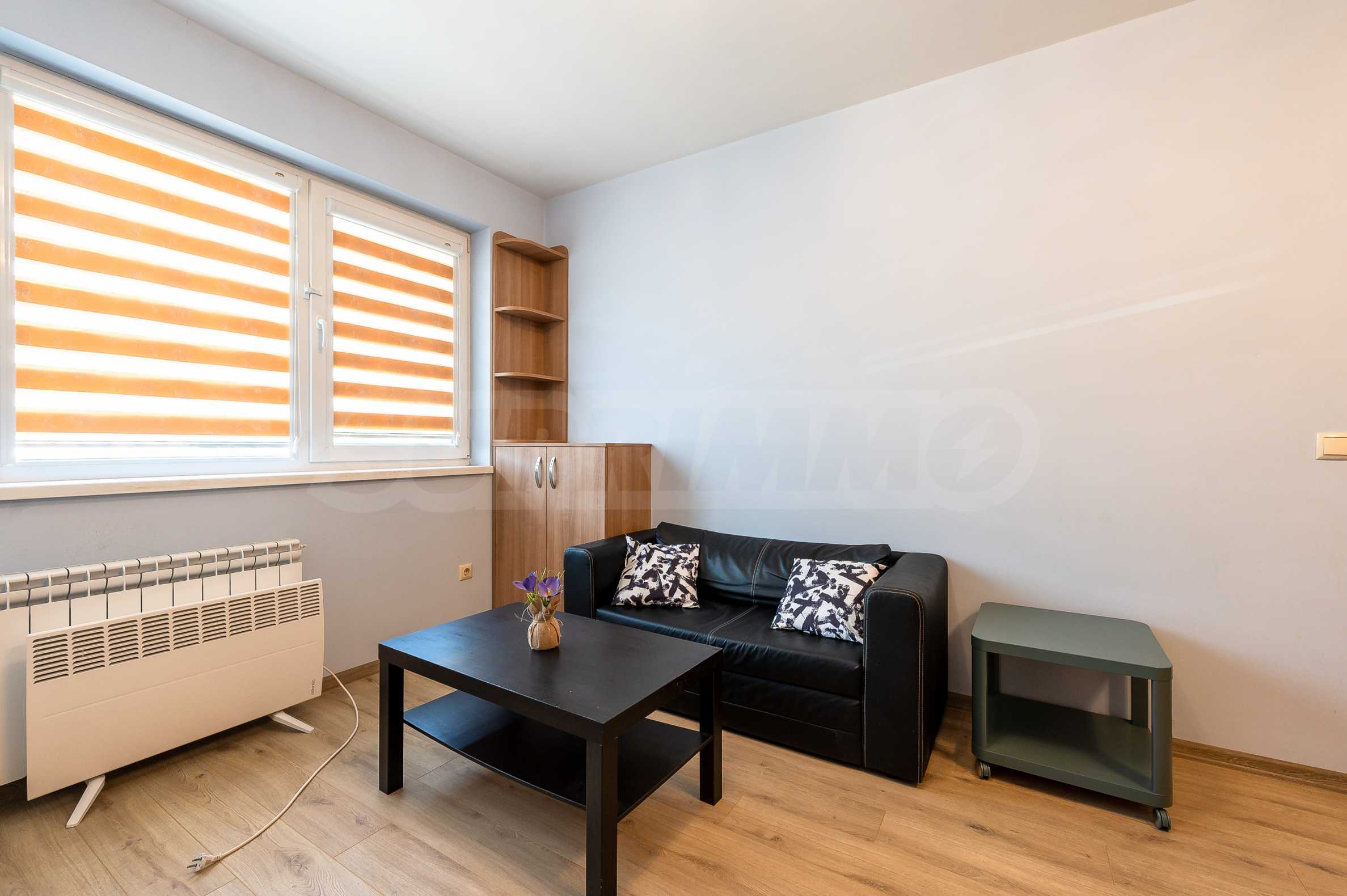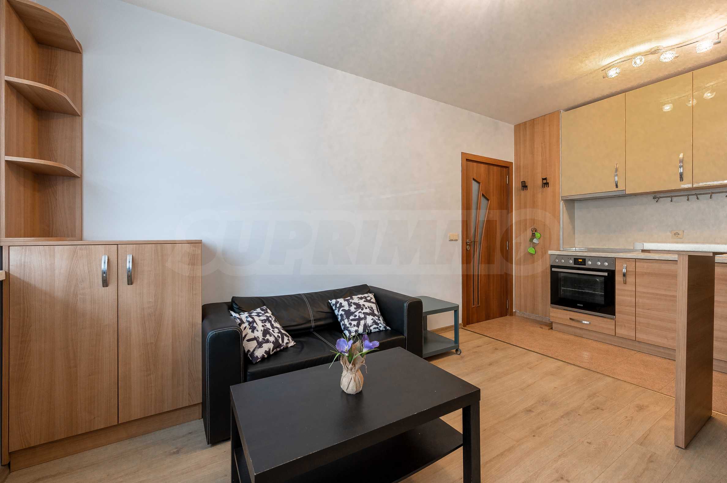 The apartment is fully furnished and equipped, with a functional layout: entrance hall, living room with kitchenette, bedroom and bathroom with toilet. The heating is electric - through an inverter air conditioner in the bedroom and an electric stove in the living room, and hot water is provided by a boiler.