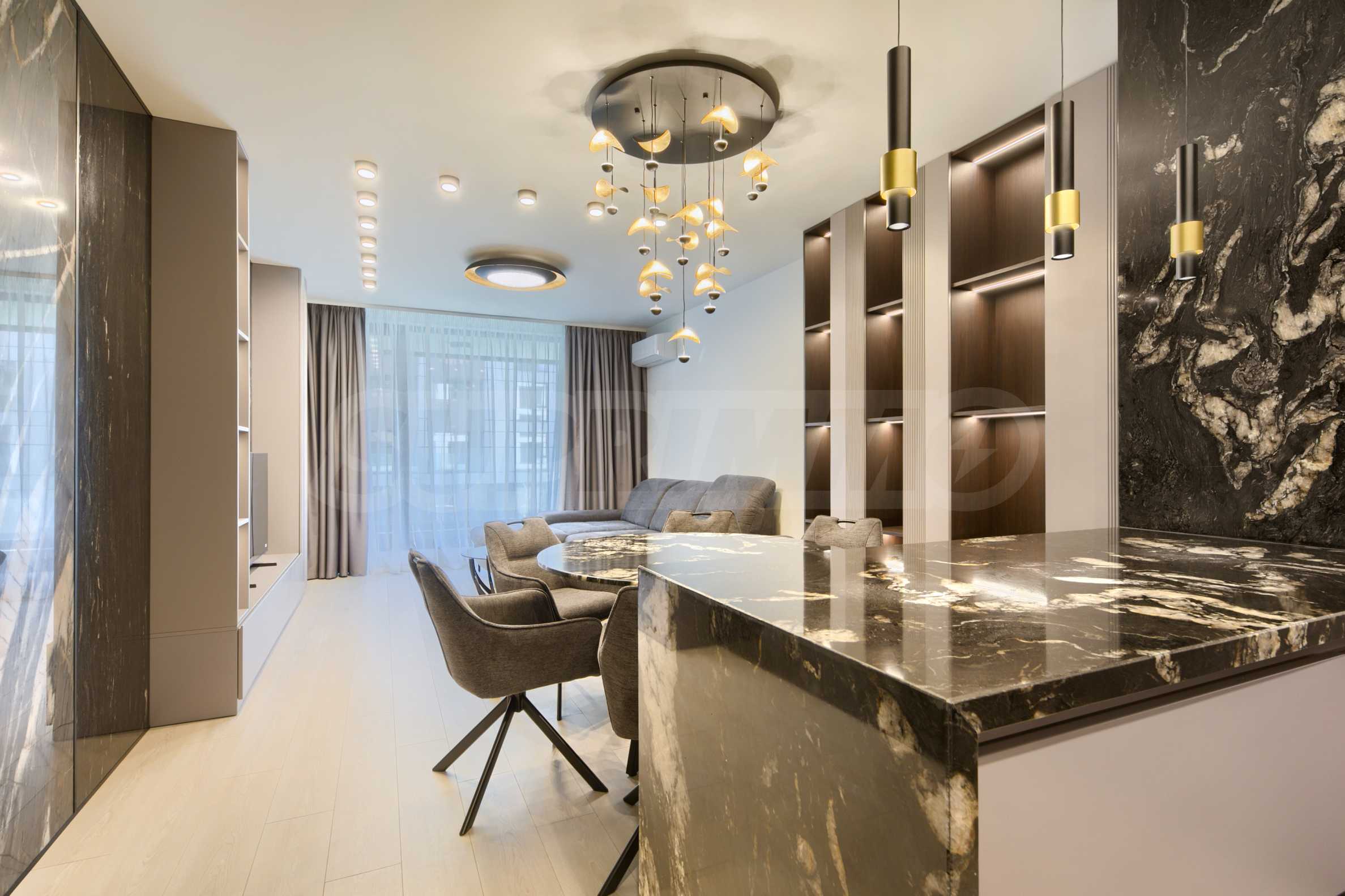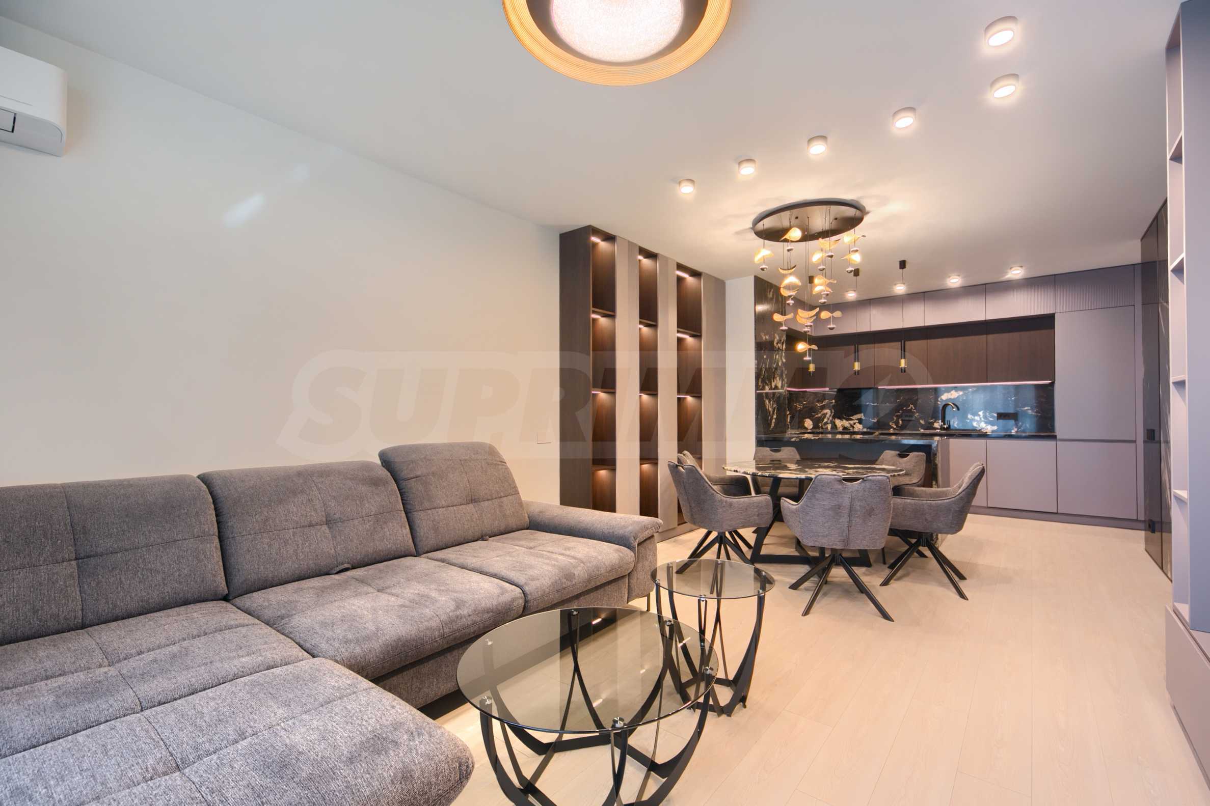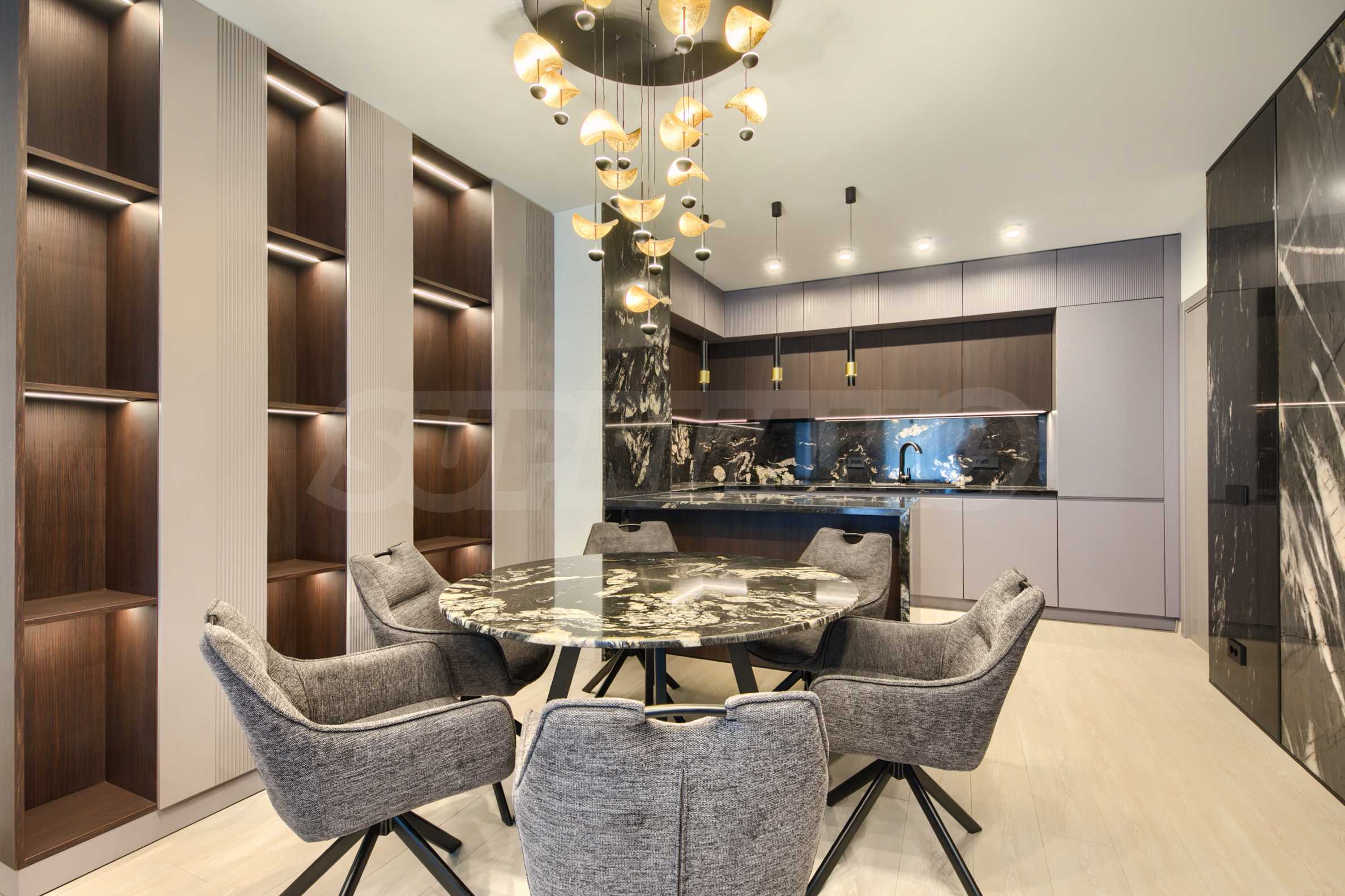 The living area is designed with attention to every detail and offers modern and sophisticated furnitures - comfortable upholstered furniture, a massive dining table, designer lighting and stylish decorative elements.