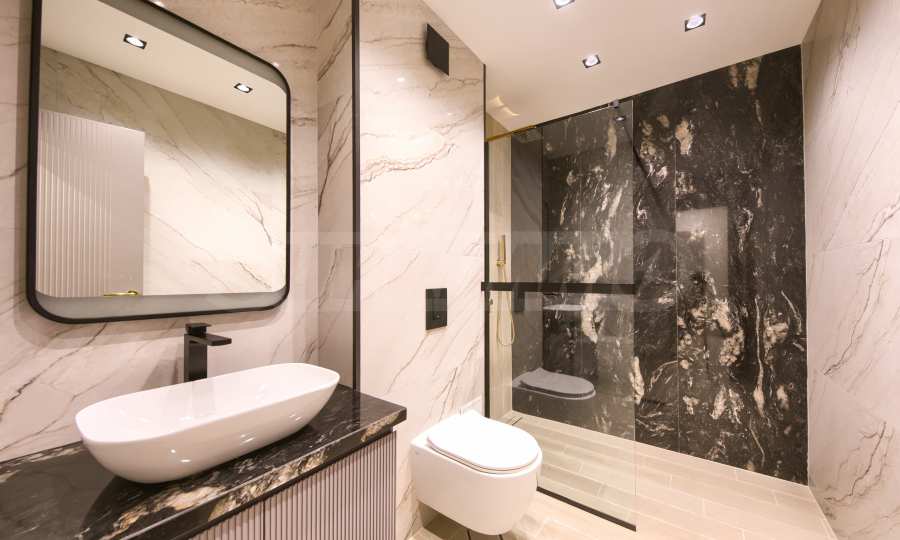 The apartment is part of a modern residential complex with impressive architecture, complete with a suspended facade made of large-format Laminam panels and high-quality materials.