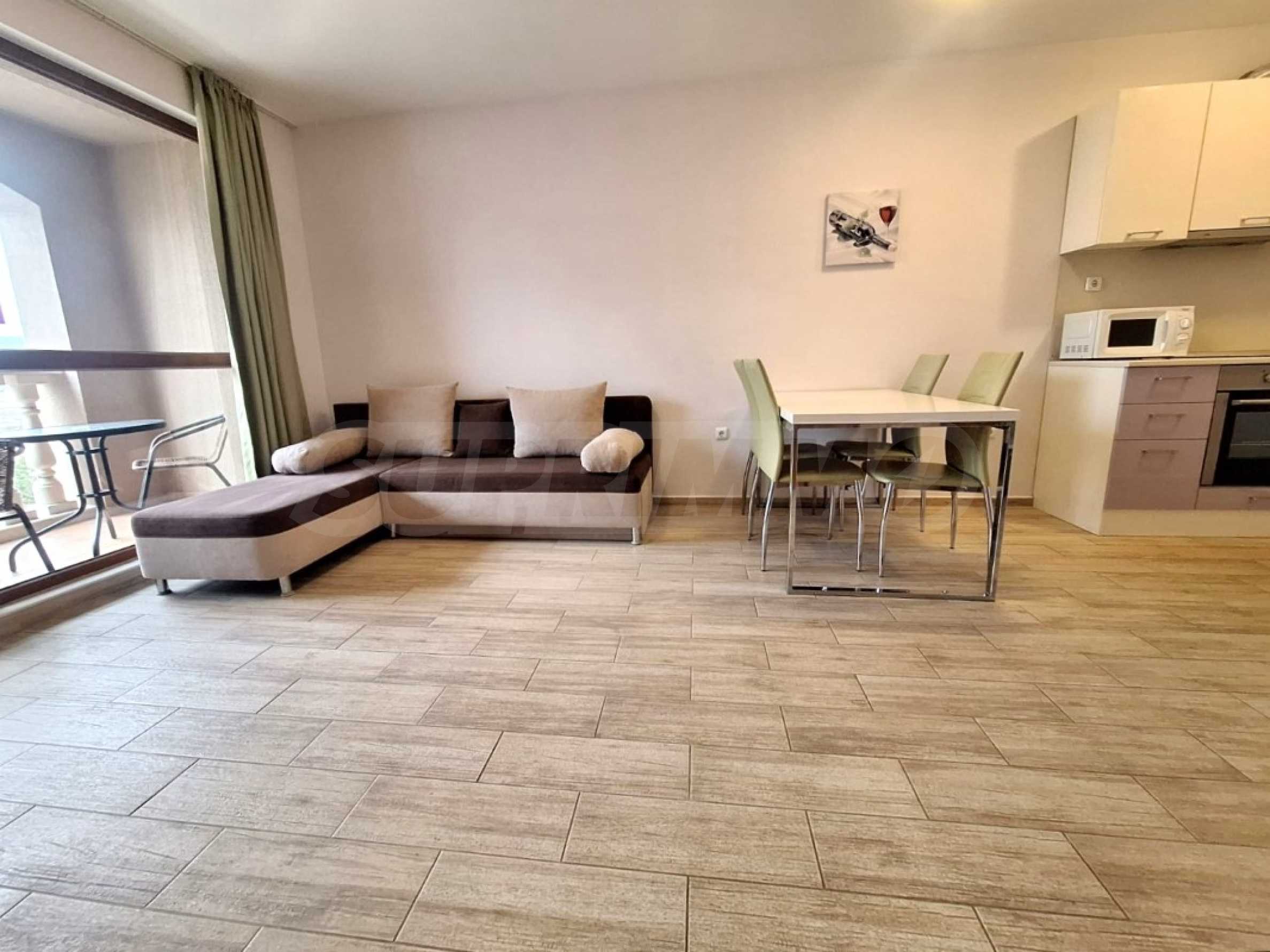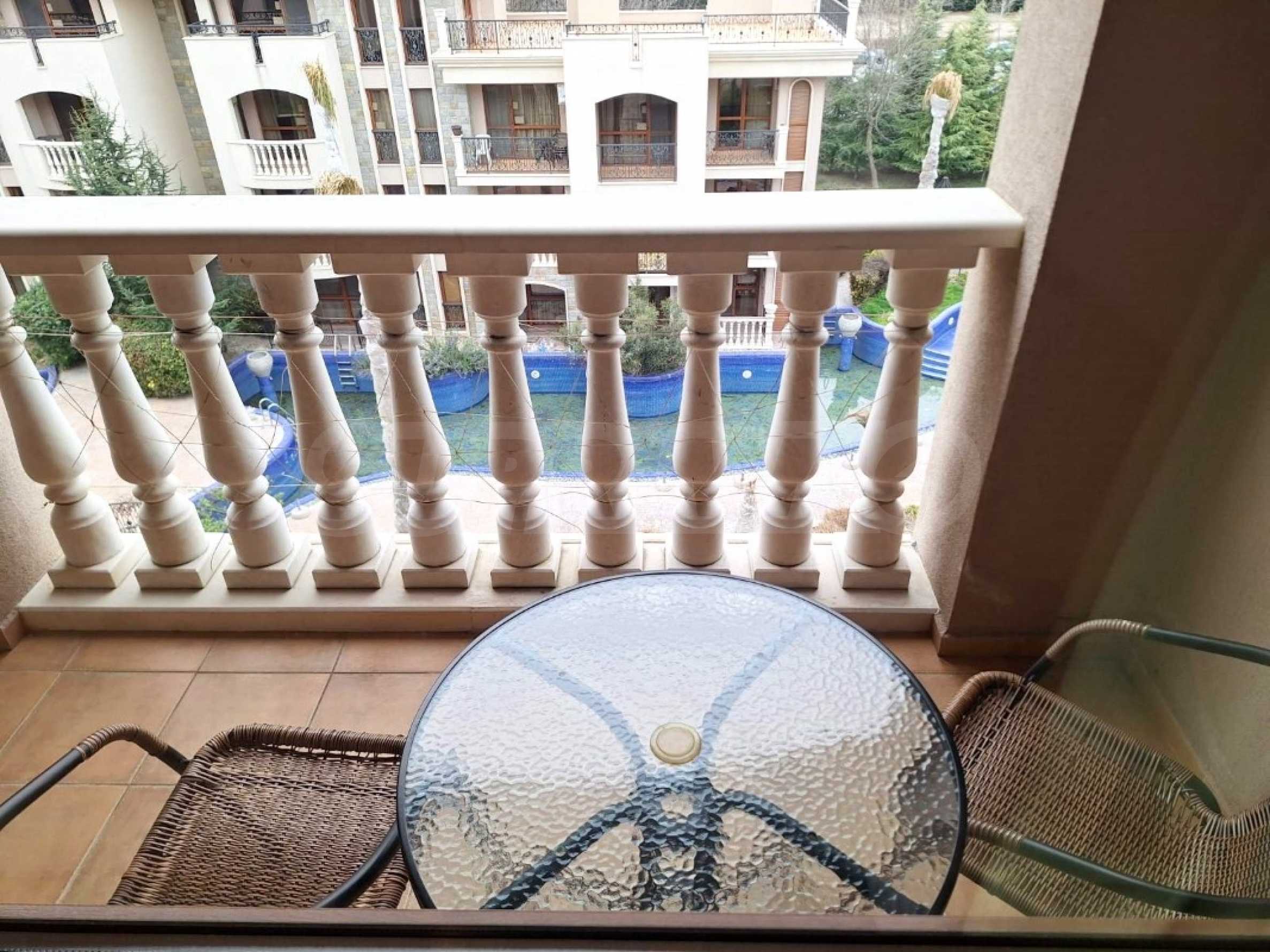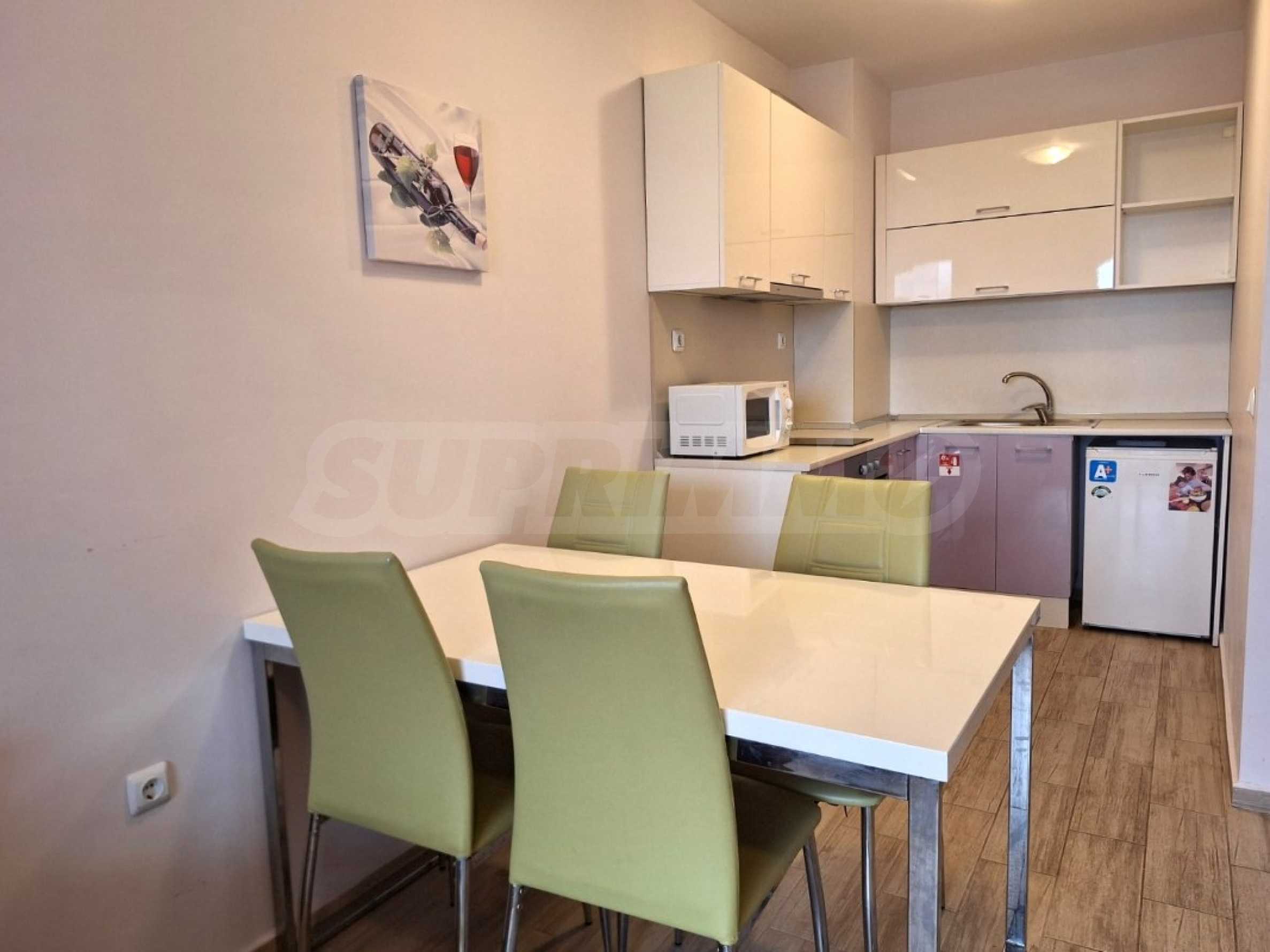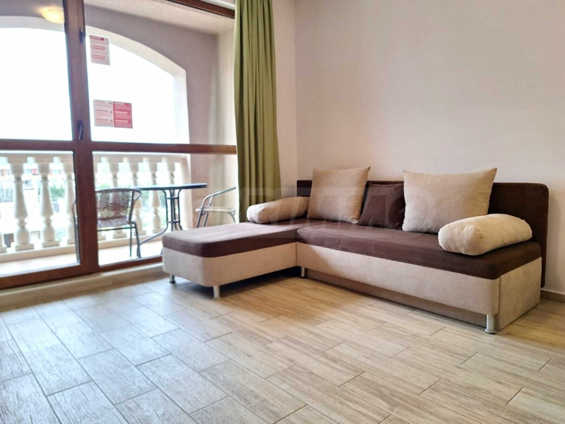 The charming complex is fully completed, put into operation and successfully functioning. Its vision is distinctive - Mediterranean style, with a wonderful pool and garden, with recreation areas and corners for children. The convenient location of the complex in close proximity to the aqua park, bus stops, restaurants, shops, hotels, banks, etc. contributes to the properties being used year-round, and as an attractive investment, with the possibility of generating rental income during the summer season.