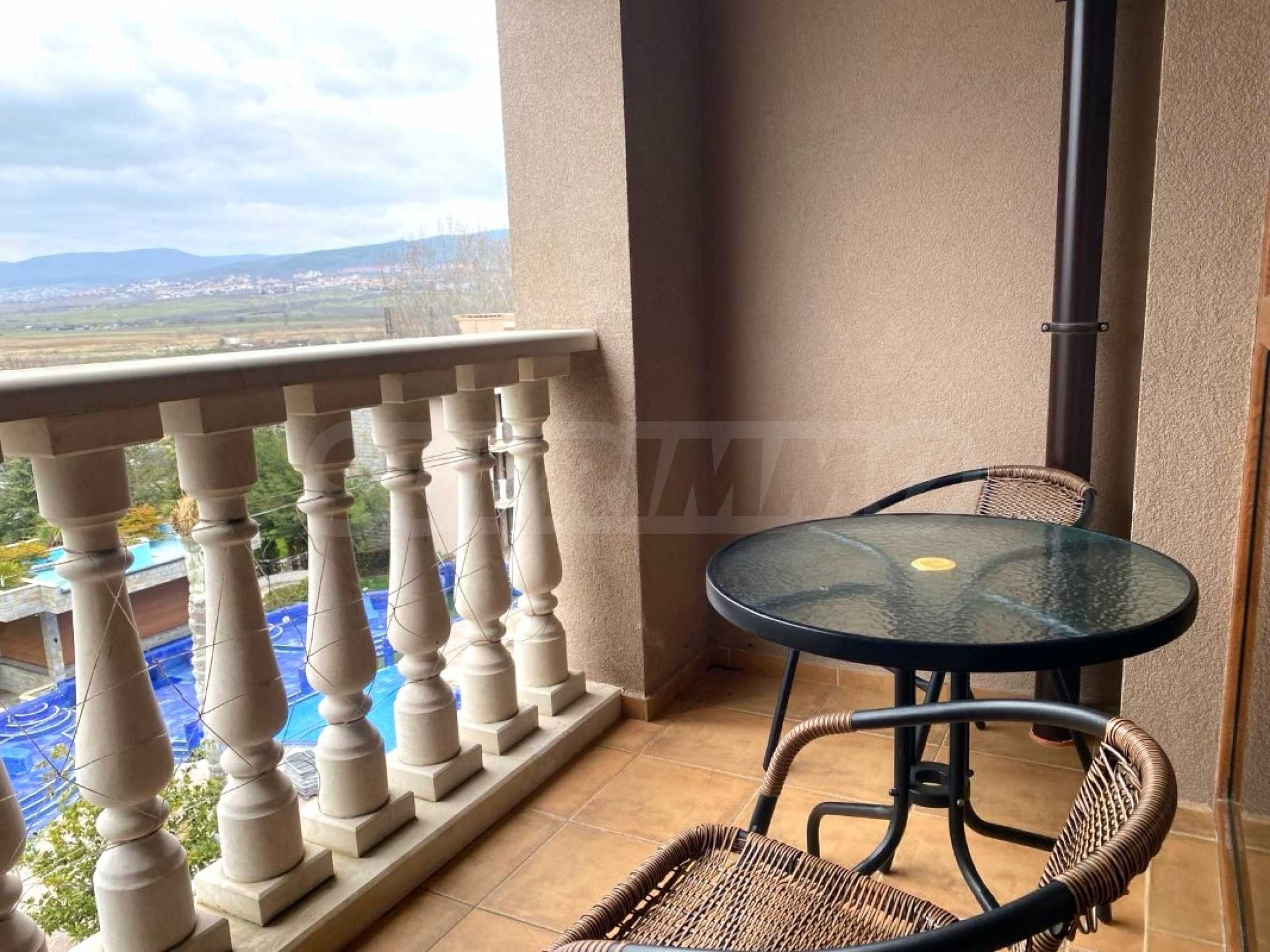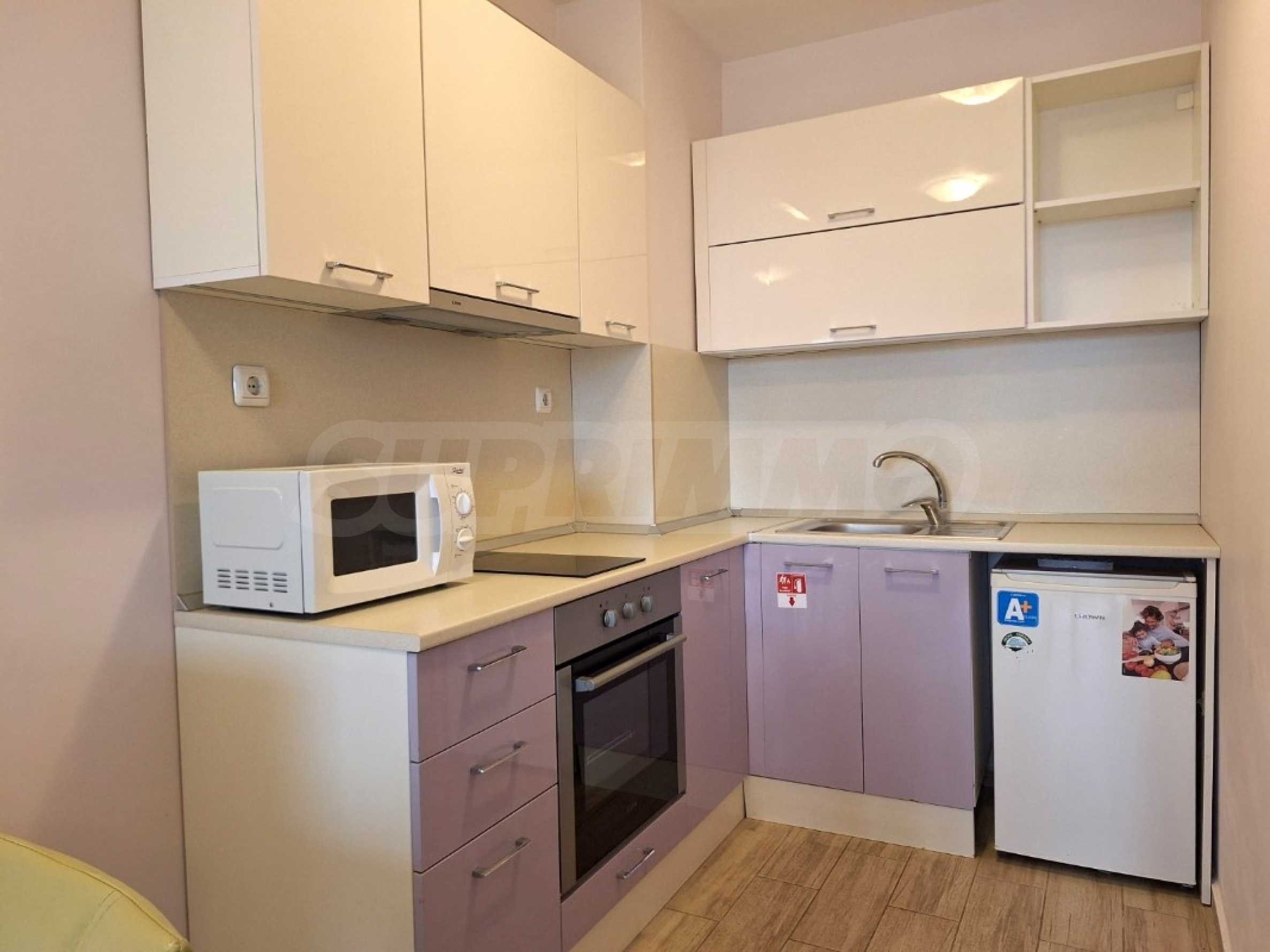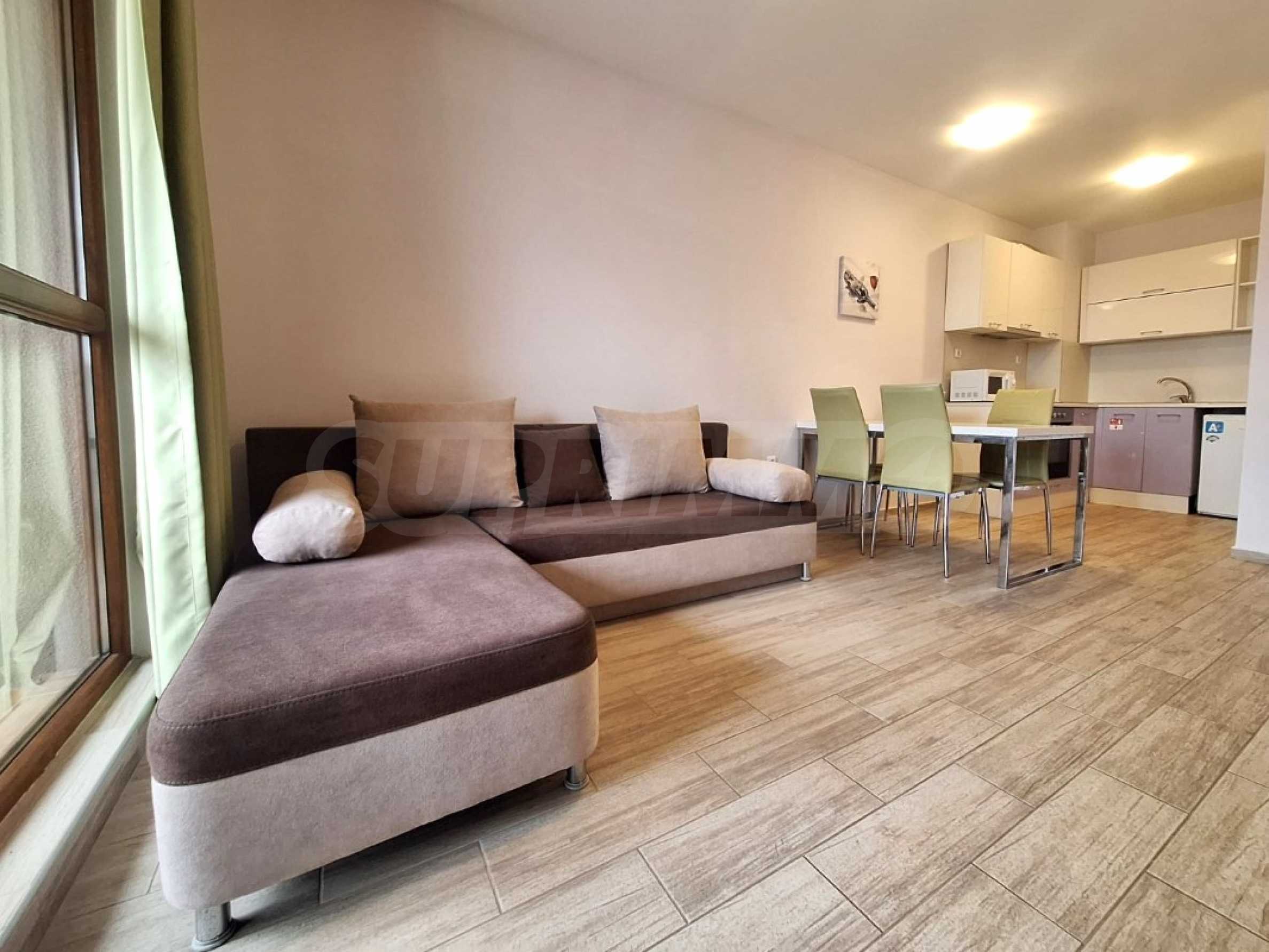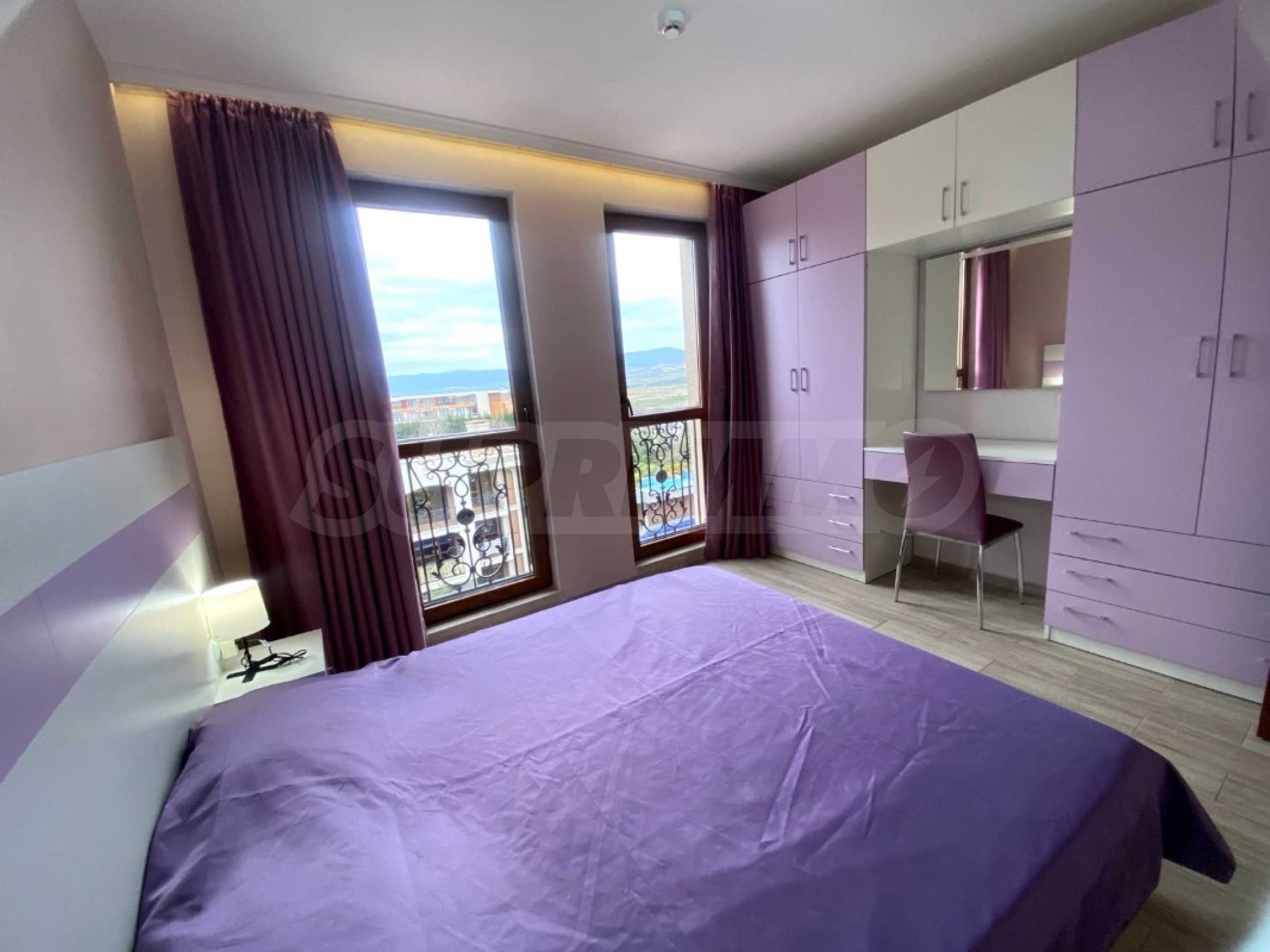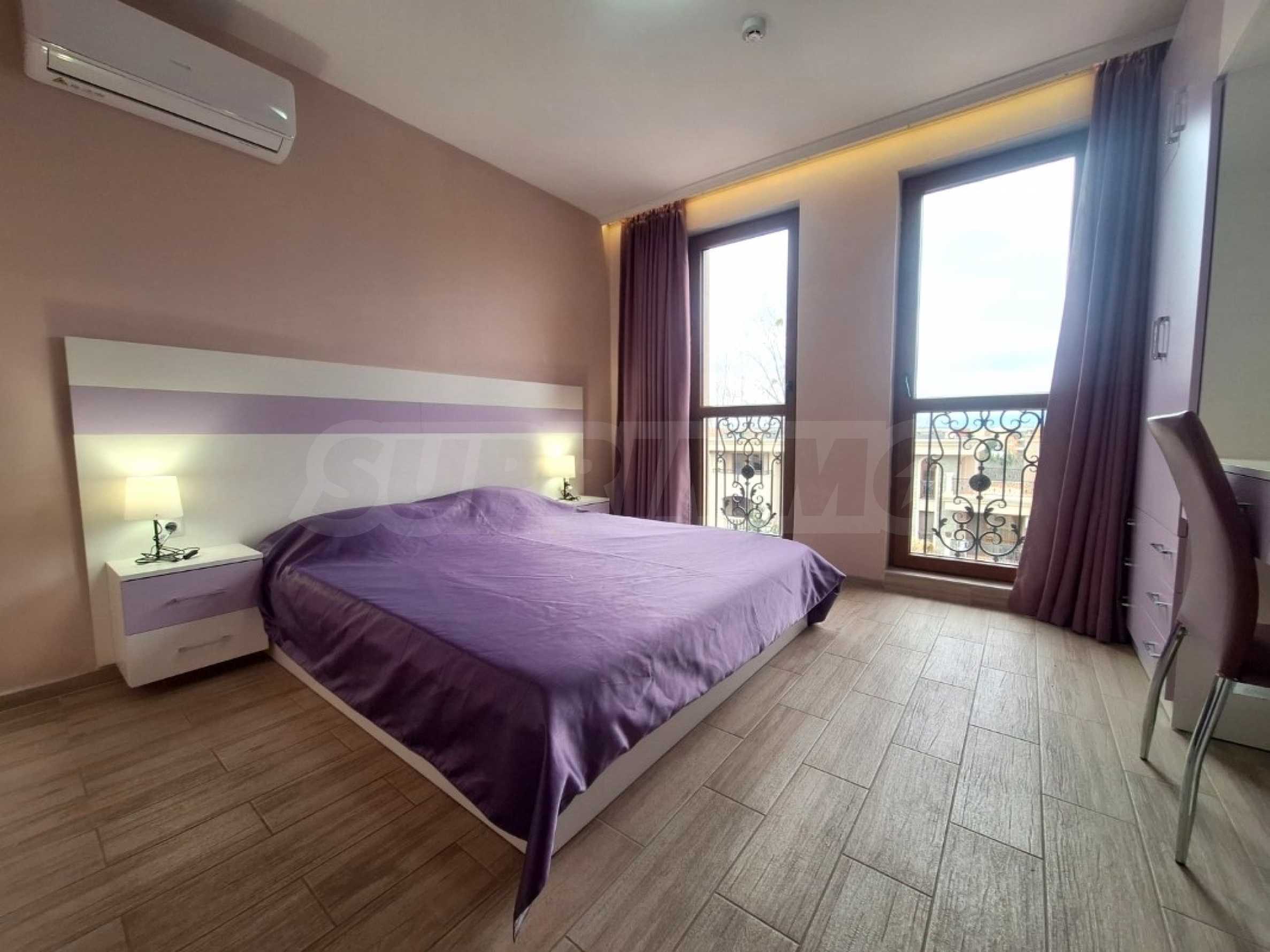 The charming complex is fully completed, put into operation and successfully functioning. Its vision is distinctive - Mediterranean style, with a wonderful pool and garden, with recreation areas and corners for children. The convenient location of the complex in close proximity to the aqua park, bus stops, restaurants, shops, hotels, banks, etc. contributes to the properties being used year-round, and as an attractive investment, with the possibility of generating rental income during the summer season.