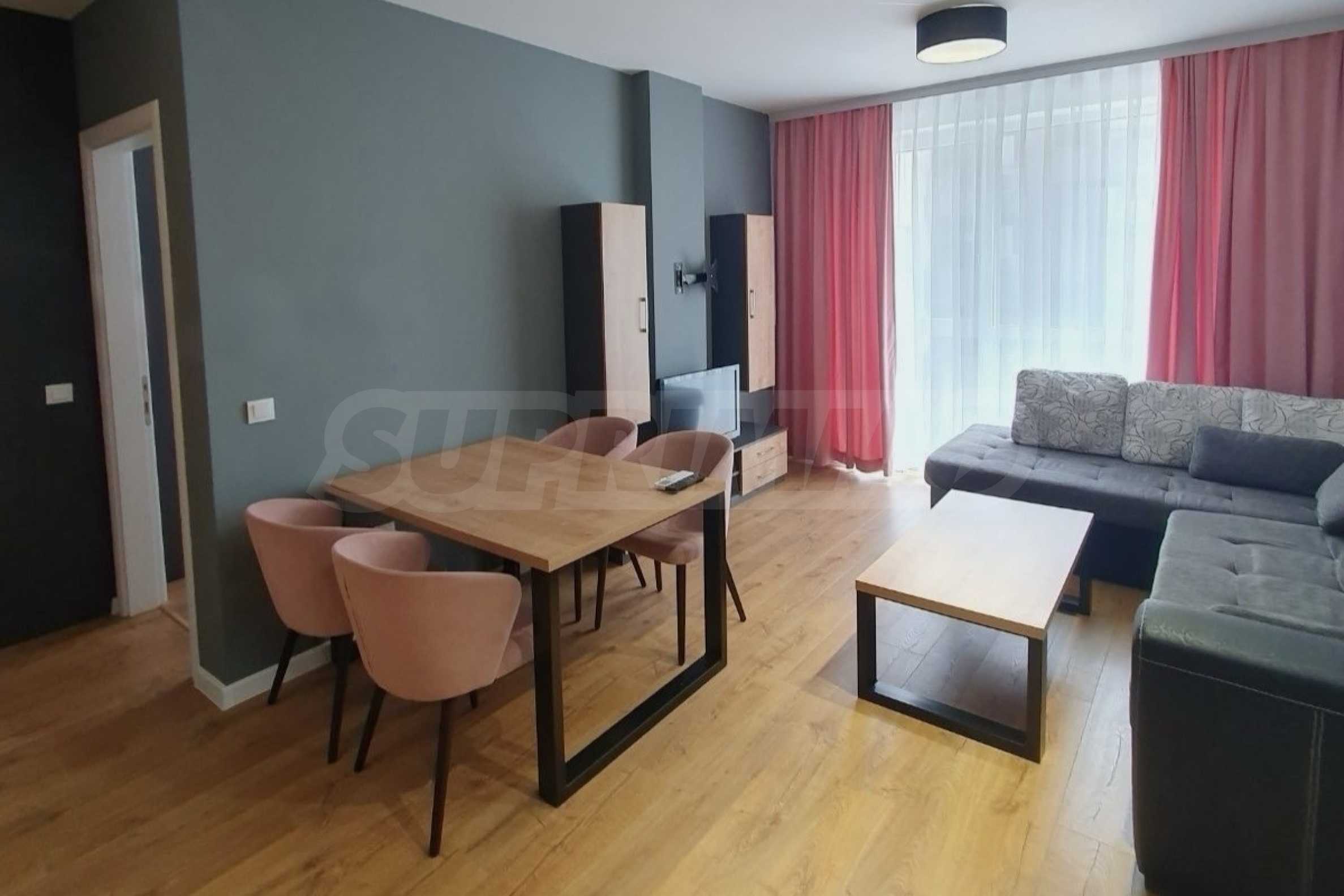 The apartment is fully furnished and equipped with everything needed for a household, and is ready for immediate move-in.