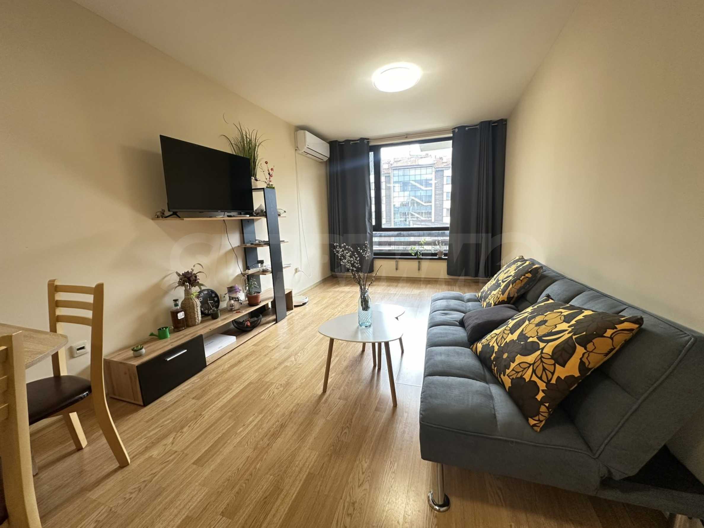• Bright and cozy living room with large windows, creating a feeling of spaciousness and comfort. Furnished with a comfortable sofa bed, coffee table and TV;