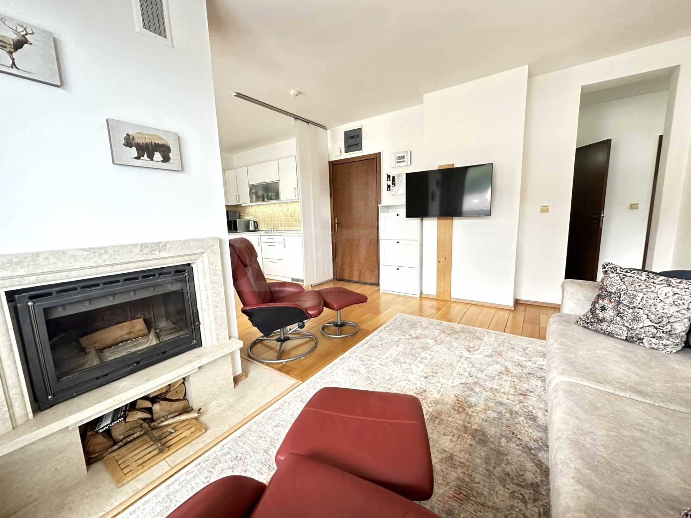 The living room is bright and cozy, with a fireplace, comfortable sofas and a modern kitchen with built-in appliances and a functional kitchen counter. It opens onto a large terrace that wraps around the apartment and reveals an impressive panoramic view of the mountains.