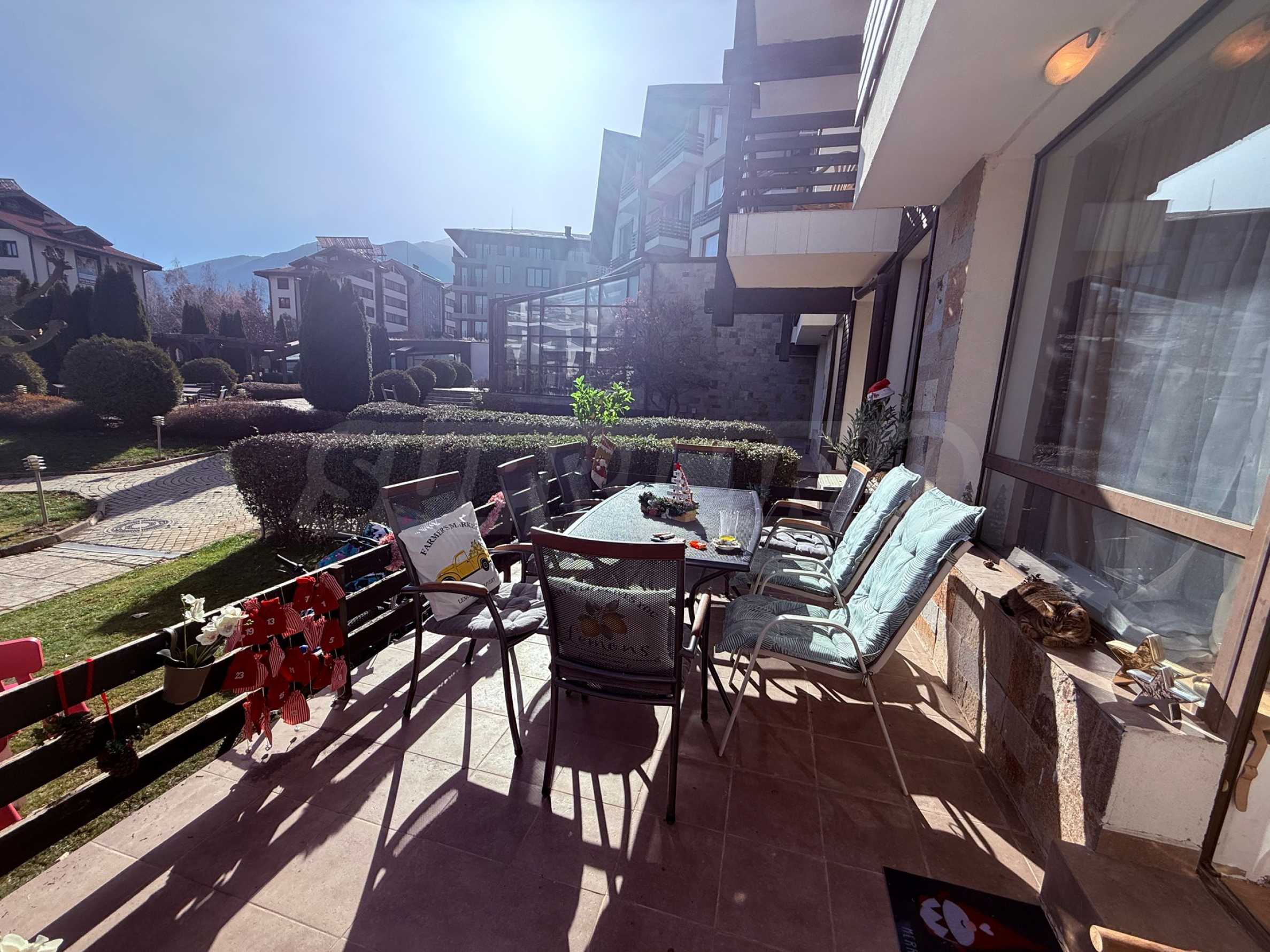 The annual maintenance fee is 13 euros per sq m and includes: maintenance of common areas, indoor and outdoor swimming pool, spa center, fitness center, outdoor parking, 24-hour security, green areas, restaurant.