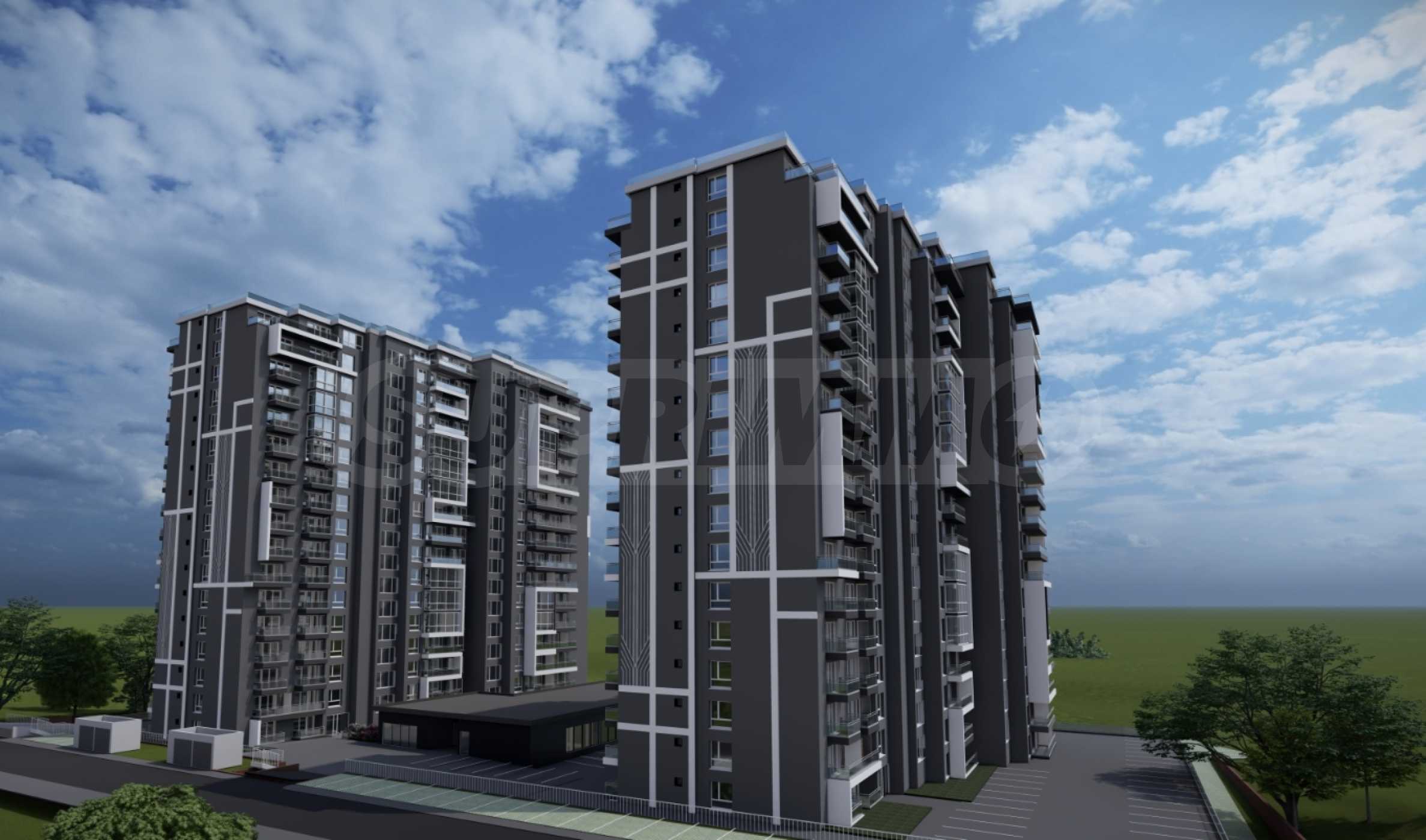 The complex will offer luxuriously finished common areas, a recreational park, retail outlets on the territory and secured parking. It consists of 2 buildings, each with 189 properties and a total of 246 outdoor parking spaces, 67 parking spaces in a covered parking lot, as well as 73 parking spaces in 69 garage cells.