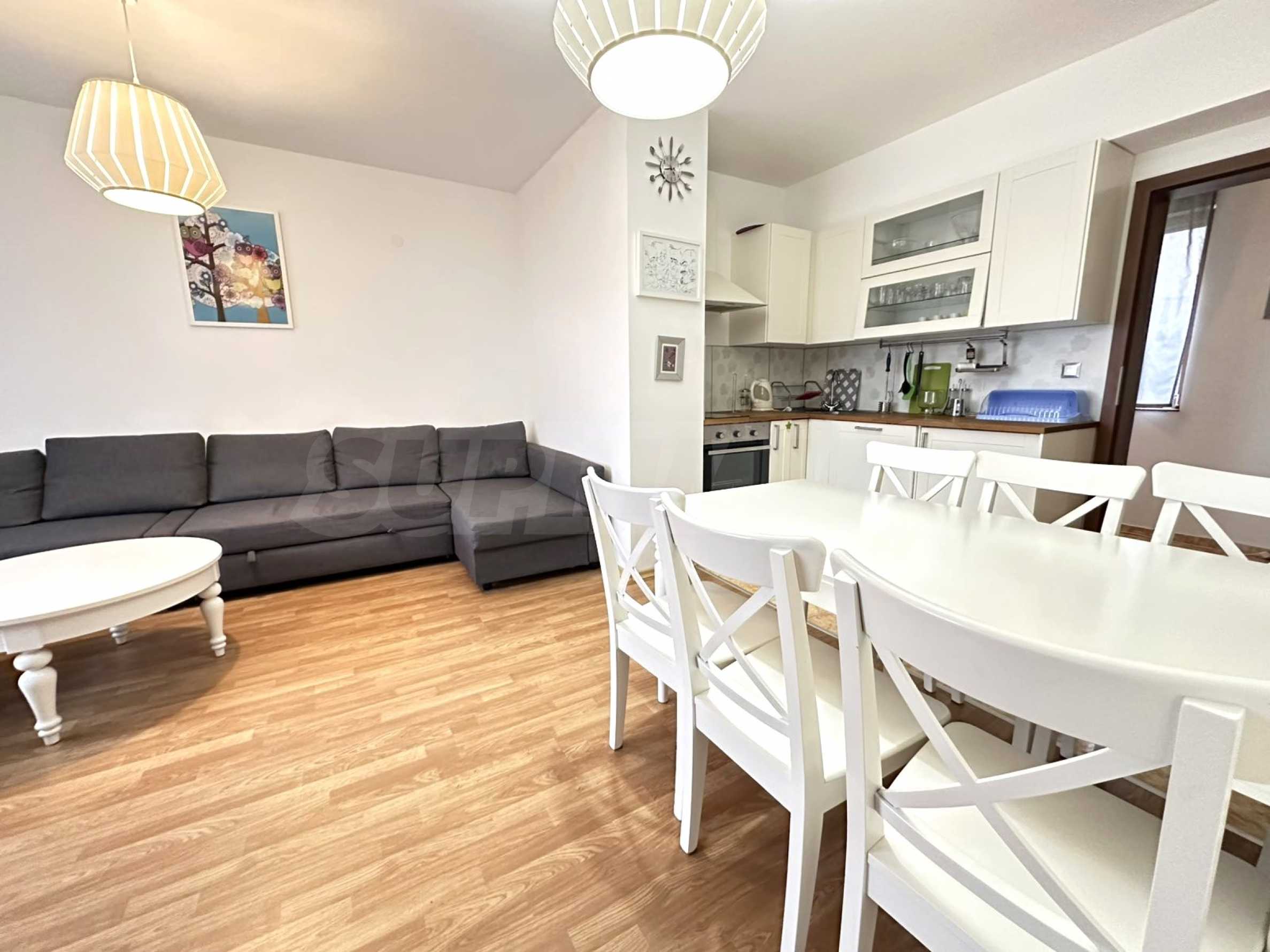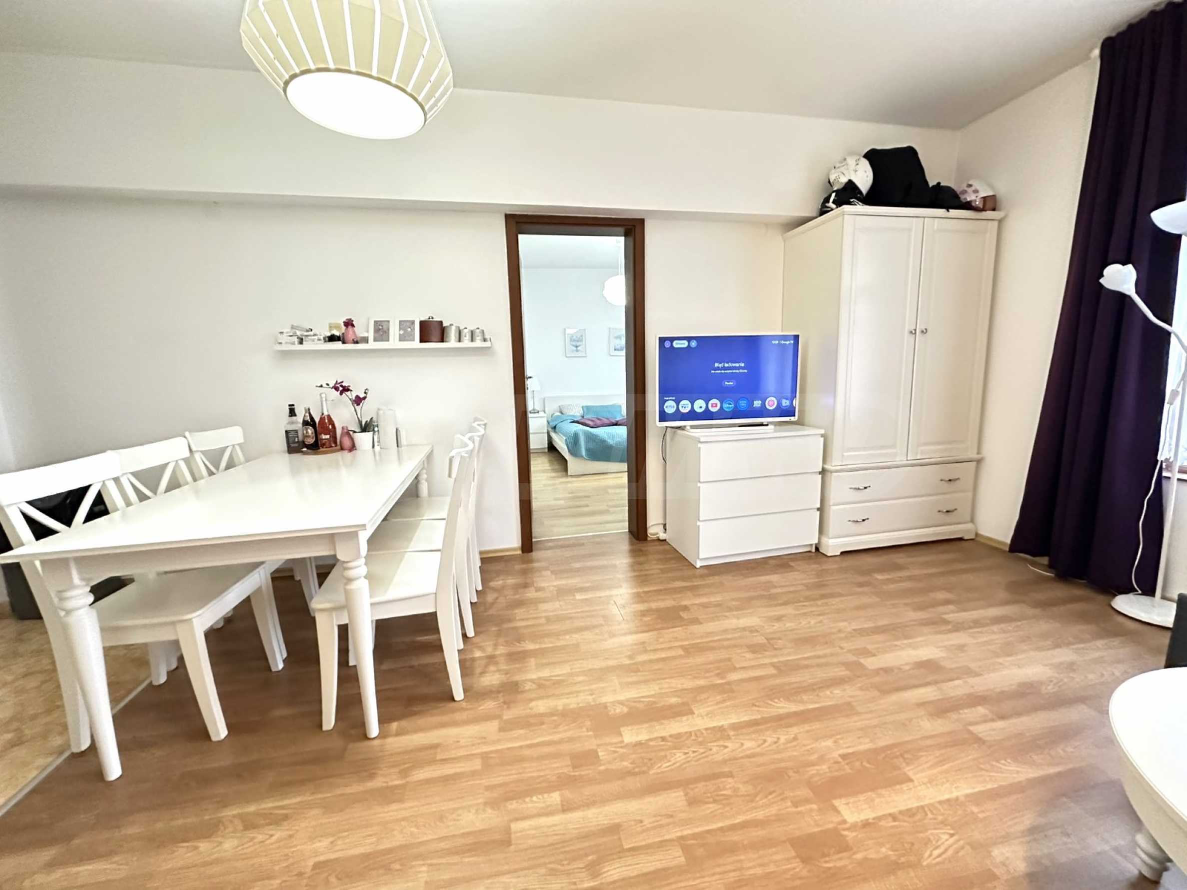 • Spacious living room with separate kitchenette – a bright and wide room, furnished entirely in white and including: kitchen area, dining table, corner sofa, coffee table, wardrobe, TV;