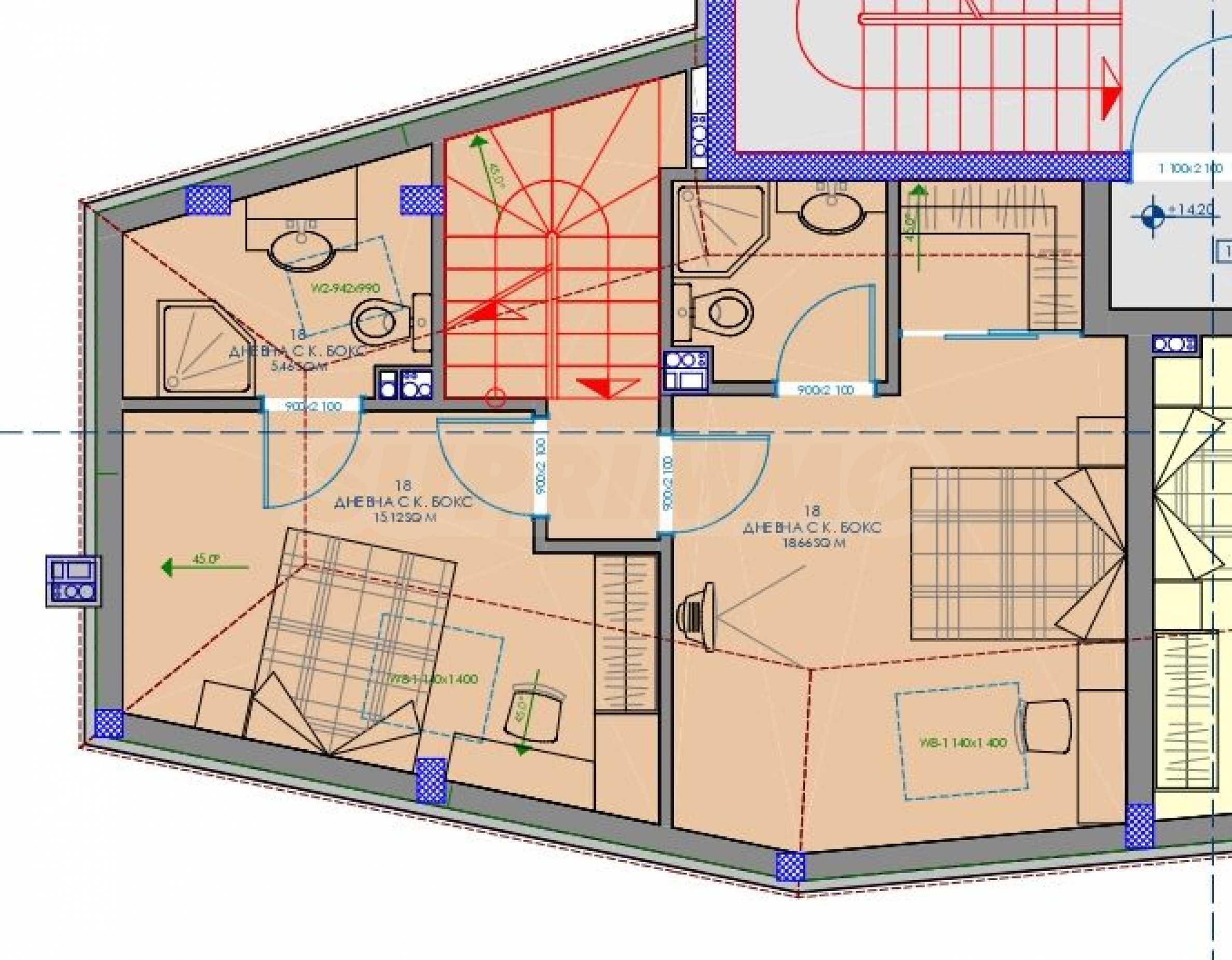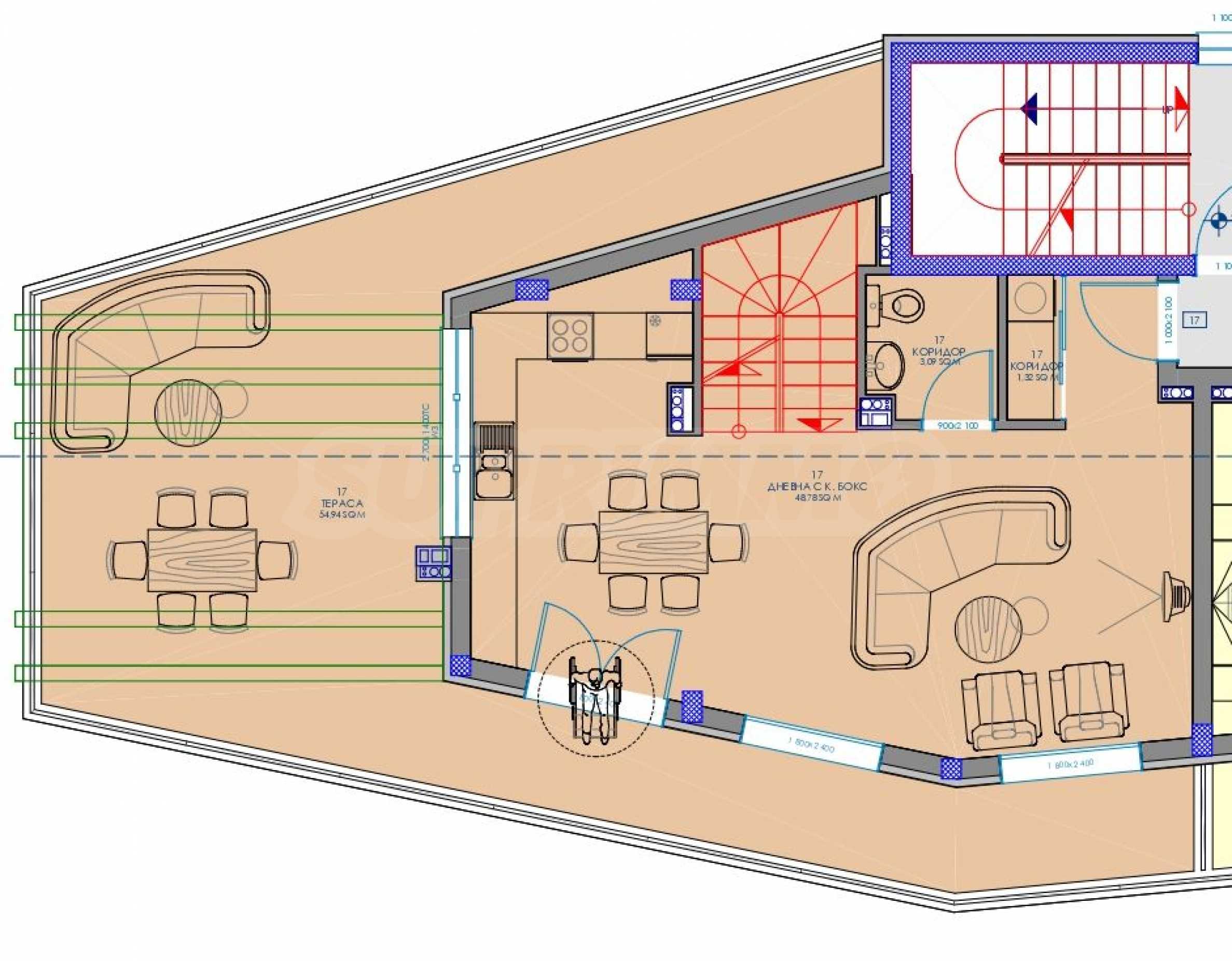 The maisonette is on two levels, located on floors 5 and 6 and has a total area of 154.91 sq m. The living area is 127.81 sq m, the common areas are 27.10 sq m, with a roof terrace with an area of 62.79 sq m and has the following distribution: