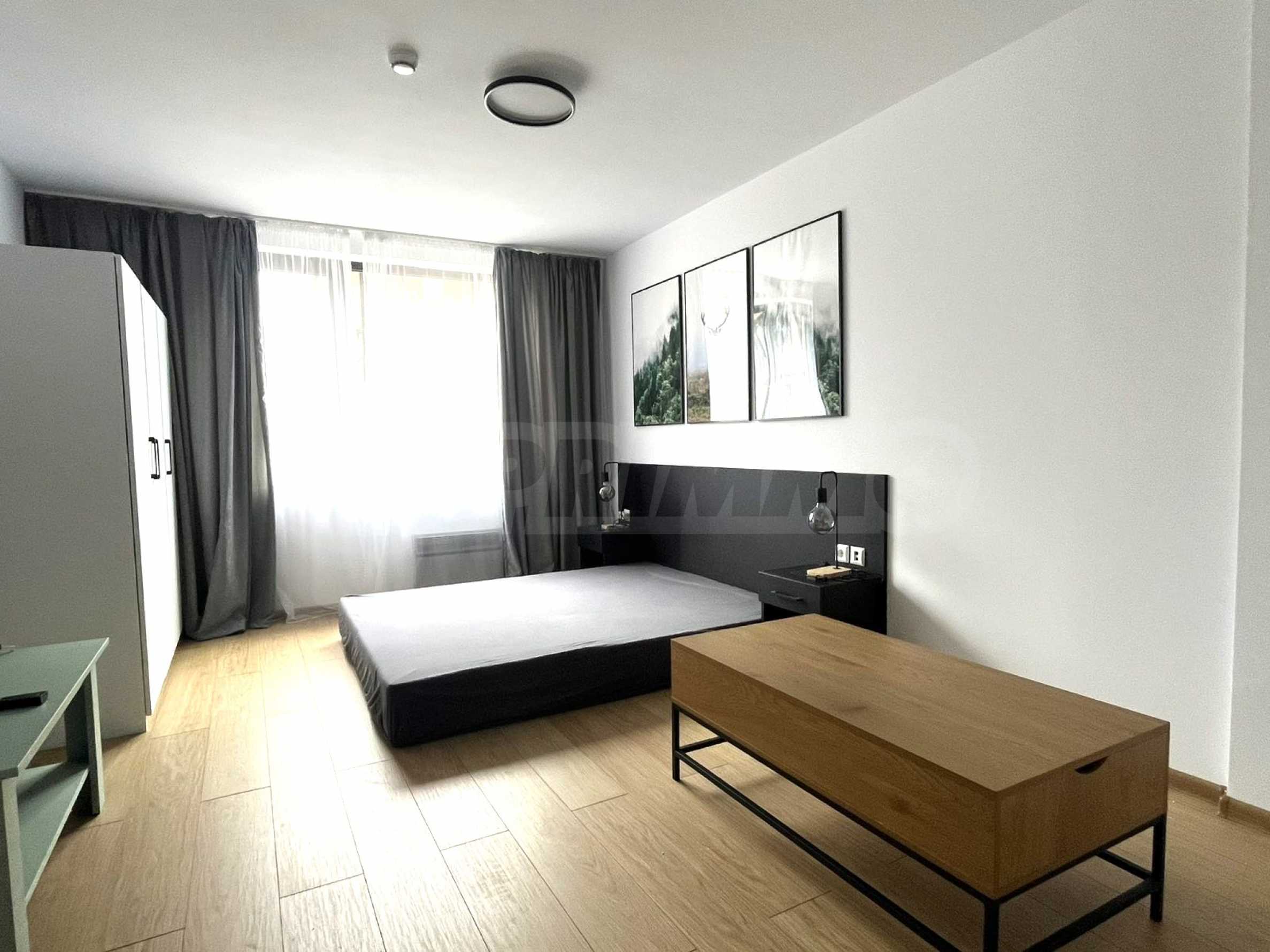 The main room is spacious and bright, designed as a large bedroom with a comfortable bed, bedside tables and a wardrobe, providing ample storage space.