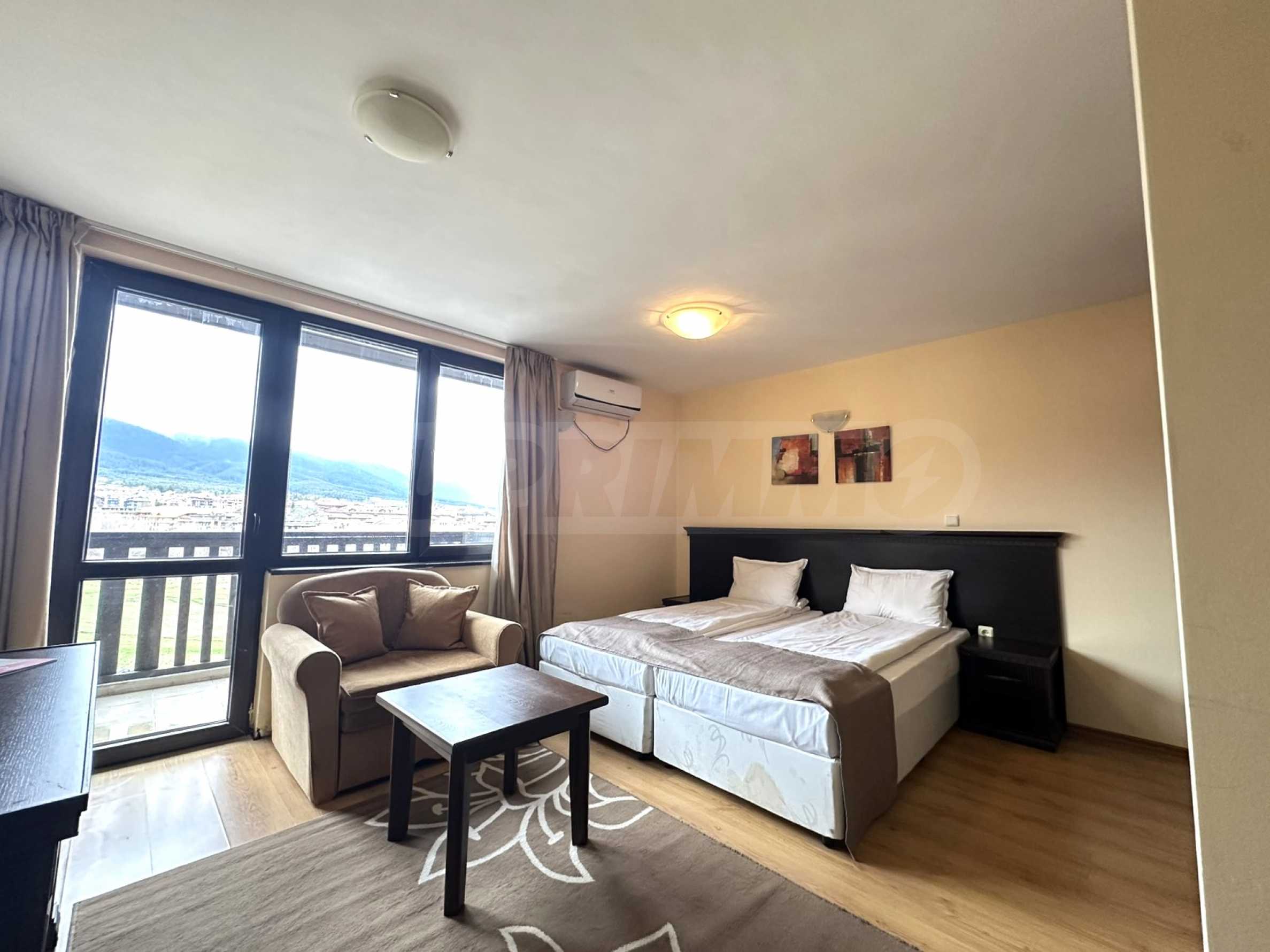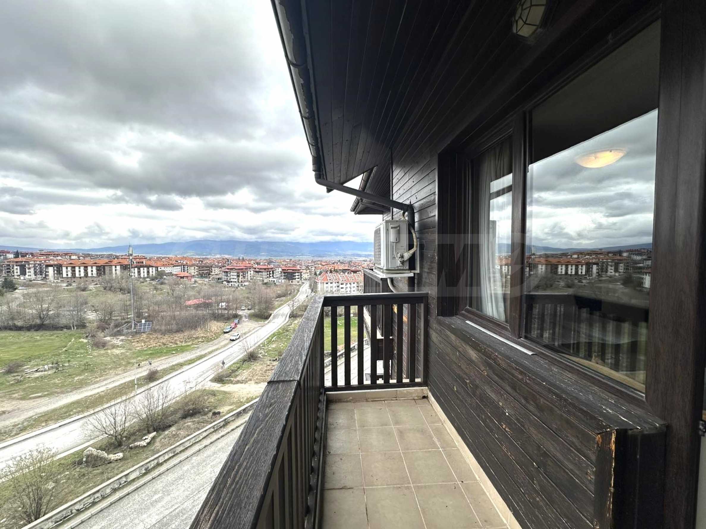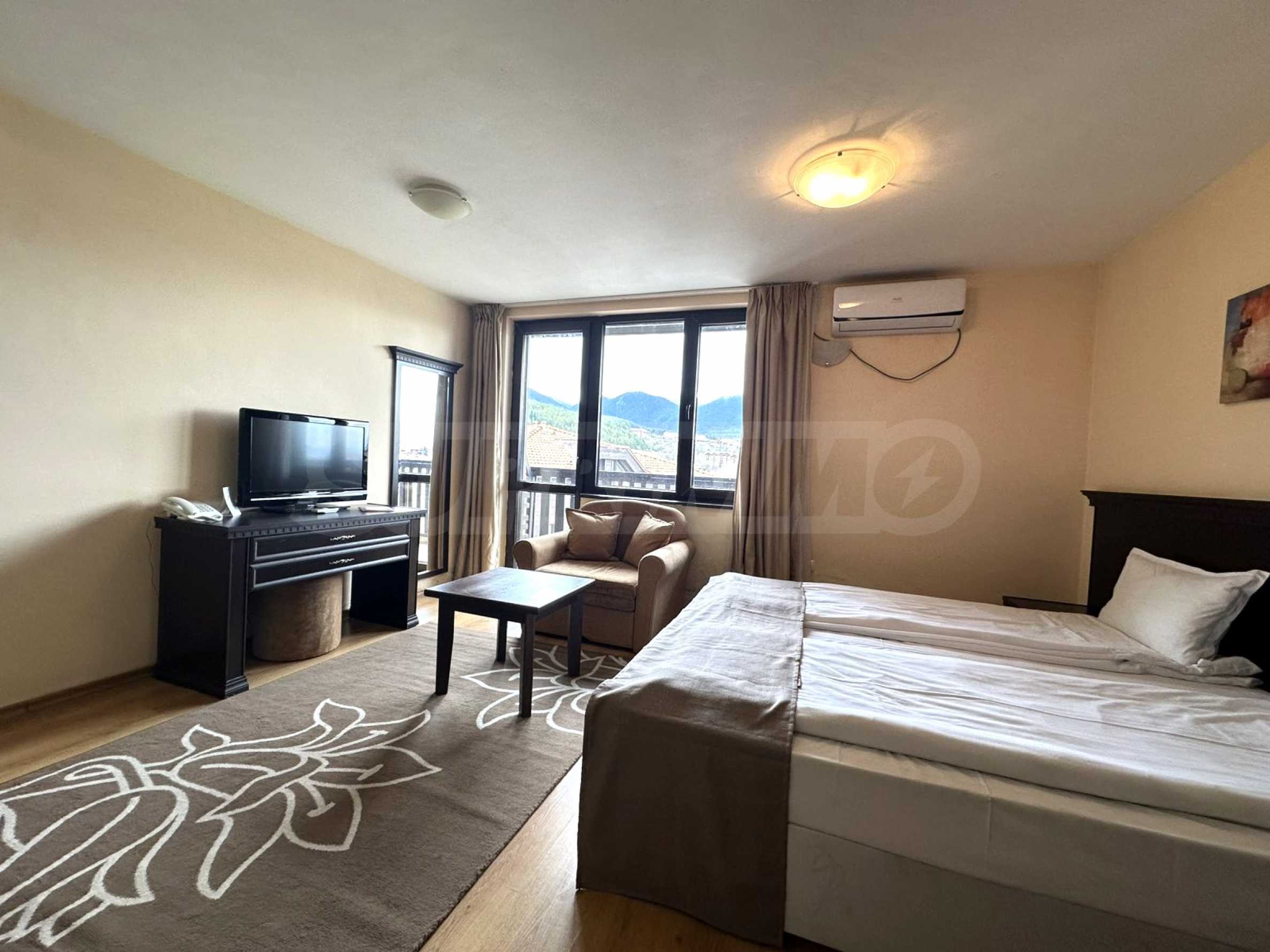 We present a south-facing studio with panoramic mountain views in a hotel complex, just a few minutes from the gondola lift and the ski slopes of Bansko.