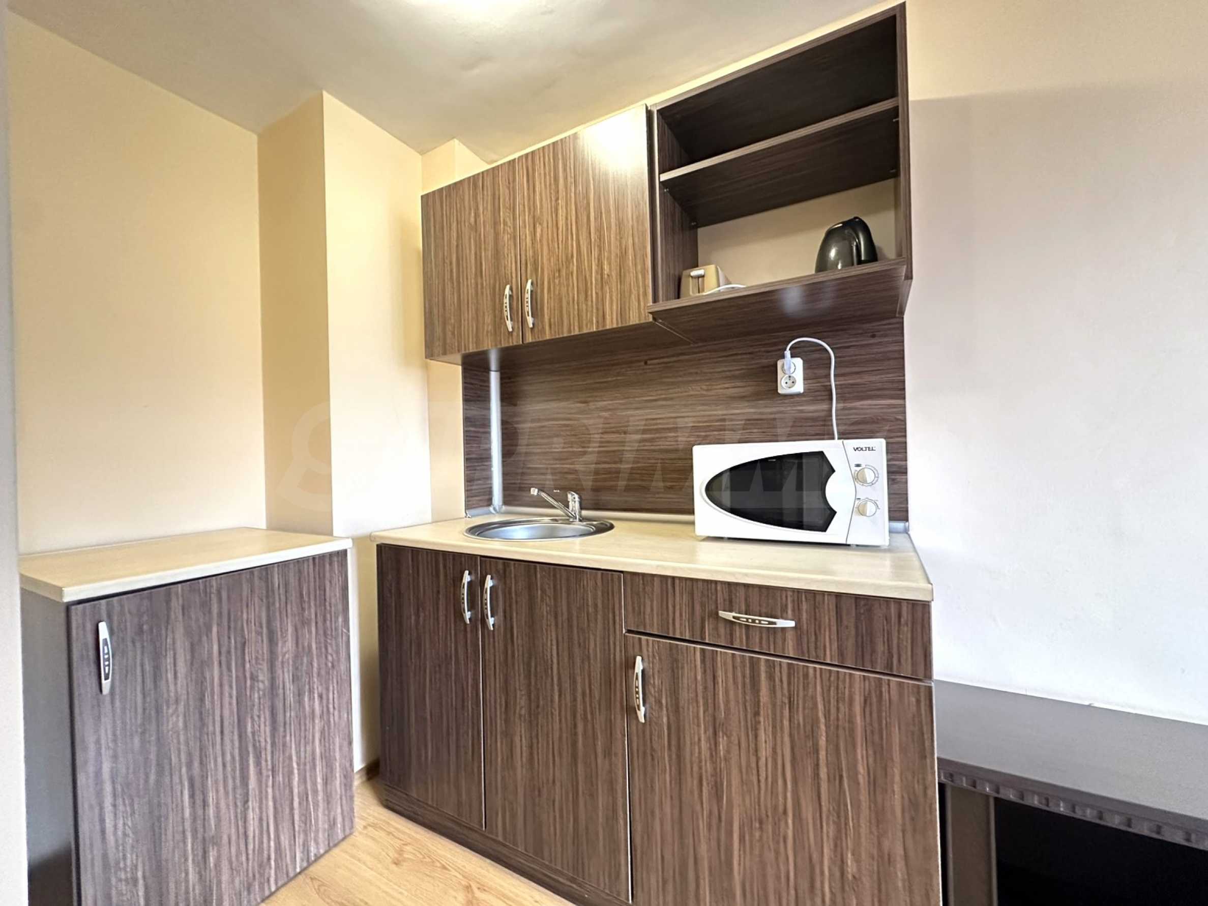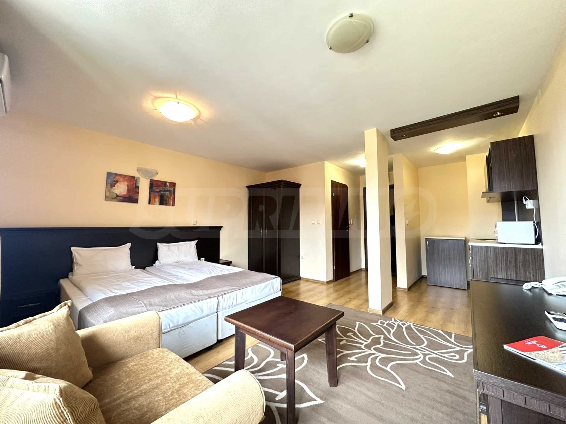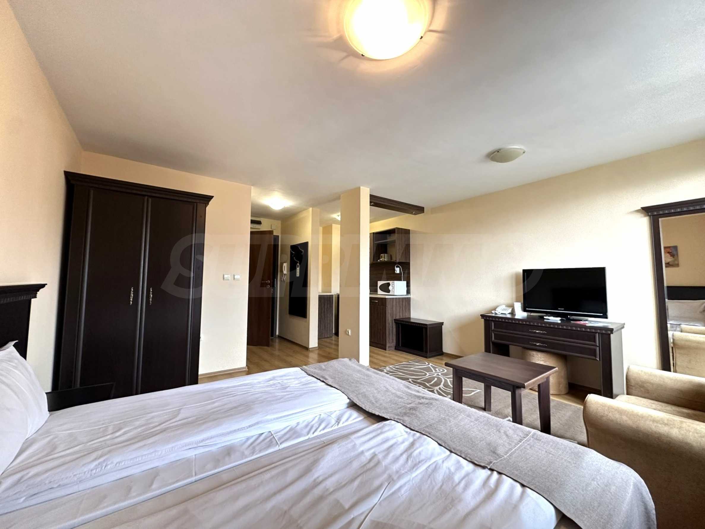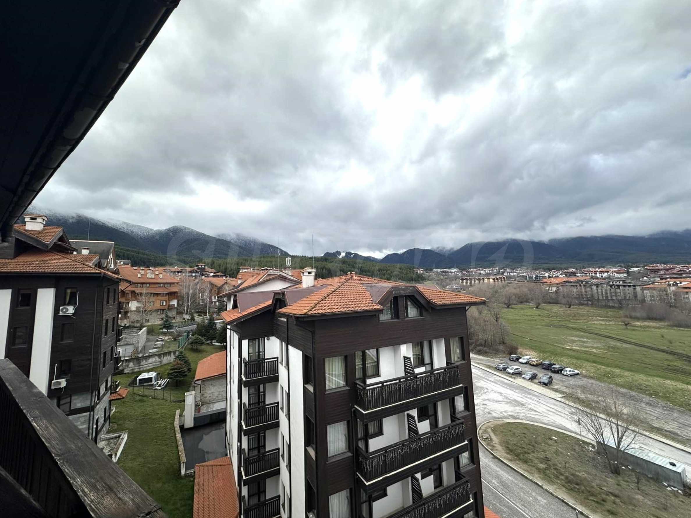We present a south-facing studio with panoramic mountain views in a hotel complex, just a few minutes from the gondola lift and the ski slopes of Bansko.