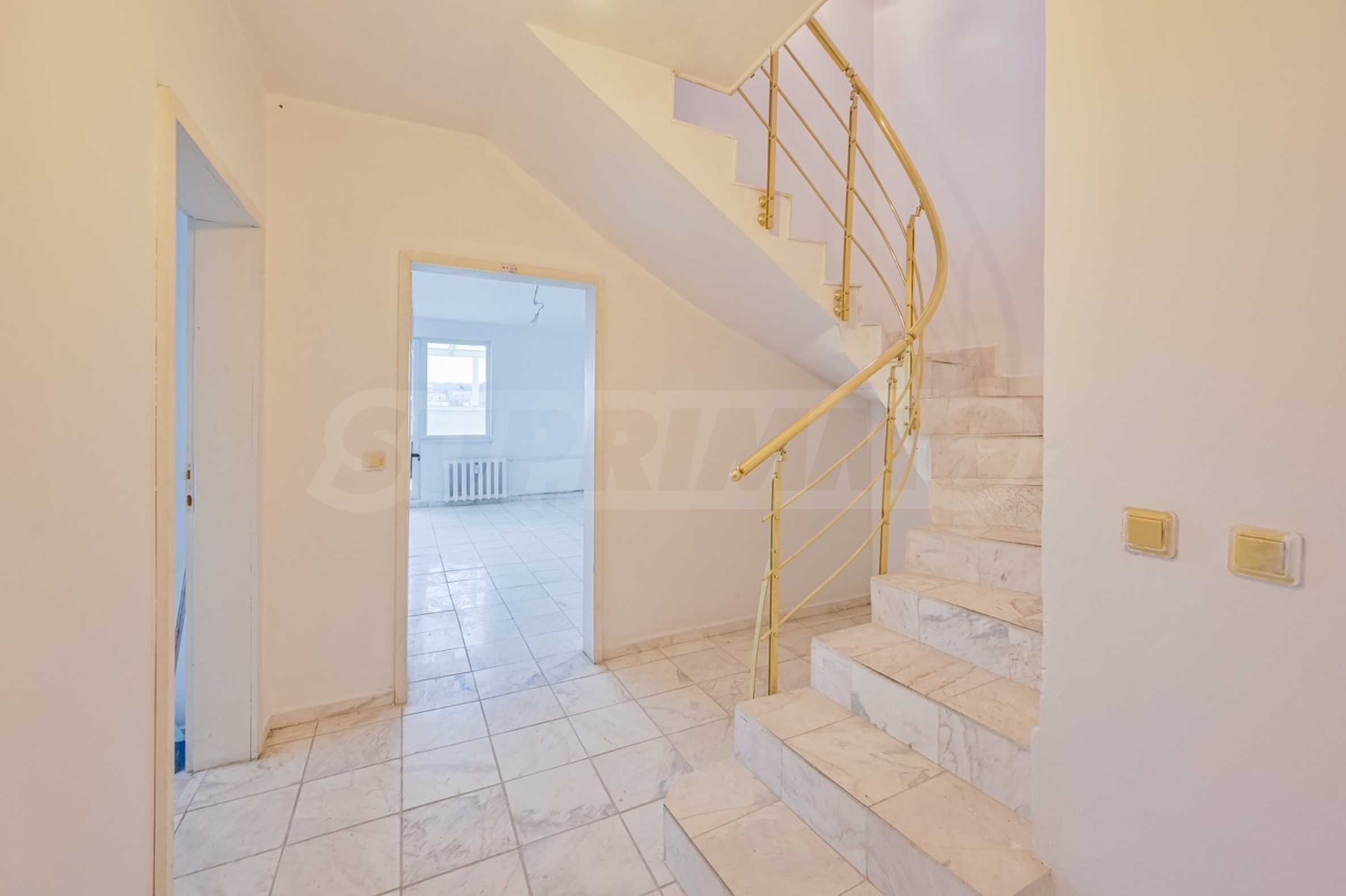 The apartment is located on the top two floors of a monolithic building with well-maintained common areas, two elevators and central heating via CHP. It is distinguished by its functional layout, spacious rooms and an abundance of natural light throughout the day.