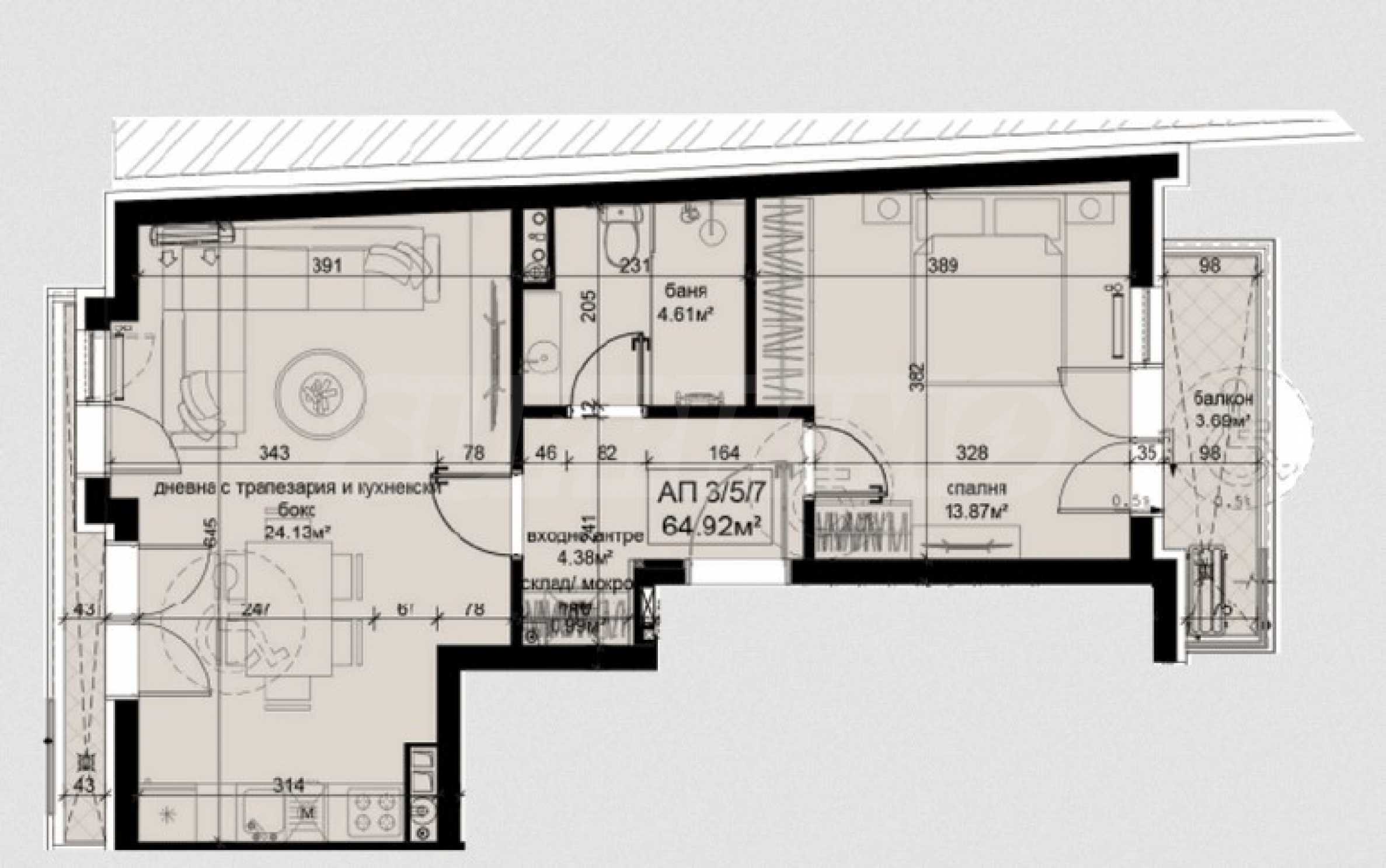 The property is located on the 5th floor and has a total area of 79.42 m2., net area - 64.92 m2.