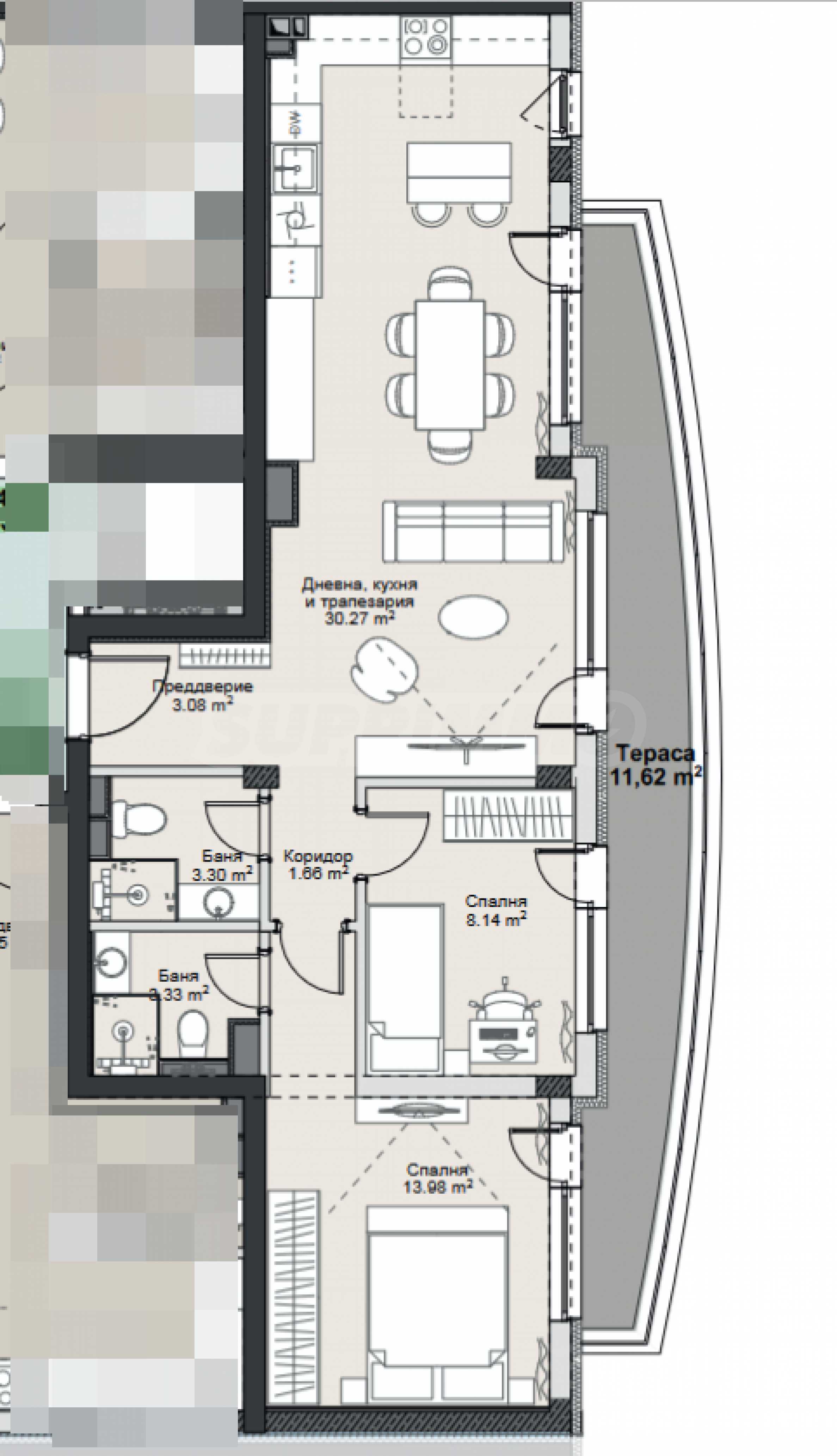 The apartment has a total area of 106.58 m2. and is located on the fourth floor of a five-story building. The layout is comfortable and functional and includes a living room with a kitchen and a dining area, two bedrooms with private bathrooms and a common terrace with access to all rooms. The exposure is southeast.
