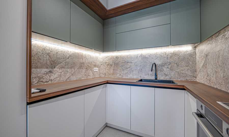 • Kitchenette: cabinets with built-in electrical appliances: refrigerator, dishwasher, extractor hood, oven and ceramic hob; combined washing machine with dryer;