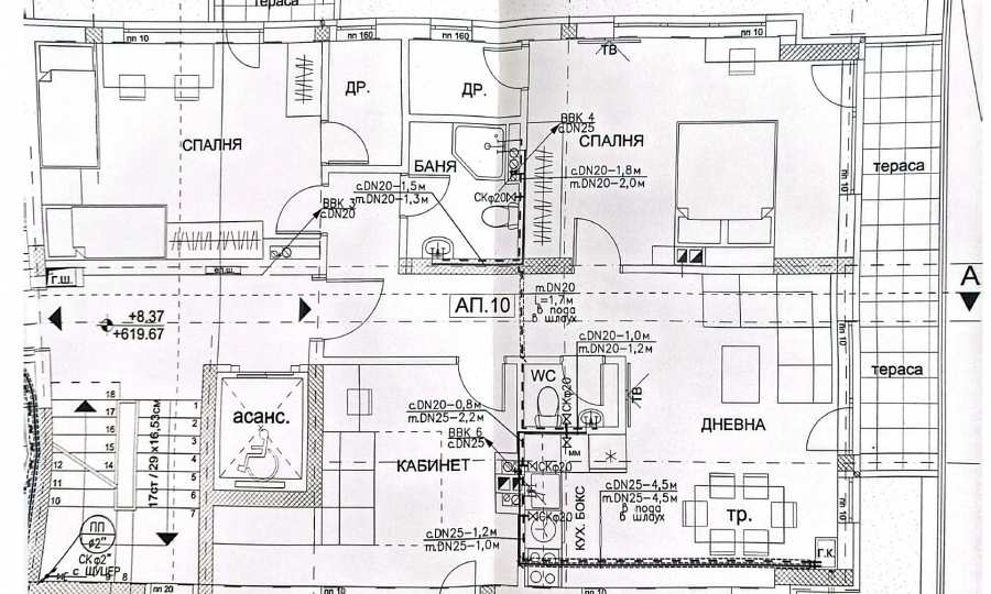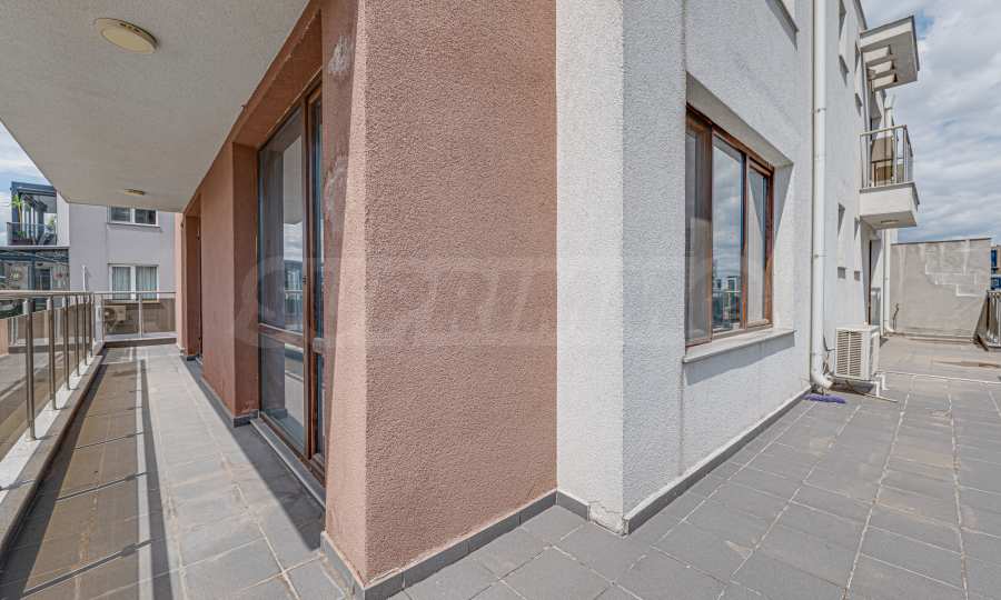 The apartment has a total area of 141.25 sq m and is located on the 4th floor of 6, with an elevator. The apartment has an impressive terrace of 52 sq m, which goes around the entire property and has access from every room. It is outside the total area and is described in the property documents.