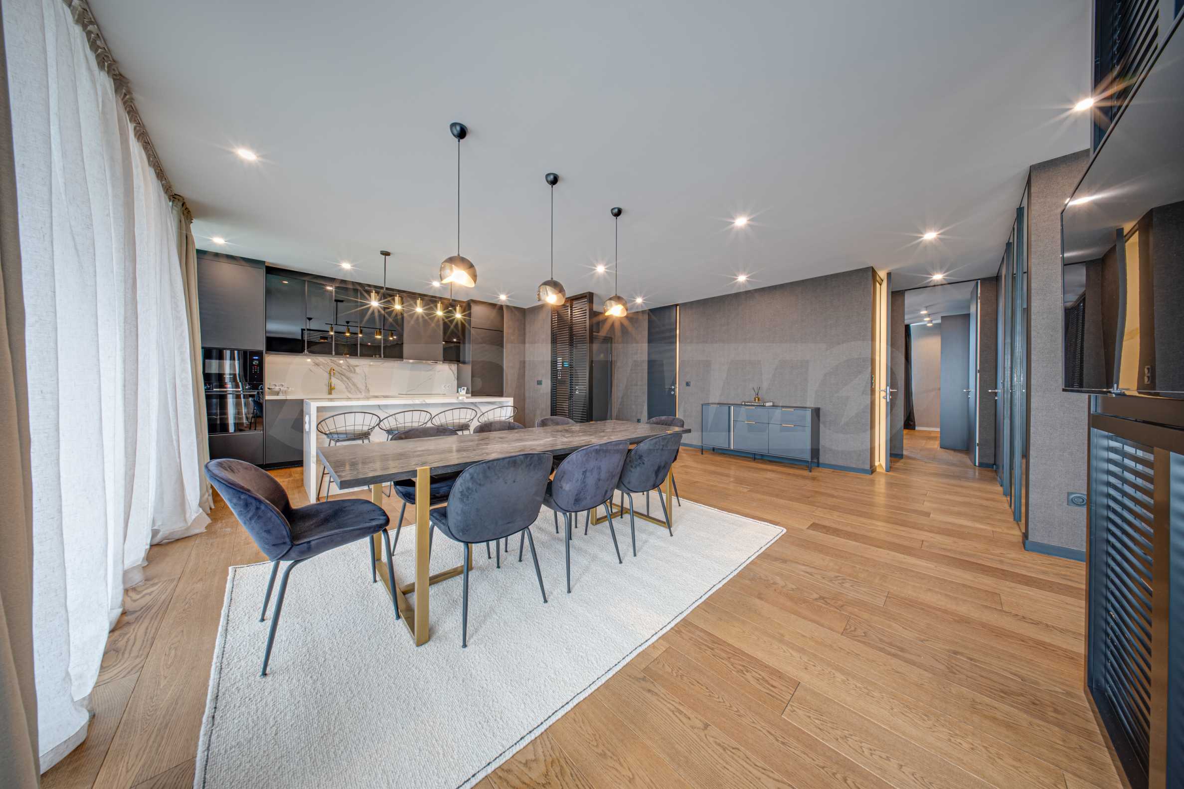 • elegant living room with kitchen and dining area;