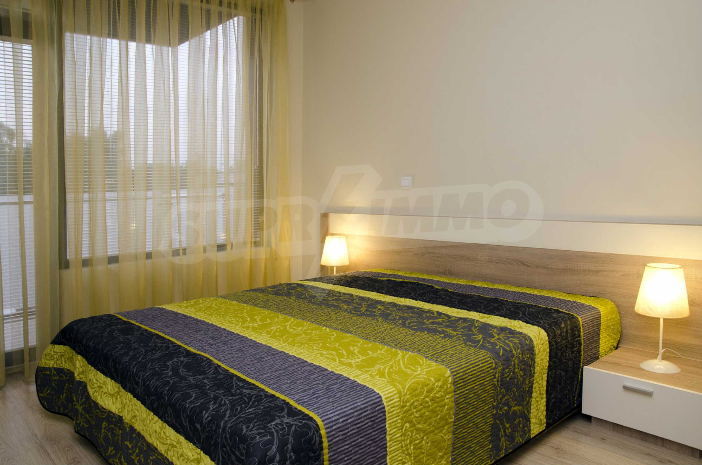 The offered dwelling is located on the third floor of the 8-storey building (2006) and features south/northern exposure and a total area of 120.56 sq.m. (the net area is 103.67 sq.m.). It consists of a kitchen with a living room on one premise, two bedrooms, a bathroom with WC, and two balconies. The rooms are finished with laminate flooring laminate, painted walls, PVC windows, brand new furniture, and complete kitchen equipment. The complex has a free outdoor parking area.