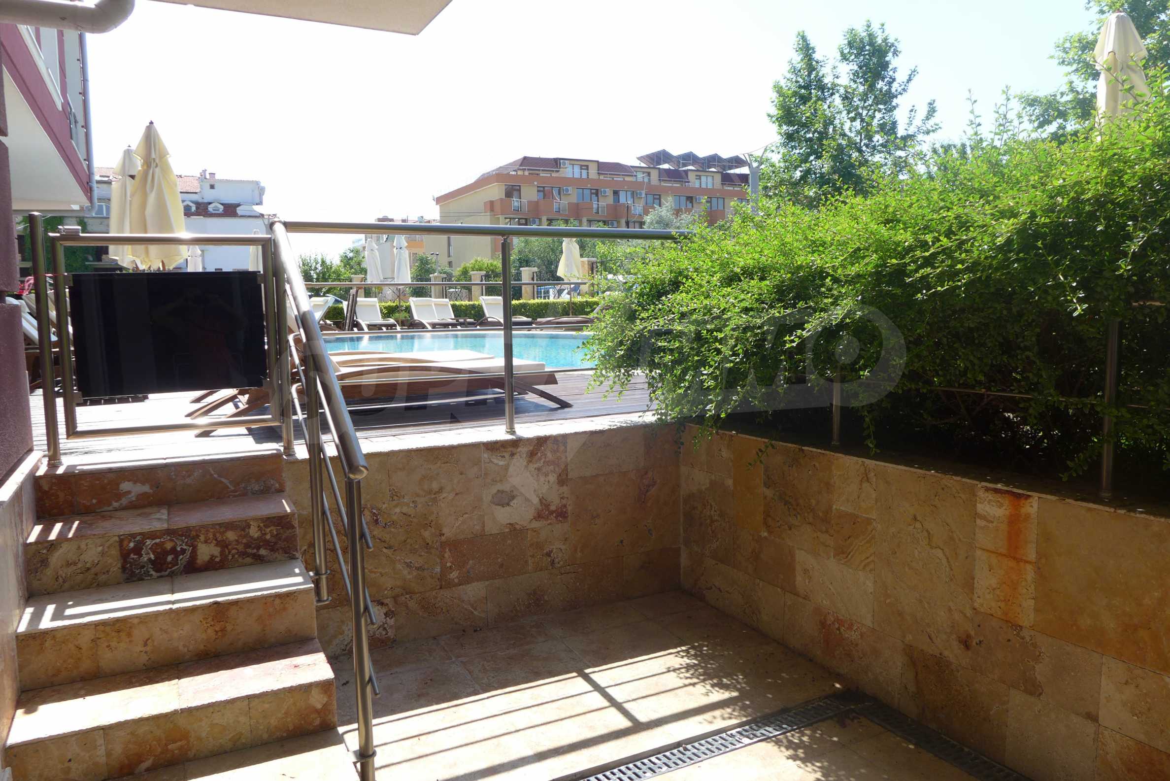 The property has air-conditioners. Laminate flooring, painted walls, tiled flooring and upvc window frames are available in the property. There is a washing machine in the apartment. The property is connected to electricity, water and communal sewage system. Some of the other available facilities that you will certainly consider important include: a balcony, a bathroom with toilet, a parking space, a lift, a swimming pool, a cable tv, internet and a telephone line. From the inside you will be able to enjoy wonderful town views. There is a bonus - a garden terrace with a size of 21 sq.m. with a exit to the swimming pool.