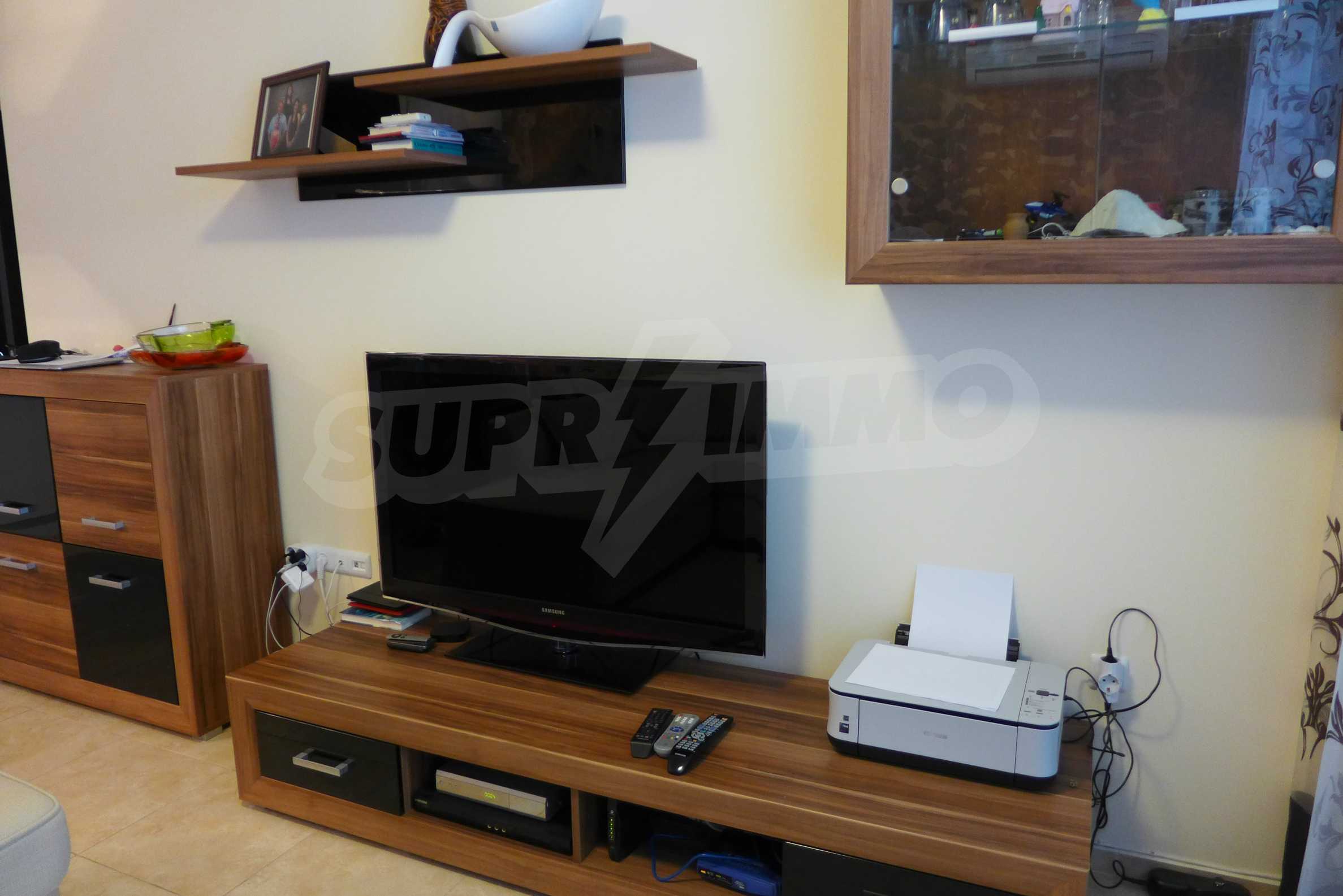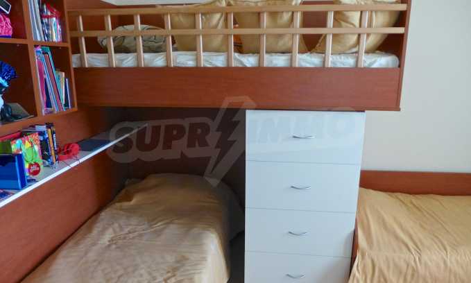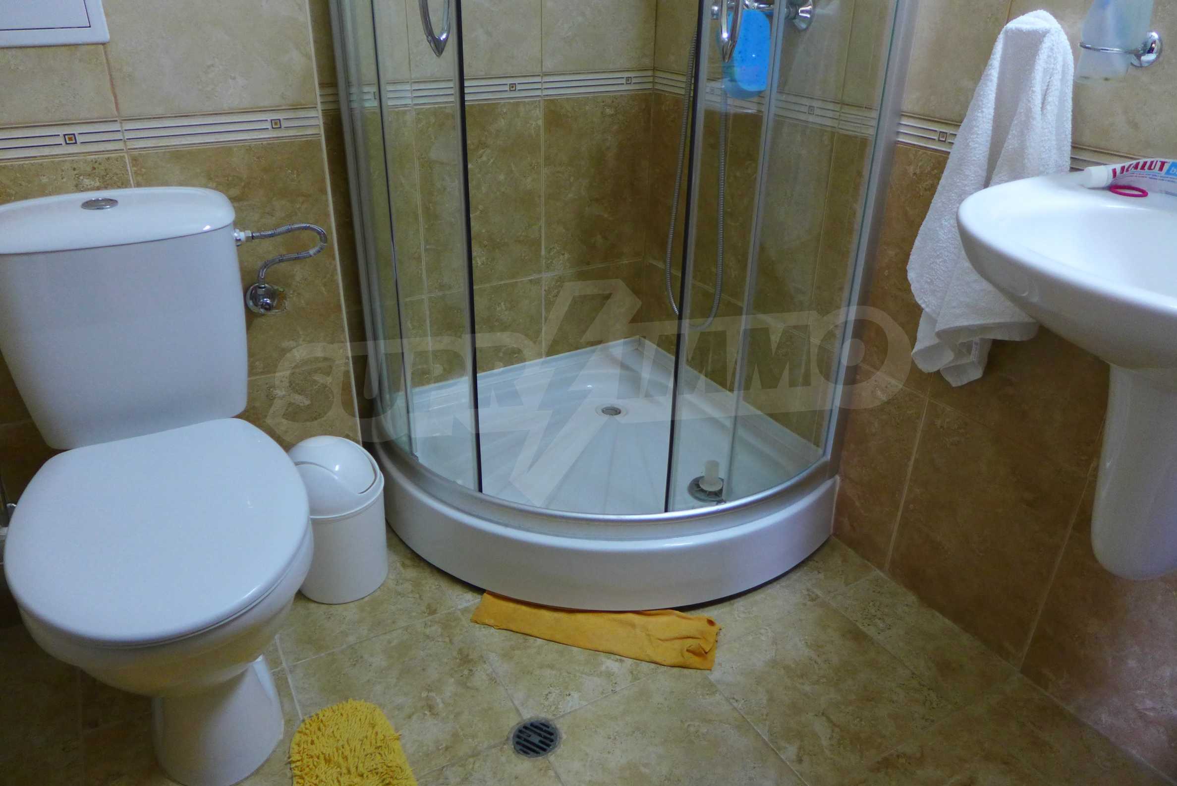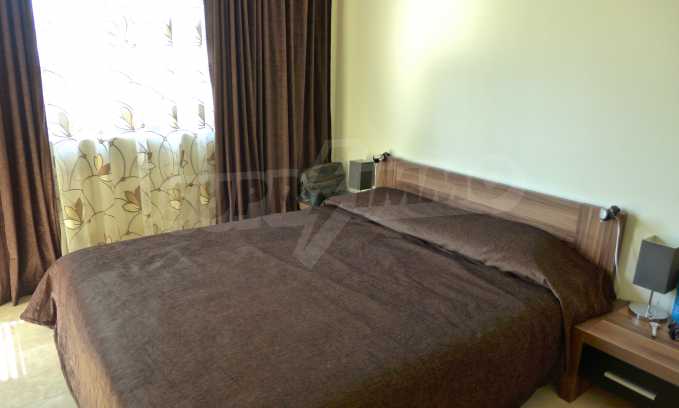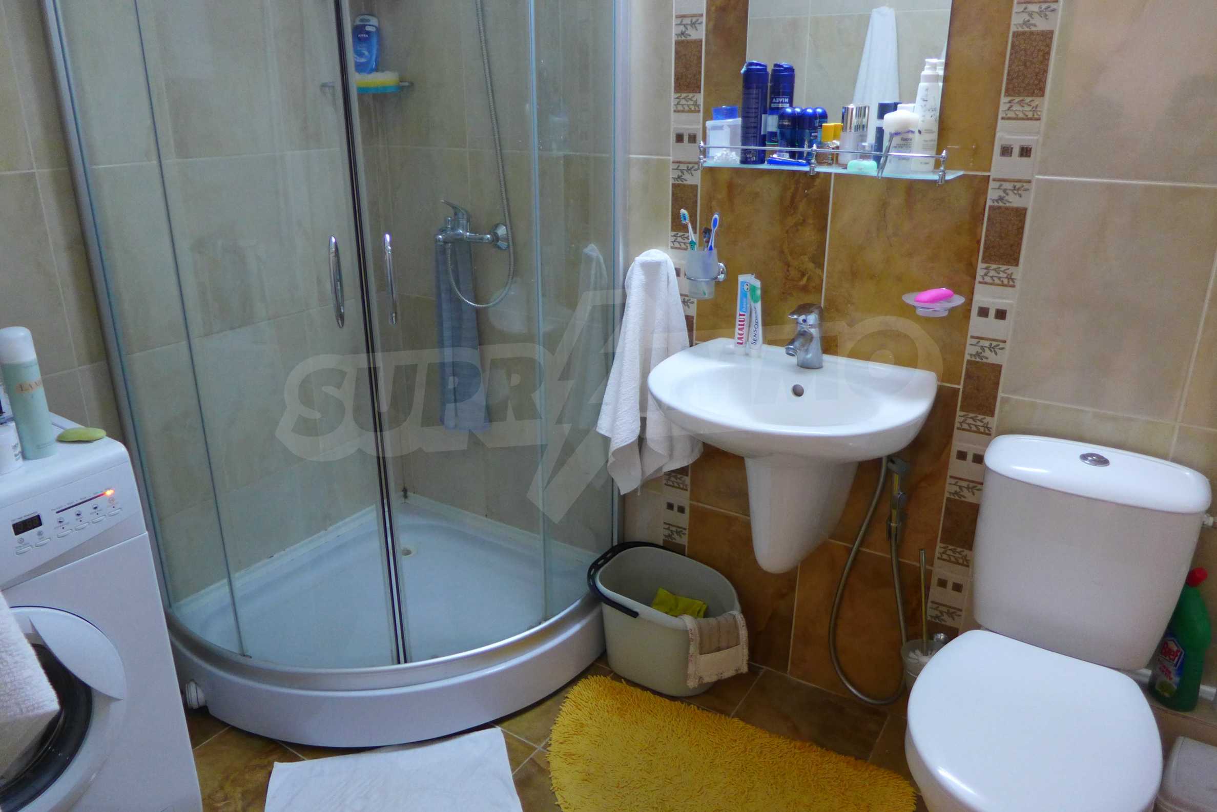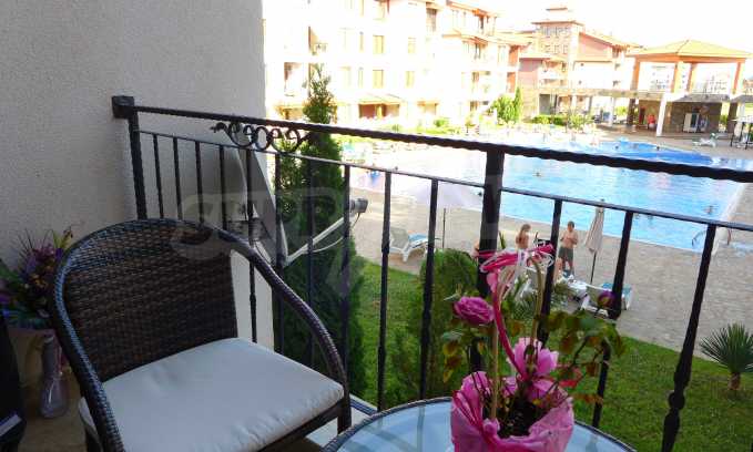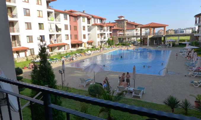 The described holiday home is located on the second floor with an area of 95 sq.m., divided between a living room with kitchenette, two bedrooms, two bathrooms with WC and two balconies (one overlooking the swimming pool in the complex, and the other - the mountains). The flooring is tiled, the walls painted and the windows are PVC. The complete furniture and equipment can be viewed in the photos. The annual maintenance fee is 600 euros per year.