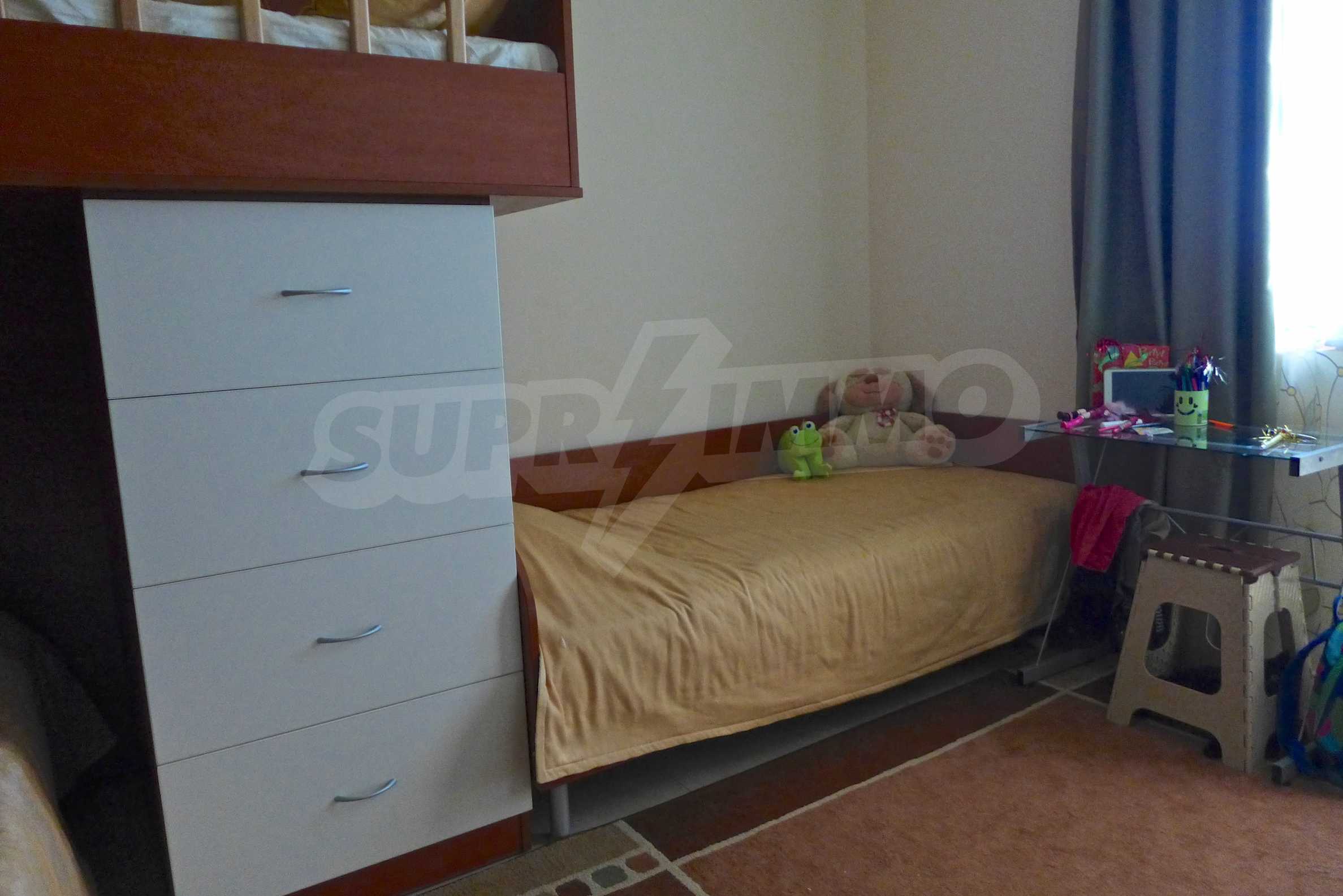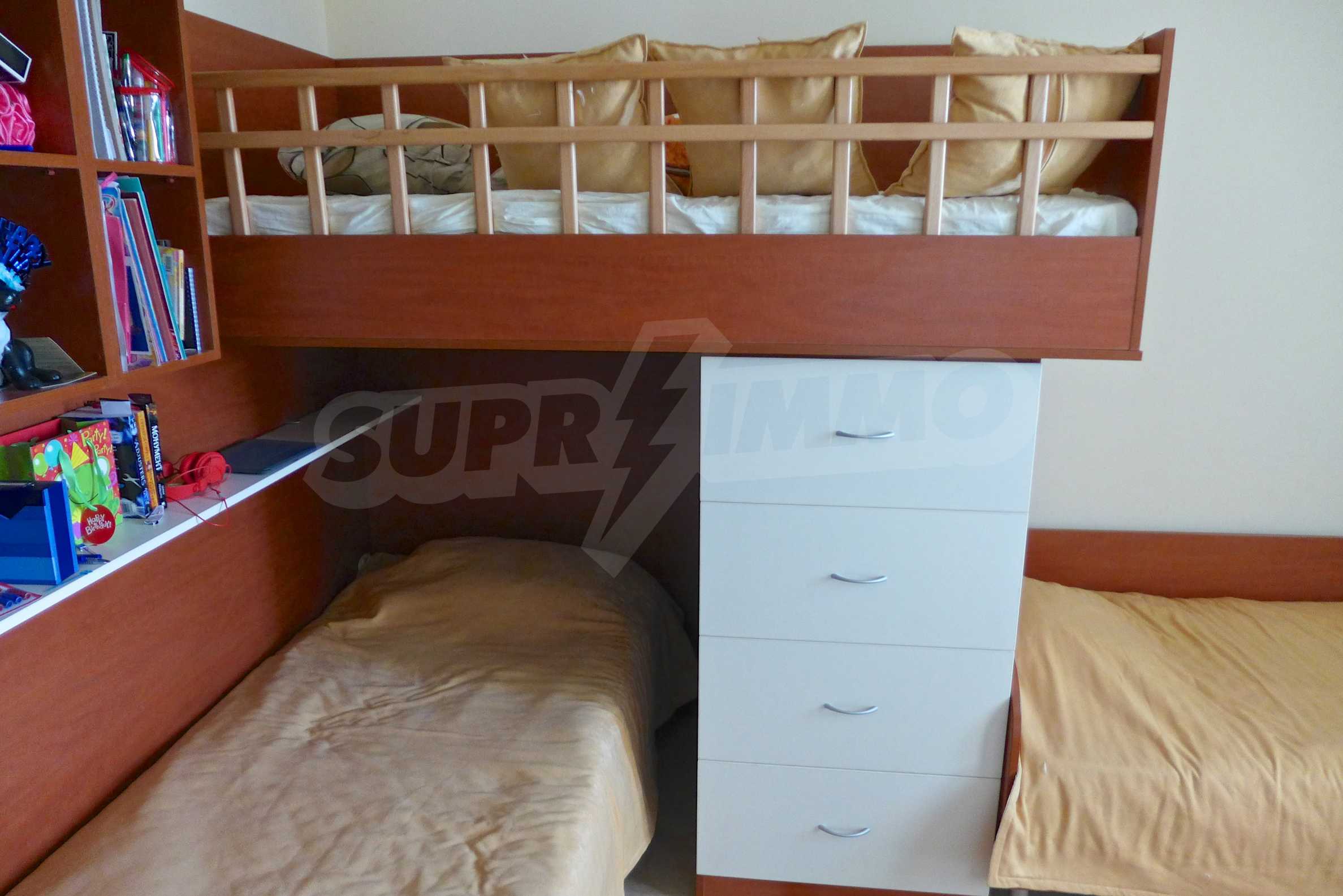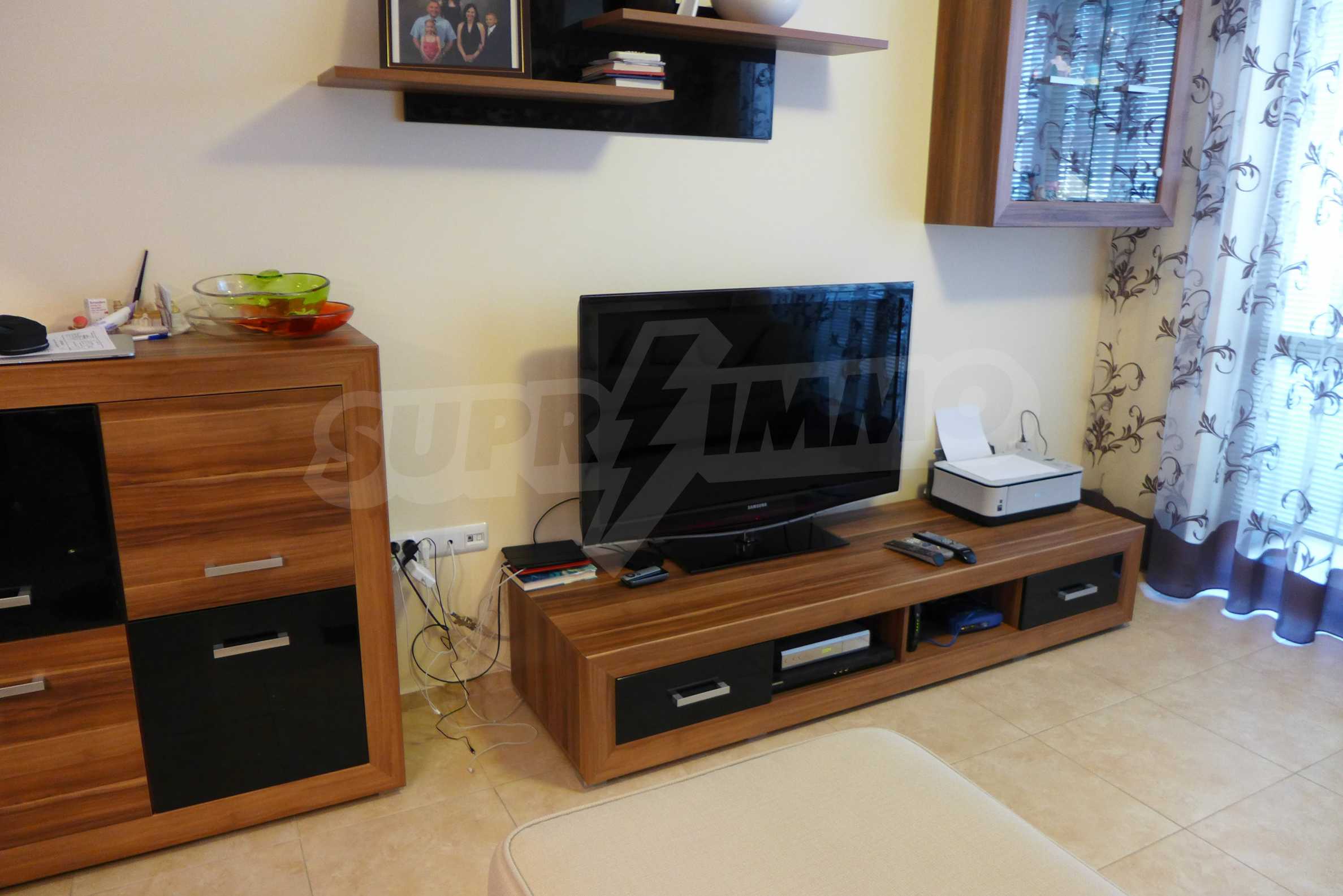 The described holiday home is located on the second floor with an area of 95 sq.m., divided between a living room with kitchenette, two bedrooms, two bathrooms with WC and two balconies (one overlooking the swimming pool in the complex, and the other - the mountains). The flooring is tiled, the walls painted and the windows are PVC. The complete furniture and equipment can be viewed in the photos. The annual maintenance fee is 600 euros per year.