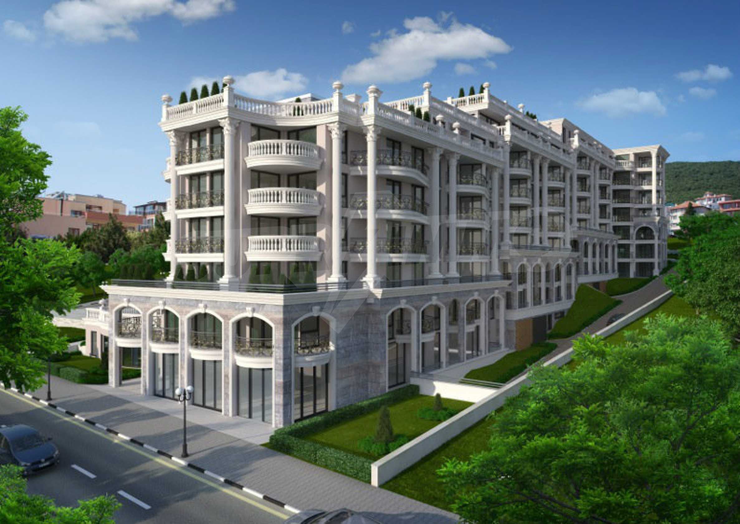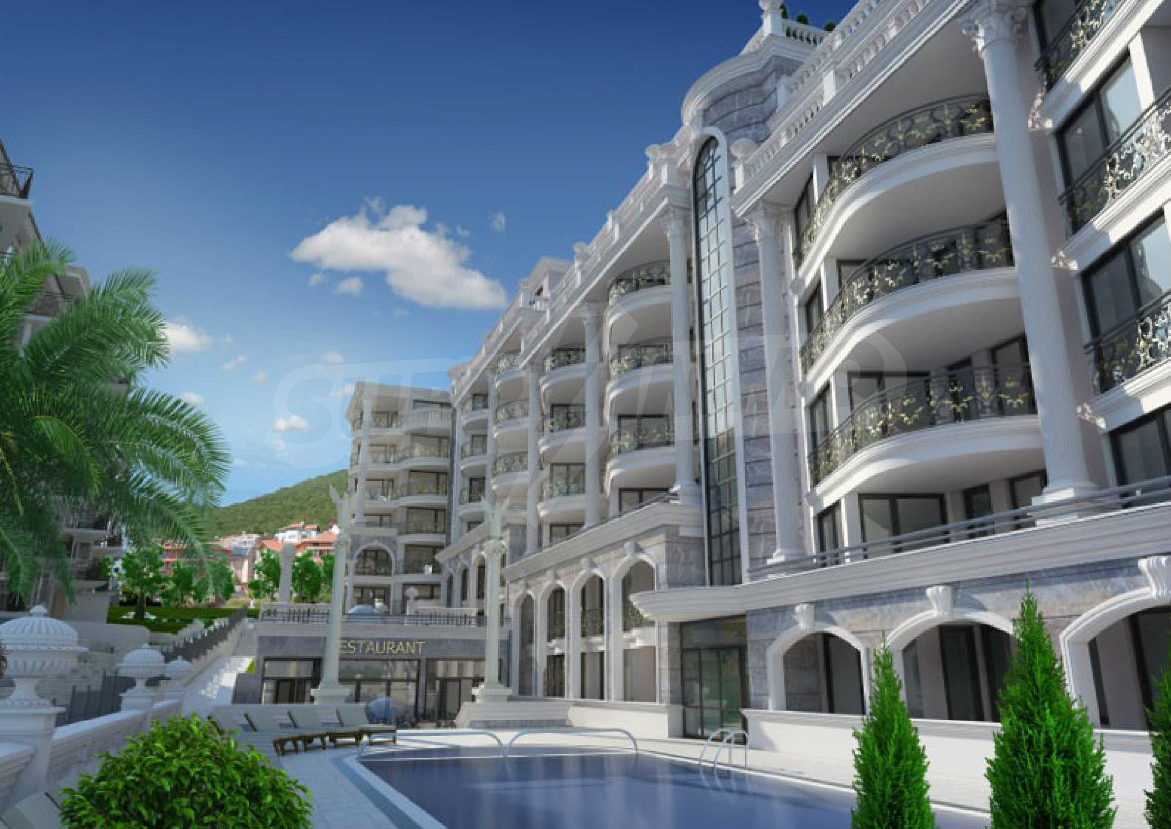 All 28 complexes from the group are located on the coast, near the beach, being about 12 minutes away from each other. Almost all are located next to each other and form a distinct region with complete infrastructure, own streets, gardens and recreation areas, swimming pools, four fitness clubs, beauty salons, eight supermarkets, and an amphitheater with free kids entertainment every Sunday evening, plus courses in various sports. Nearby is also set the marina and the casino and the 5 star spa center "Victoria Spa".