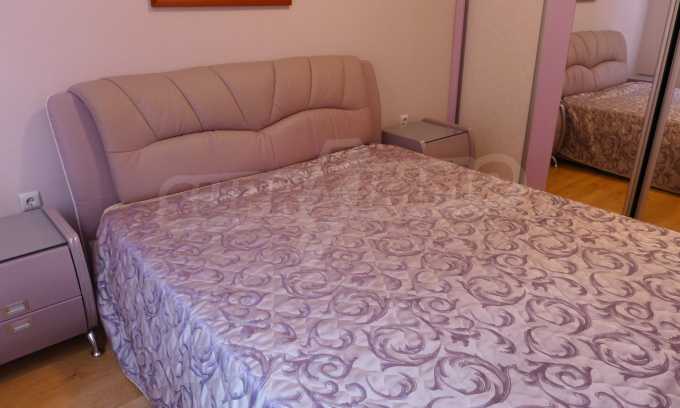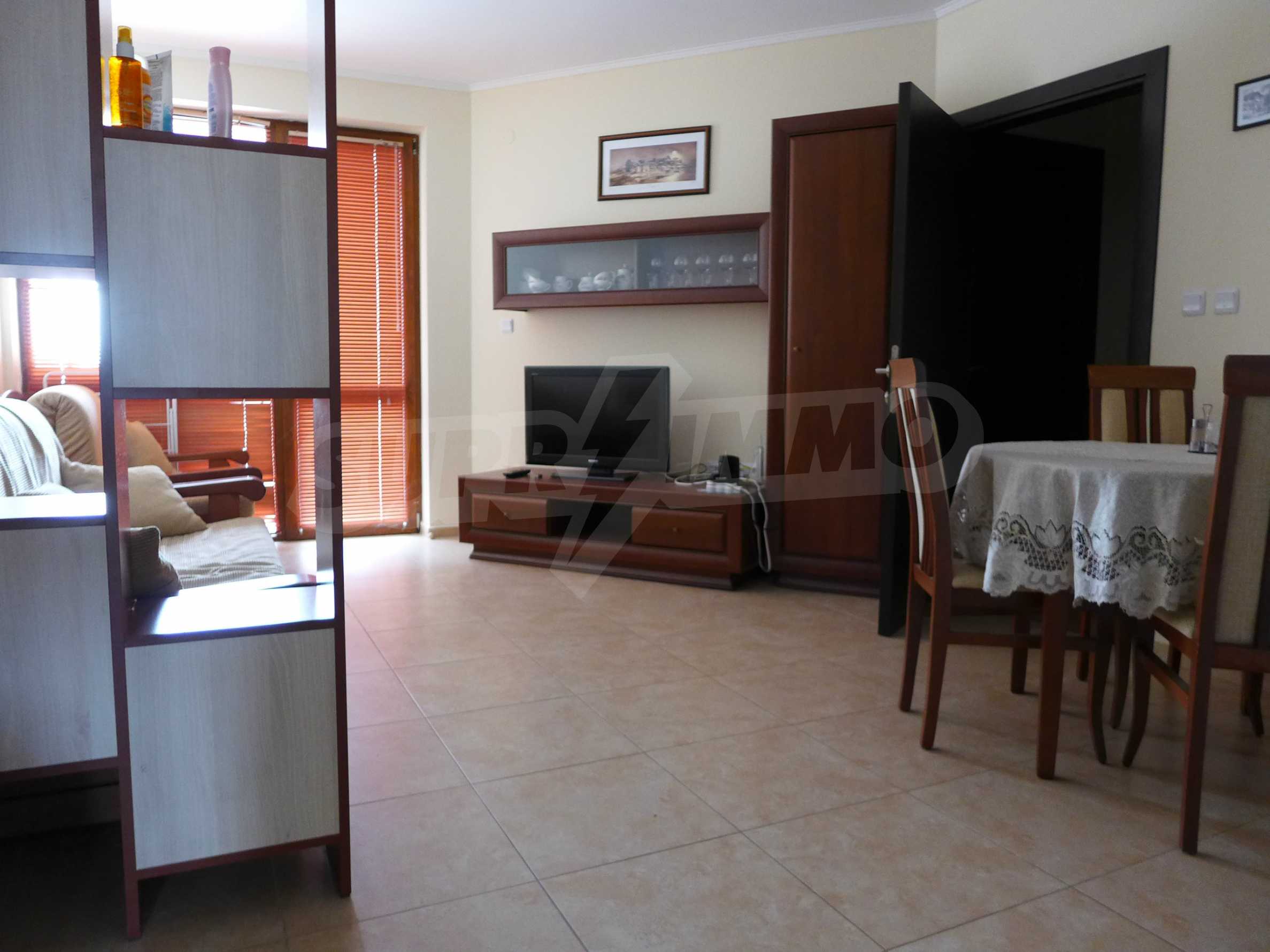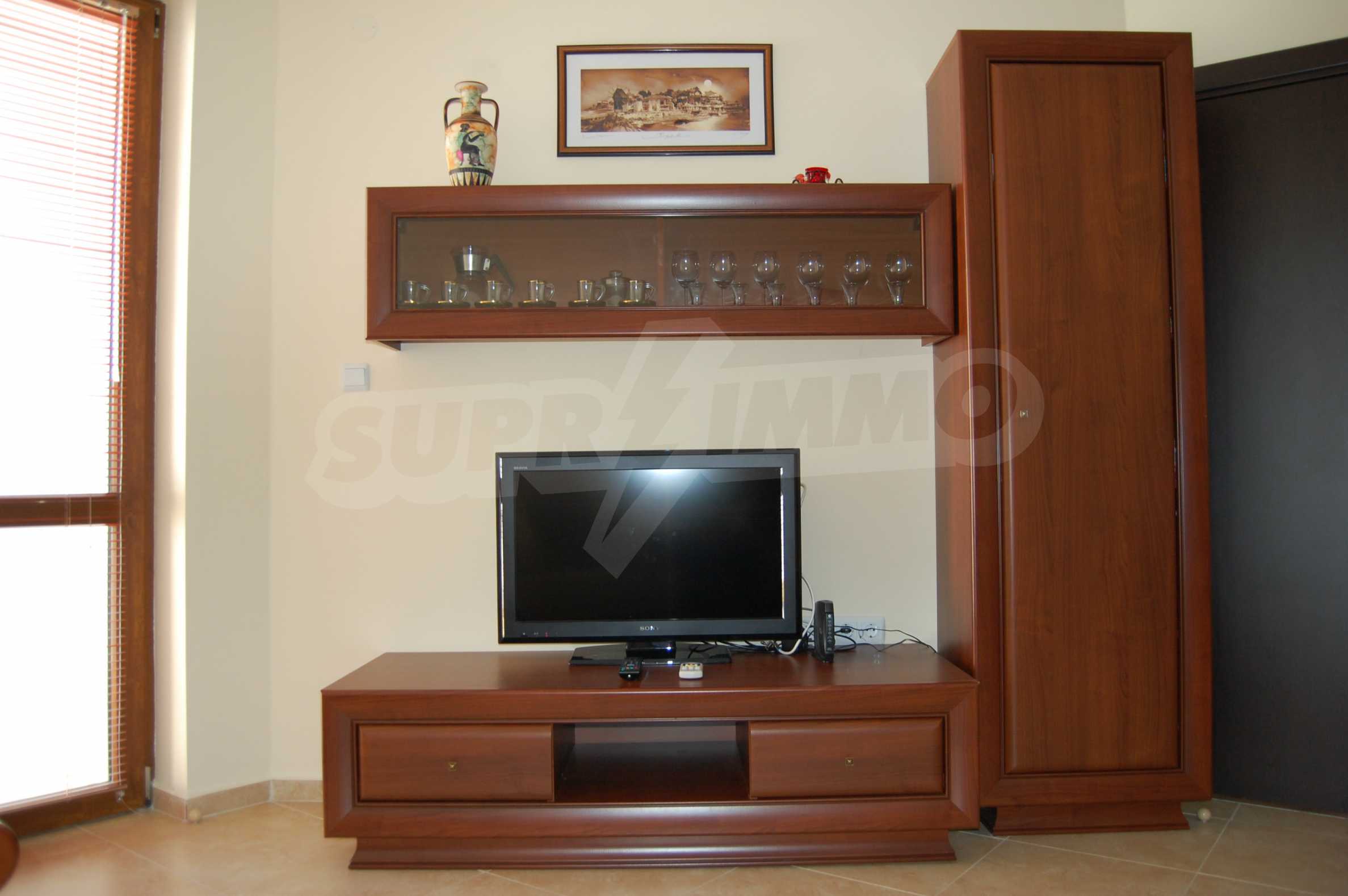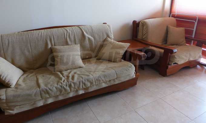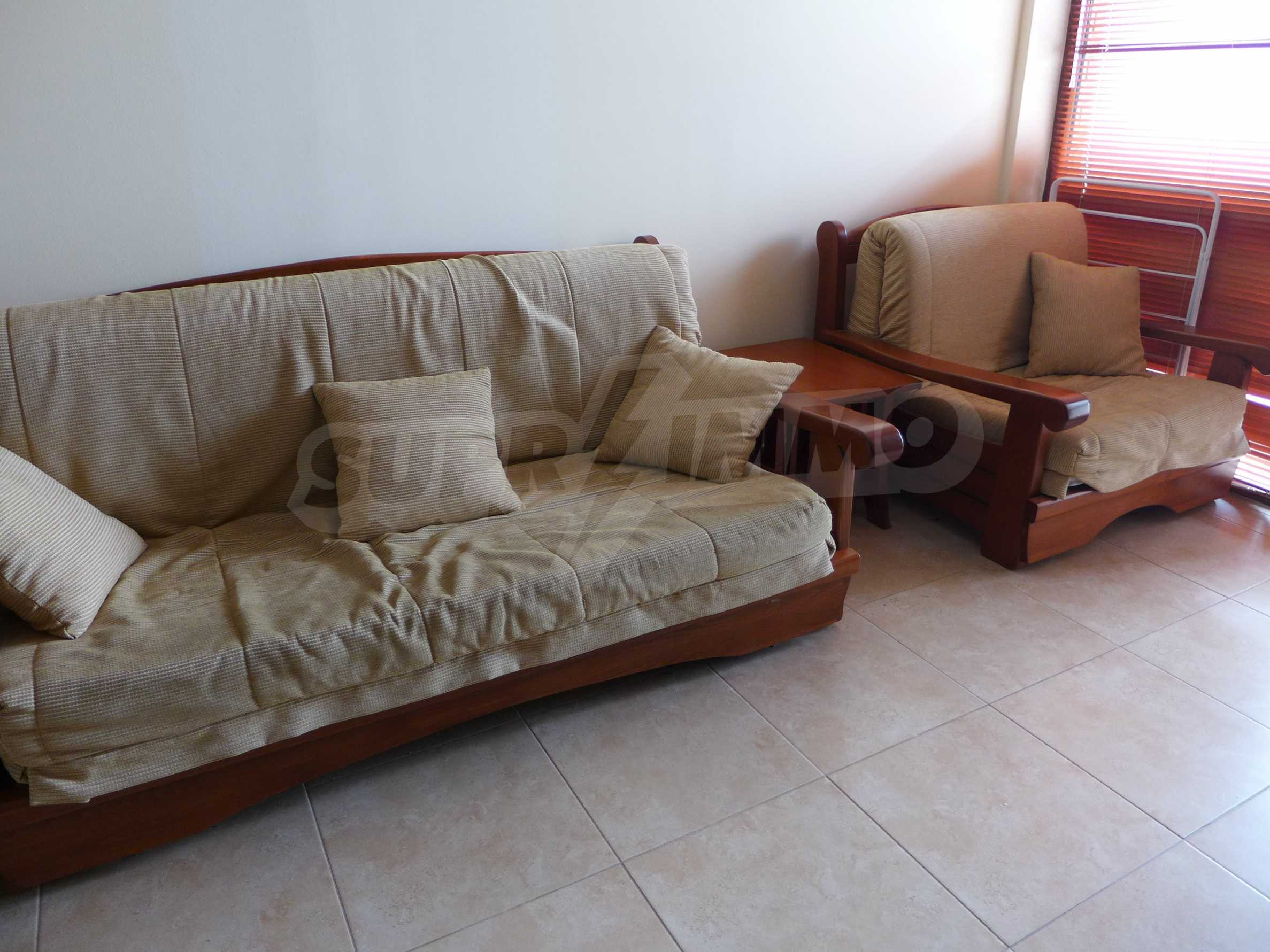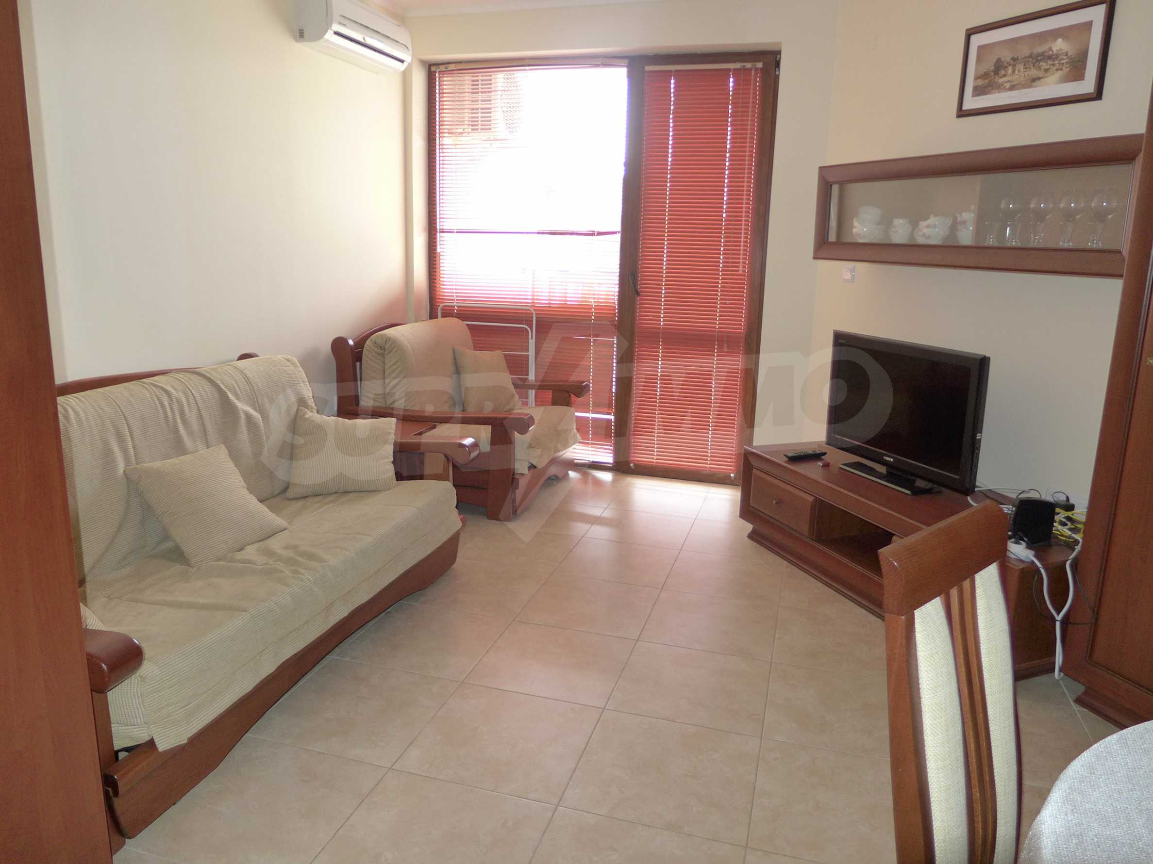 The comfortably furnished apartment, described in this offer, has nice view of the swimming pool in the inner yard of the complex. It is located on the 3/5 floor. The flat has cable TV, Internet, and the building is equipped with elevator. The furniture and equipment included in the final price, are shown in the pictures.