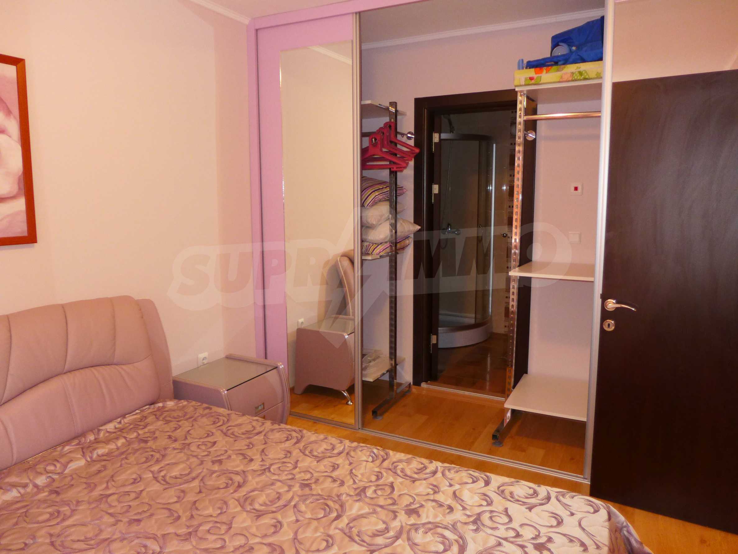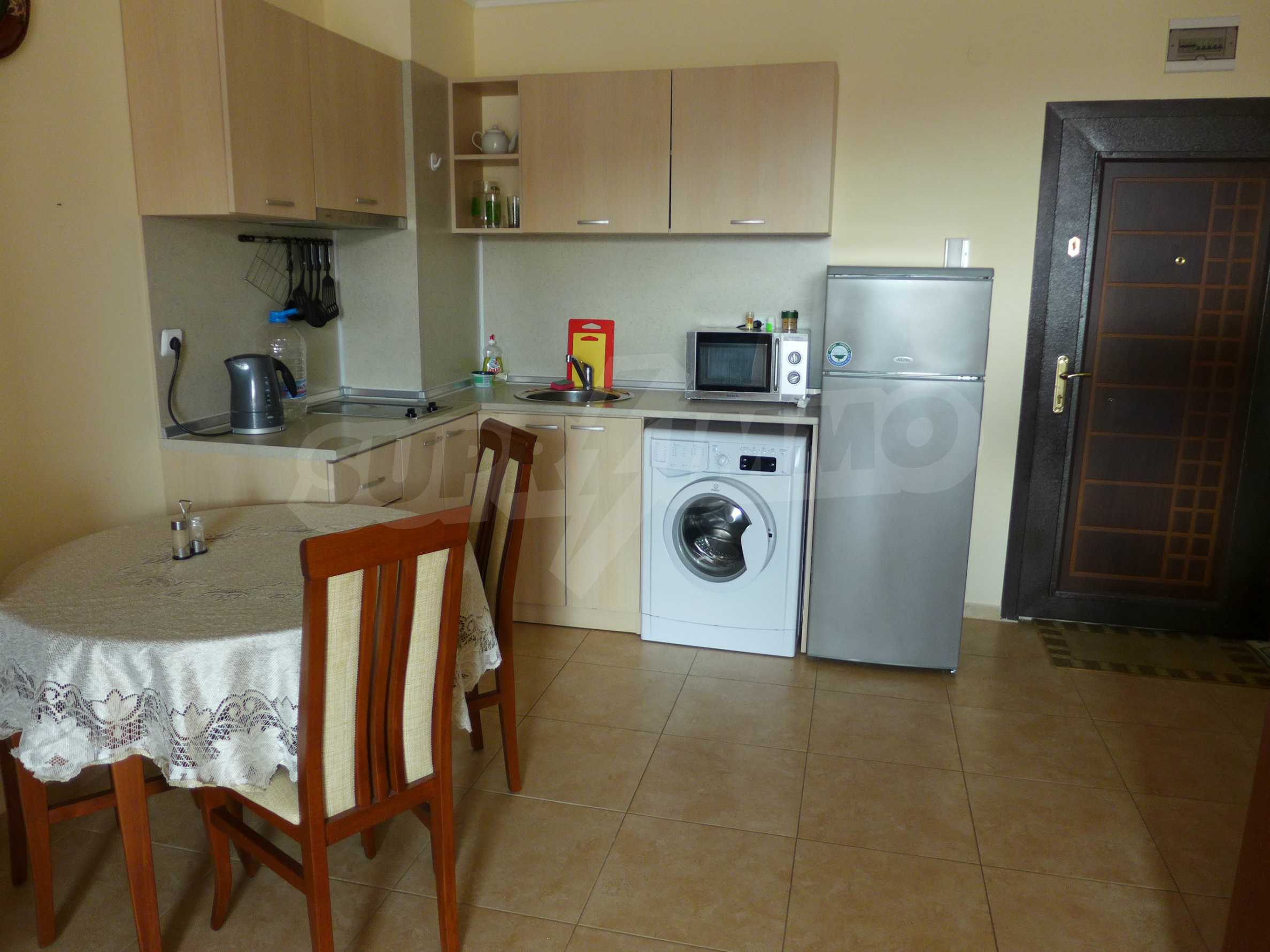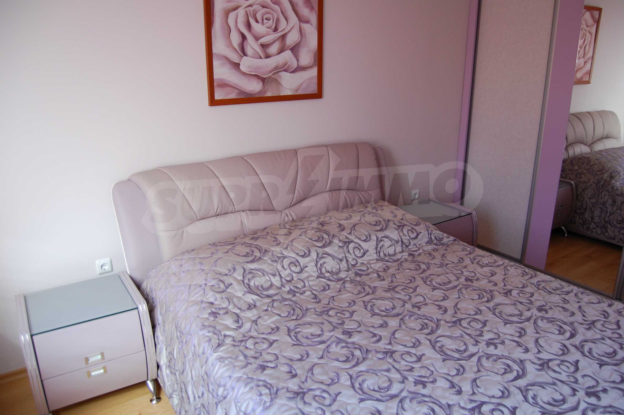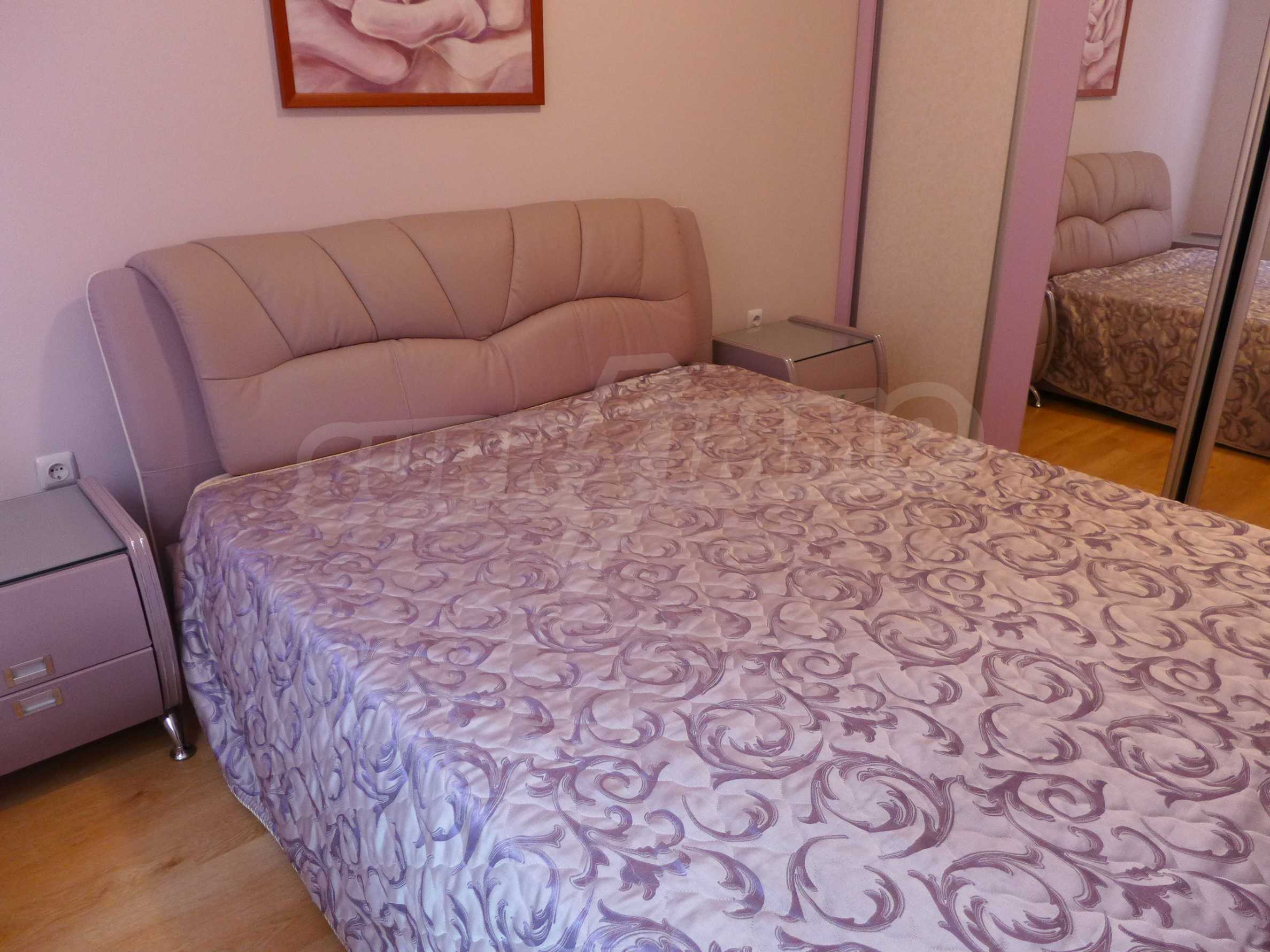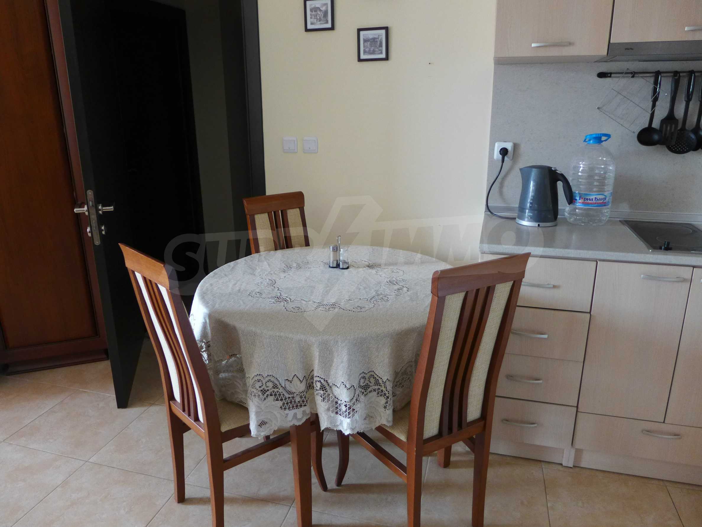 The comfortably furnished apartment, described in this offer, has nice view of the swimming pool in the inner yard of the complex. It is located on the 3/5 floor. The flat has cable TV, Internet, and the building is equipped with elevator. The furniture and equipment included in the final price, are shown in the pictures.