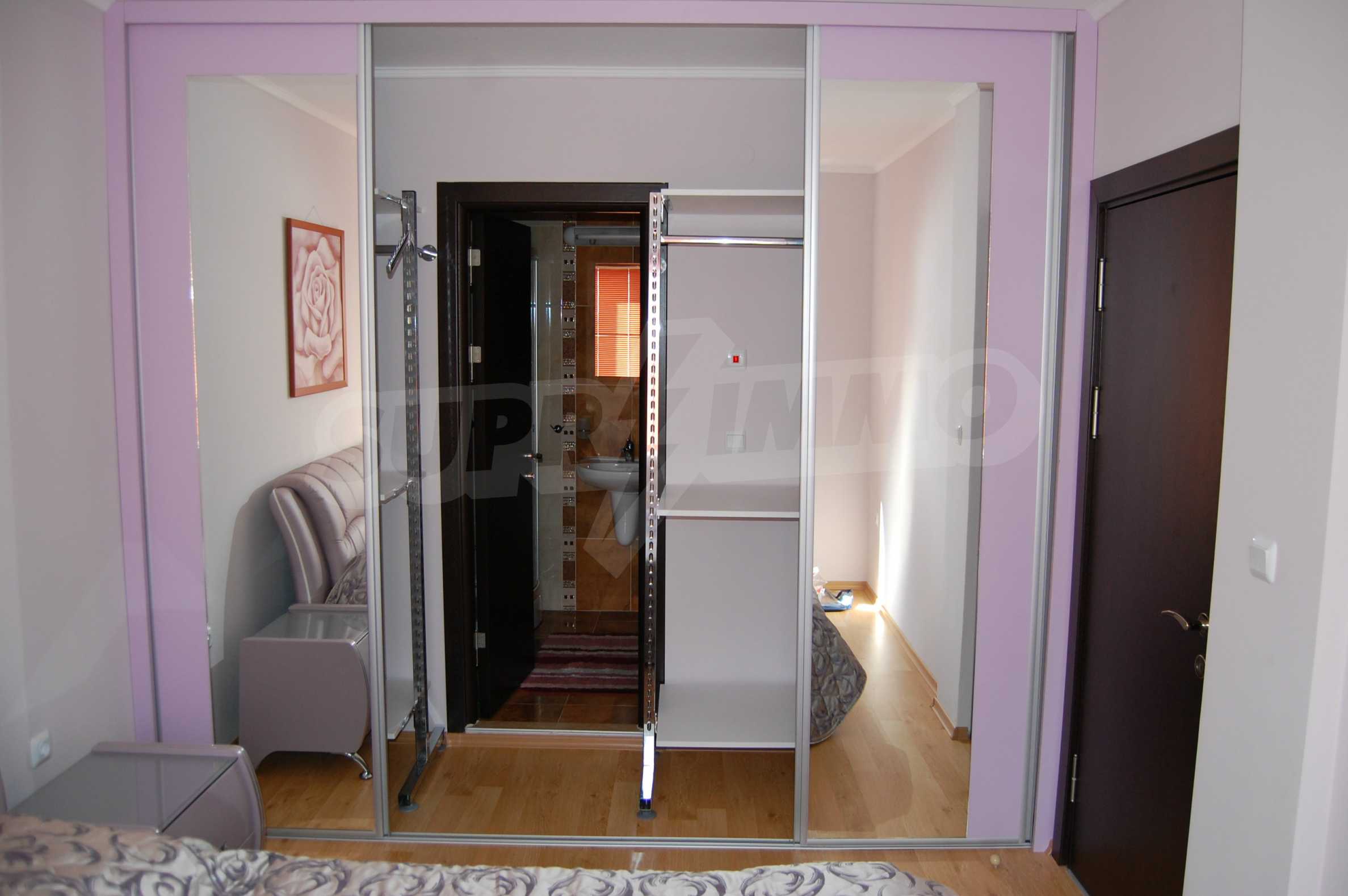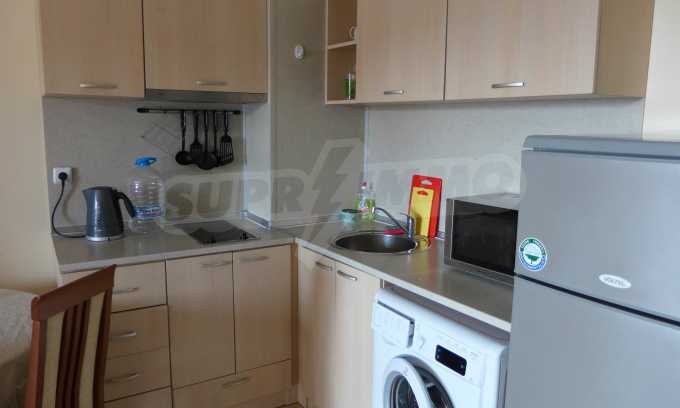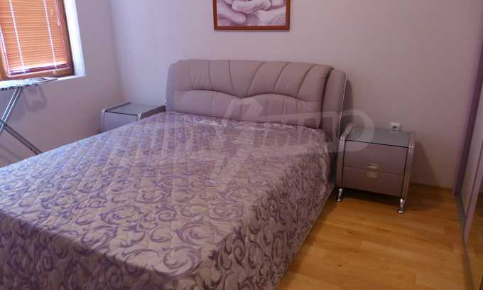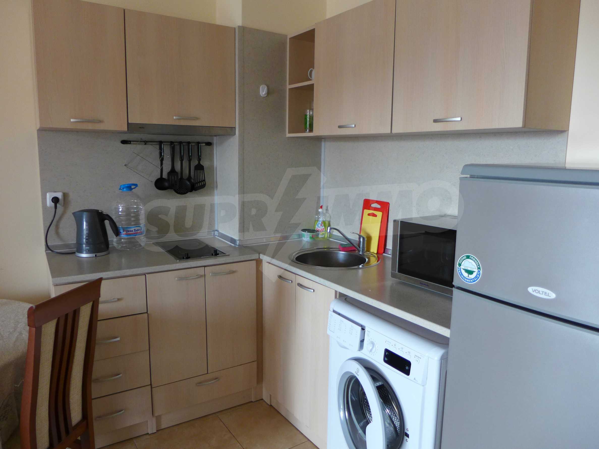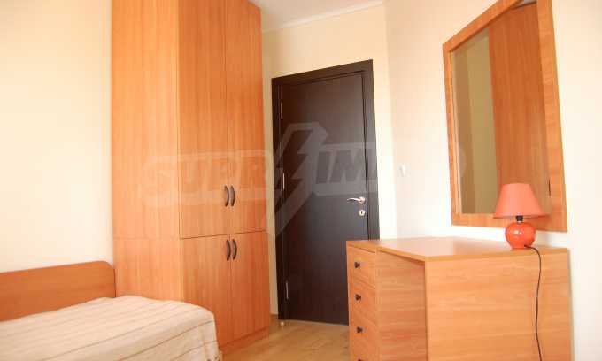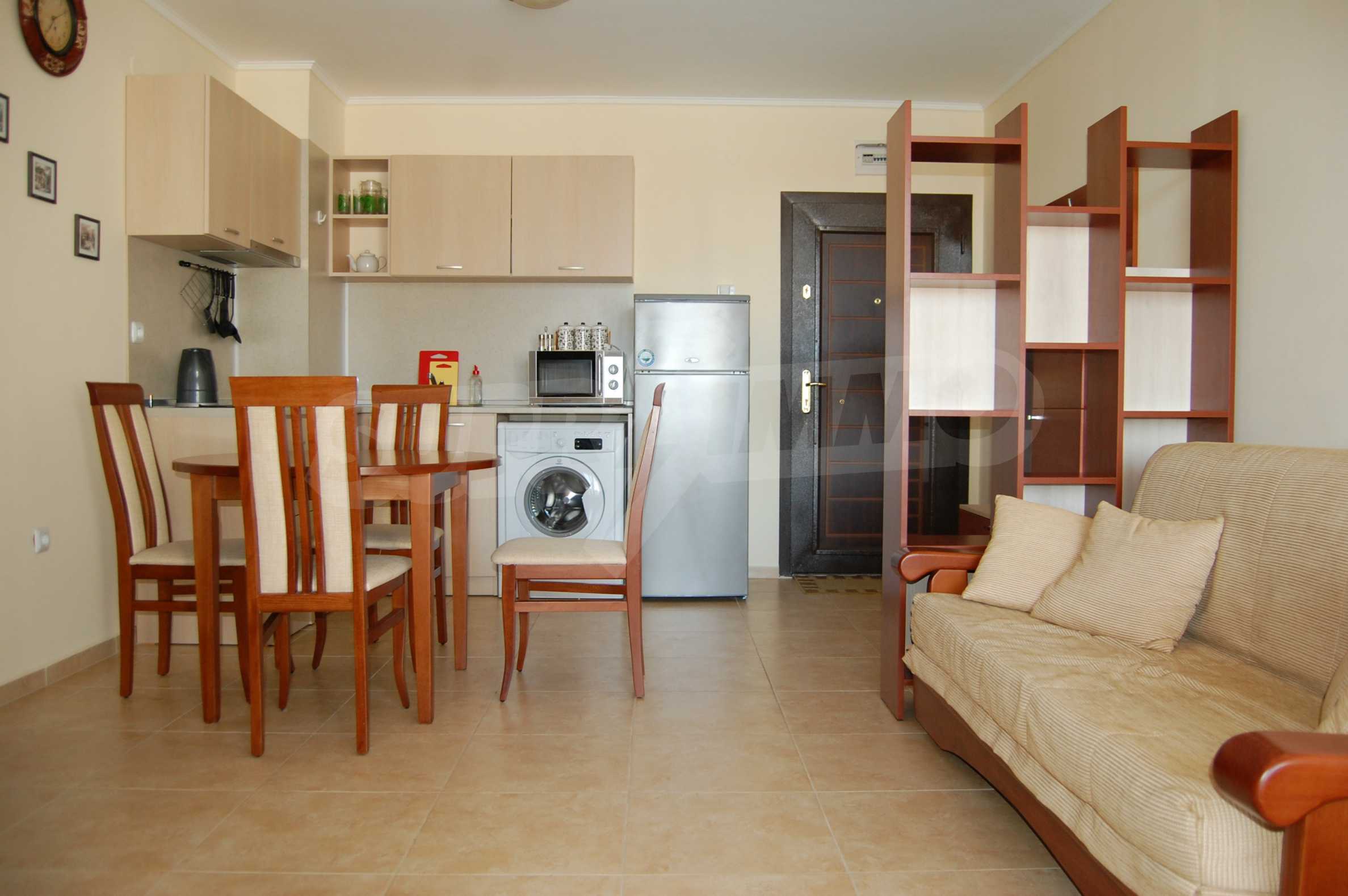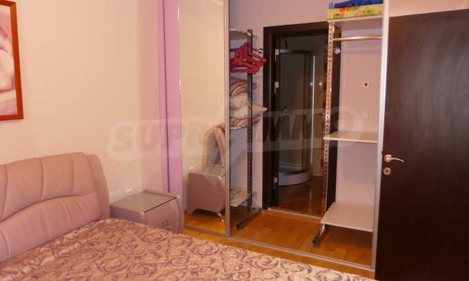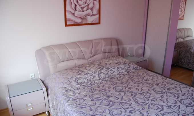 The comfortably furnished apartment, described in this offer, has nice view of the swimming pool in the inner yard of the complex. It is located on the 3/5 floor. The flat has cable TV, Internet, and the building is equipped with elevator. The furniture and equipment included in the final price, are shown in the pictures.