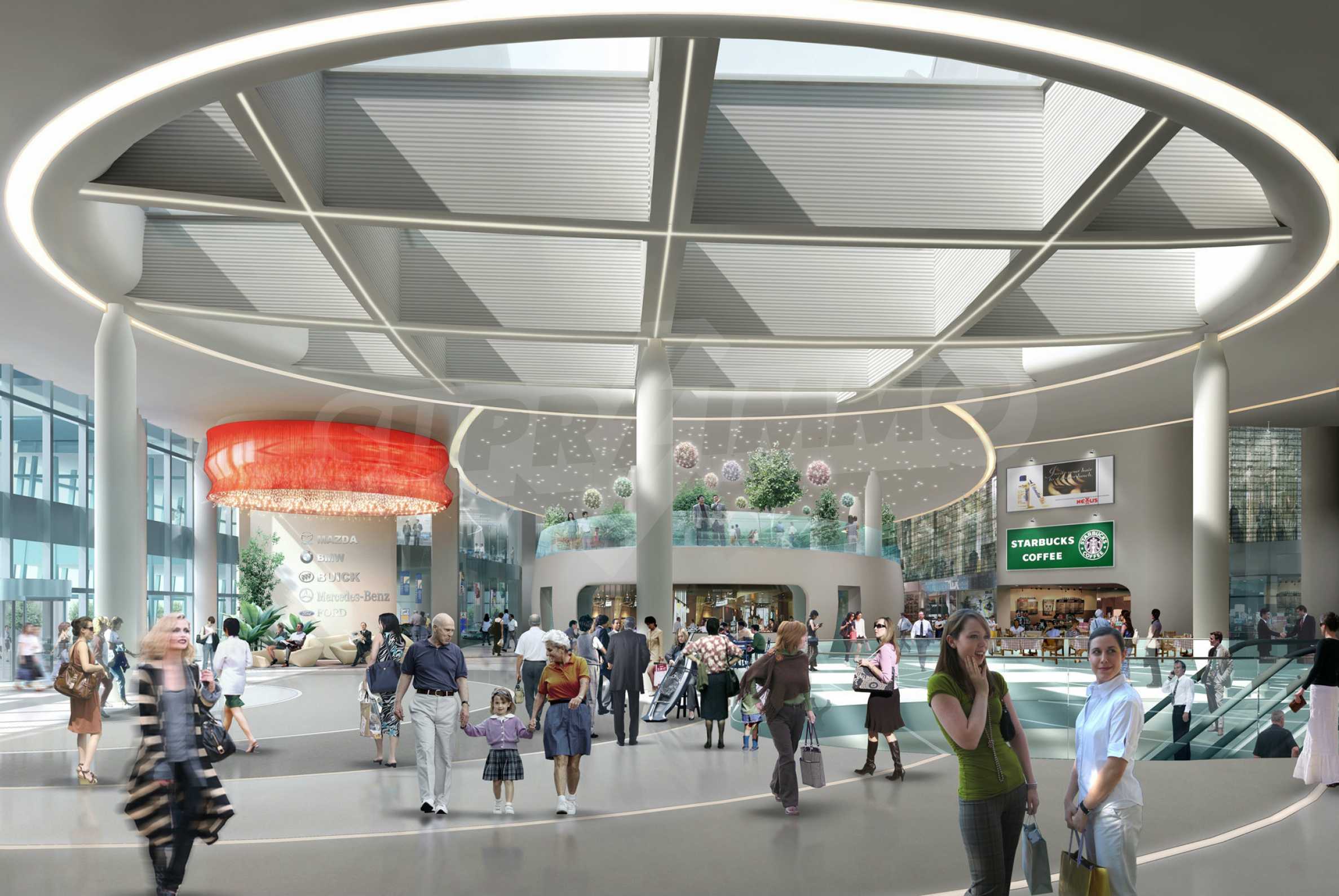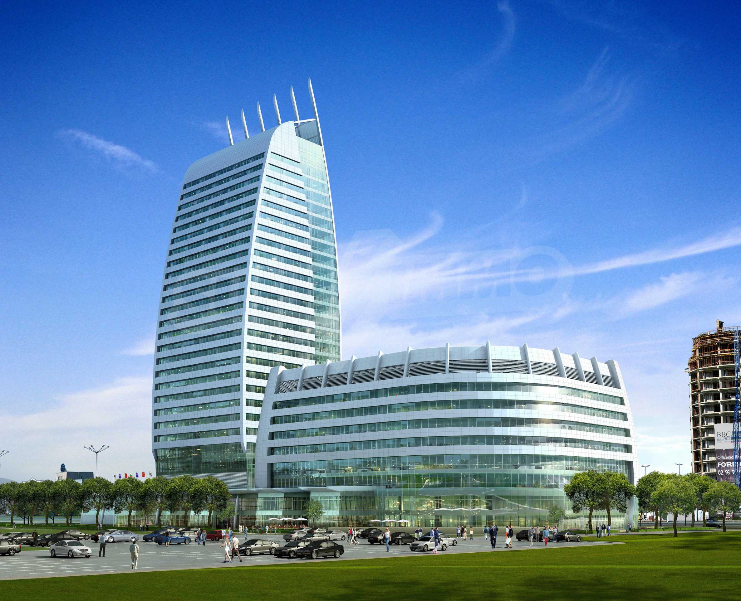 The complex consists of two office buildings, a financial center, conference halls, bank offices, restaurants and fast food outlets with winter garden, shops, showrooms, fitness center, beauty salon, children’s place, travelling agency, dry-cleaners, underground parking with 750 parking places.