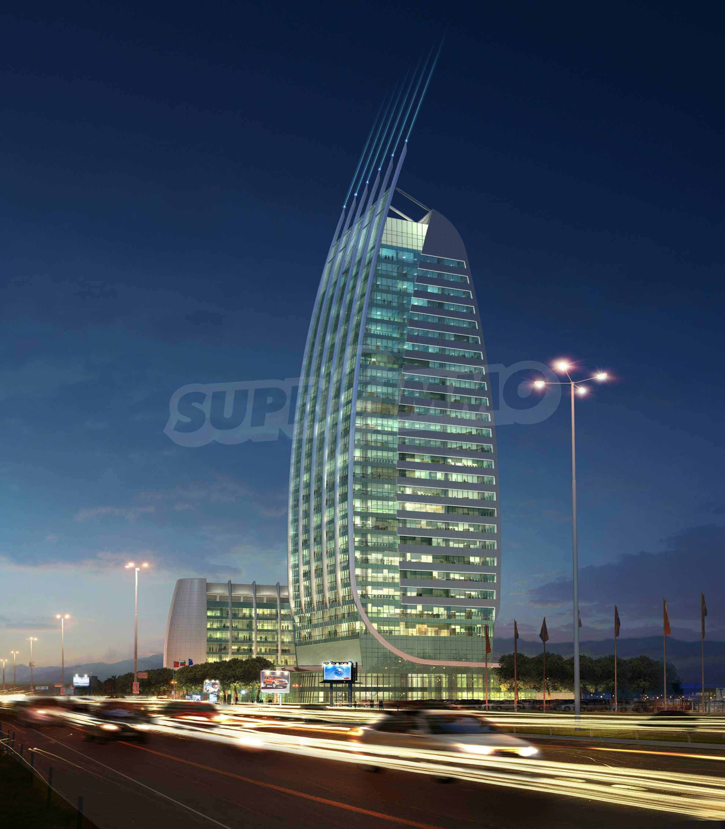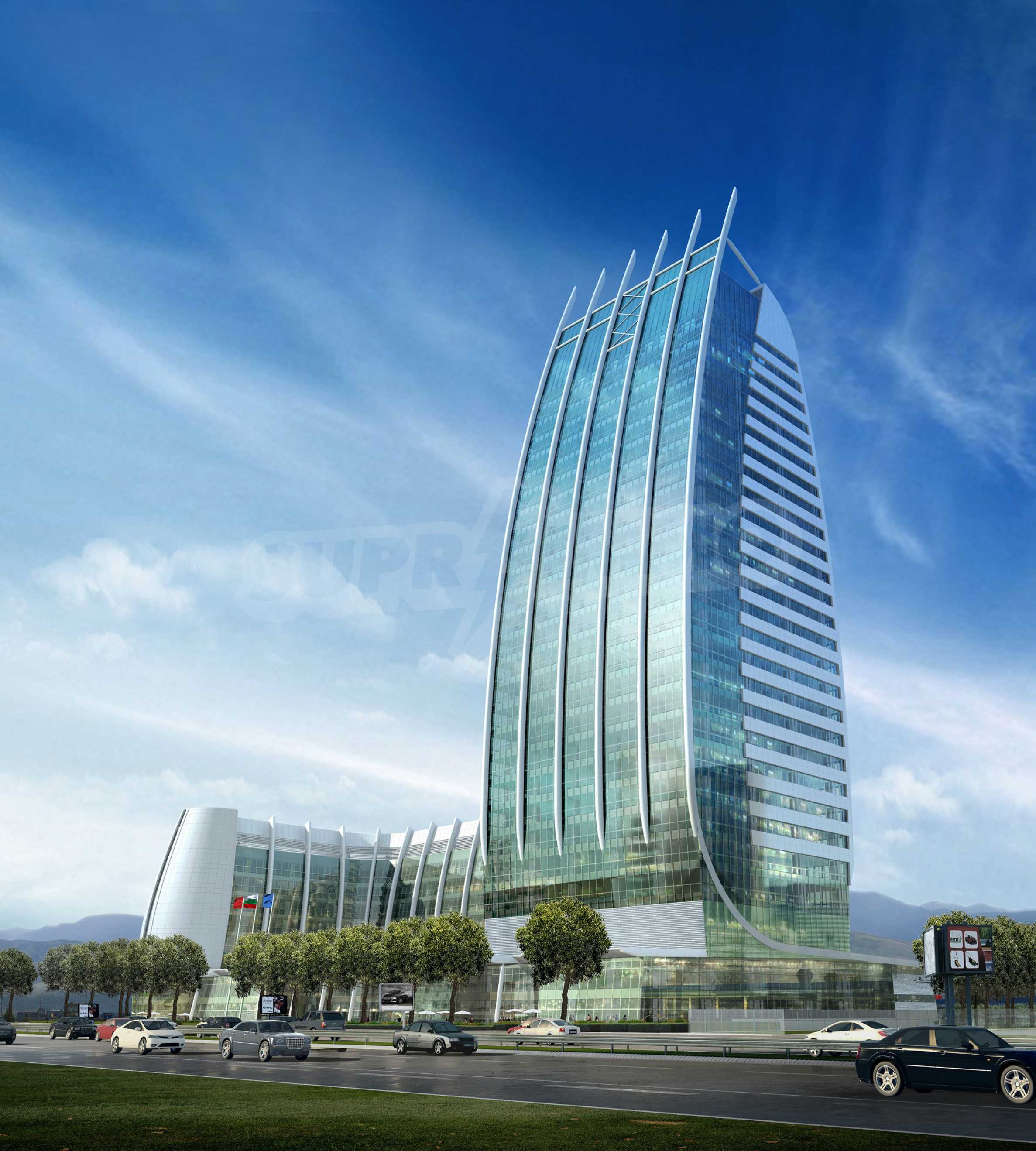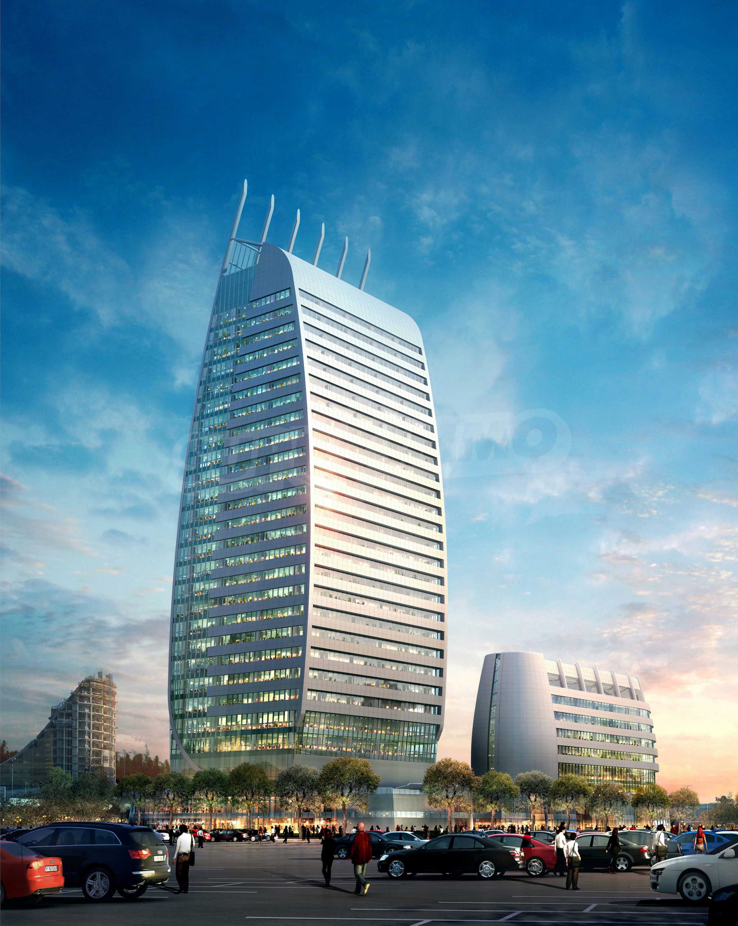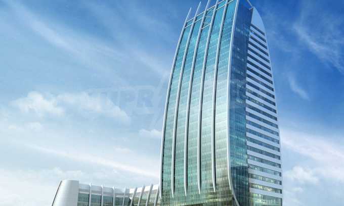 The construction of the building is of monolithic ferroconcrete type. A combined system has been projected for funding from the common fundament of the whole complex slab and with drain-casting pilots under the high building. The construction system of the high building is of scaffold-frame, with central core and periphery frames for taking-up the horizontal powers from wind and earthquake, and columns for taking-up the vertical loads.