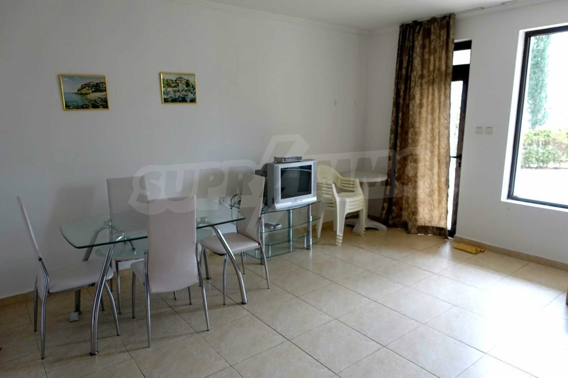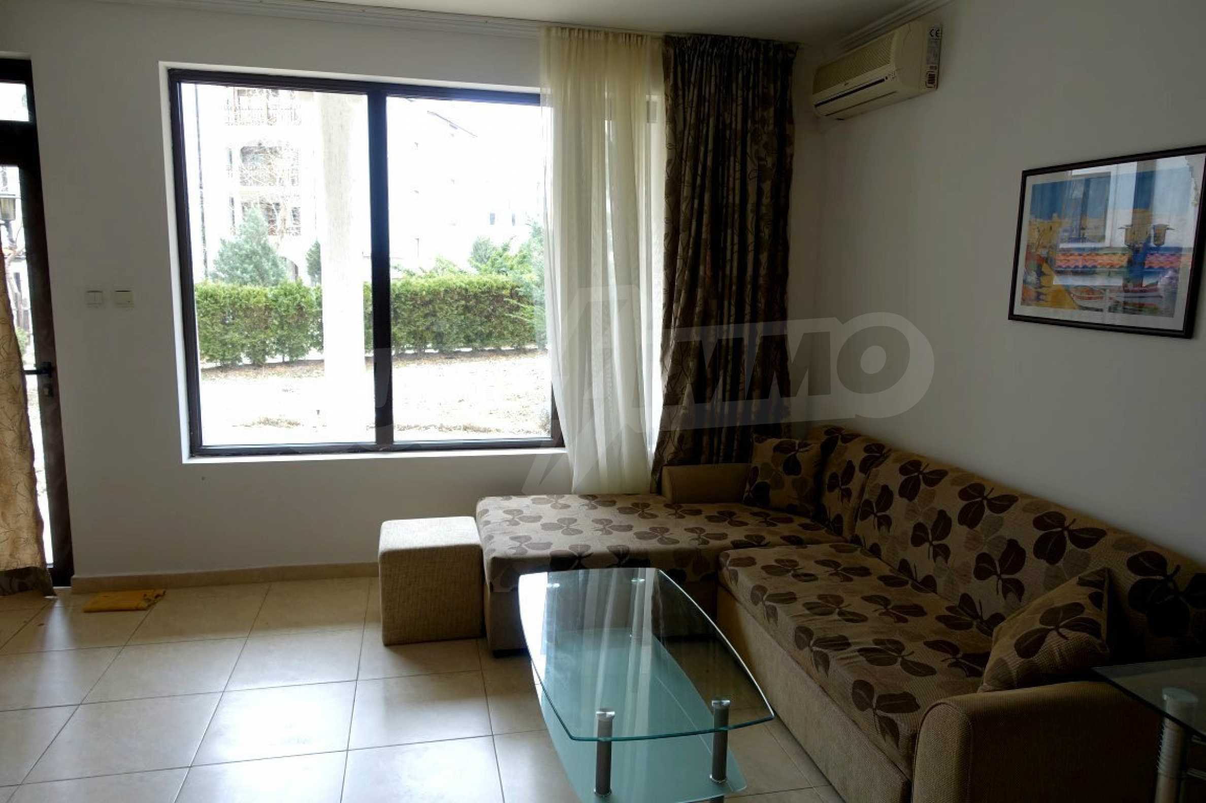 The net area of the apartment is 60 sq.m. It is located on the ground floor with beautiful views and direct access to the landscaped inner yard of the complex. The furniture and equipment include: a stove, an extractor hood, a fridge, a microwave (kitchenette); a sofa, a table, a TV set (living room); a double bed, a wardrobe, a dressing table (bedroom); a water heater and other bathroom equipment (bathroom with WC). The maintenance fee is € 600 / year.