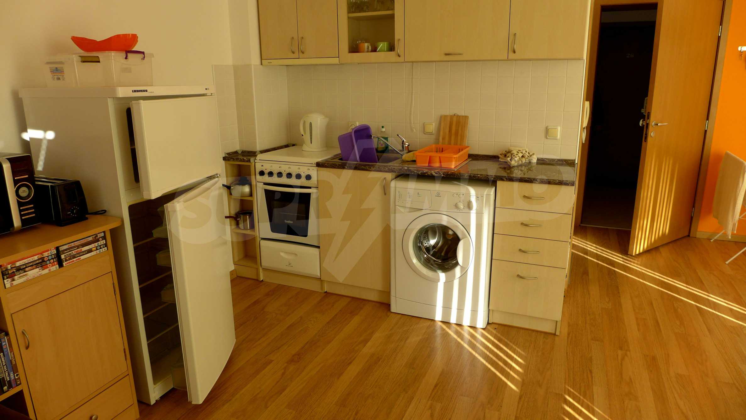 The described studio apartment is located on the fifth floor with a total area of 51.19 sq.m. and living area of 43.05 sq.m. The kitchen is equipped with a stove, a refrigerator, a table and chairs, a microwave oven, a washing machine, a sofa, cupboards. The sleeping area is furnished with a double bed. The bathroom is equipped with the ecessary accessories, a shower box and a water heater. The balcony offers nice views of the inner yard. The maintenance fee in the complex is 8 euros / sq.m.