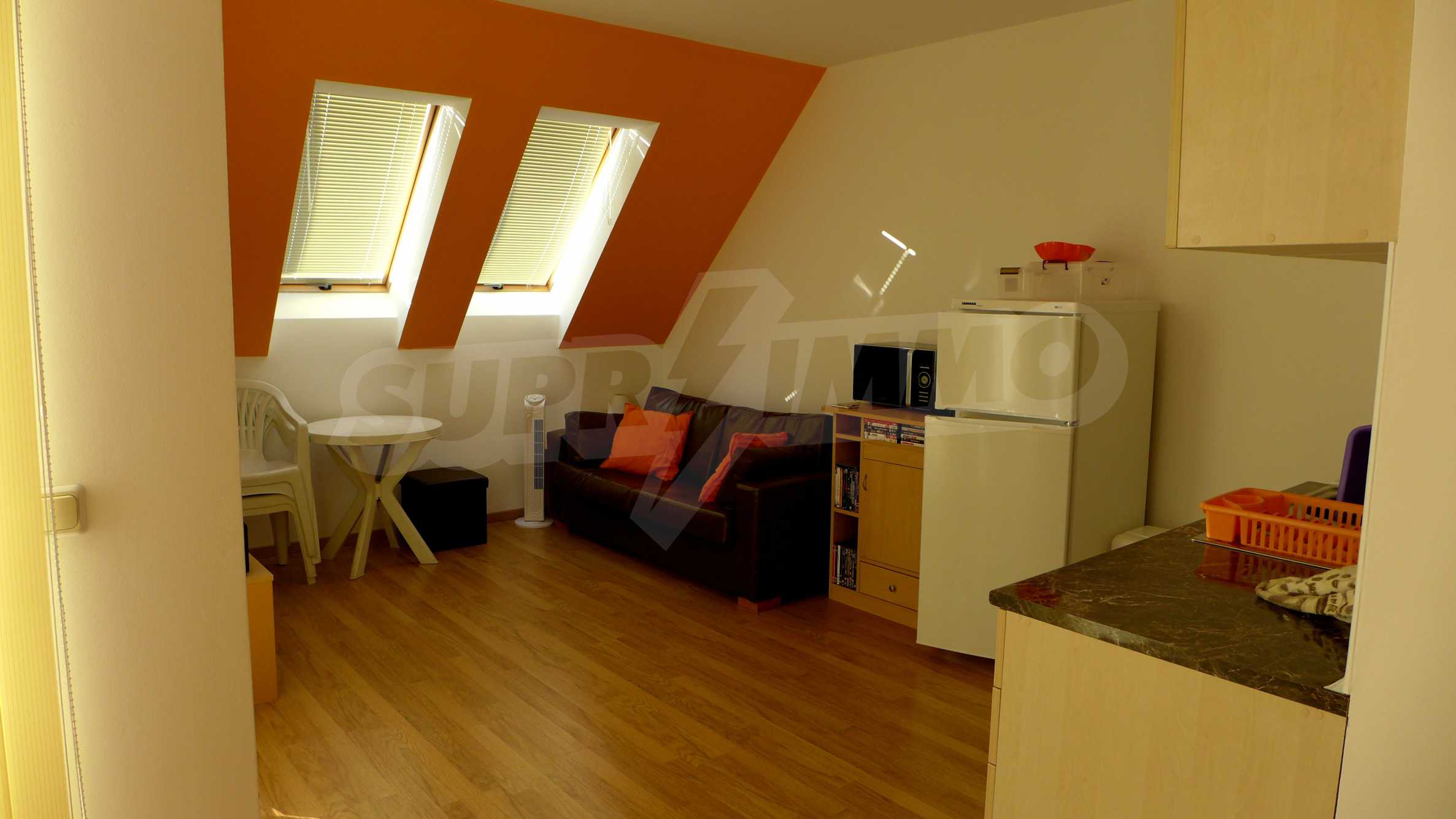 A comfortable studio in the gated complex Sea View, located next to the Marina in Sveti Vlas resort, just 200 meters from the beach. The resort is situated at the foot of the southern slopes of Balkan mountain, on the Black Sea coast. The complex is designed in a Mediterranean style, facing the sea. The coastal road leading north from Sunny Beach to Elenite, is passing through Sveti Vlas, which is growing rapidly in the recent years but retains its picturesque nature scenery.