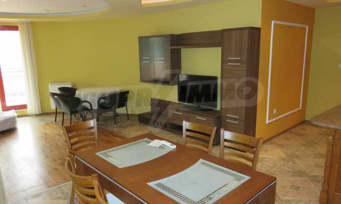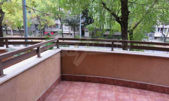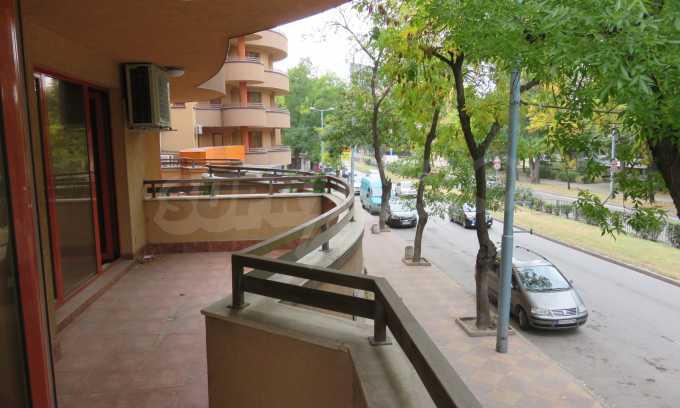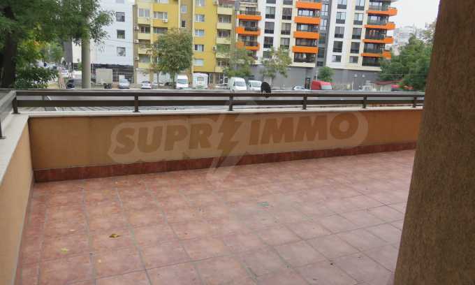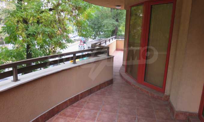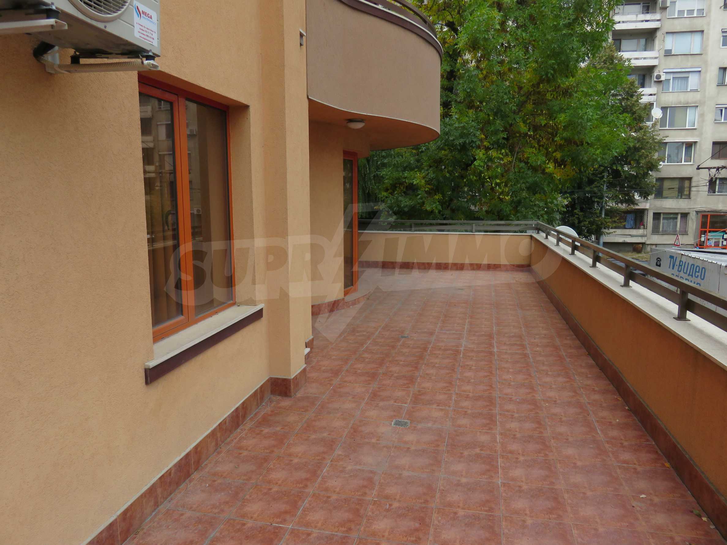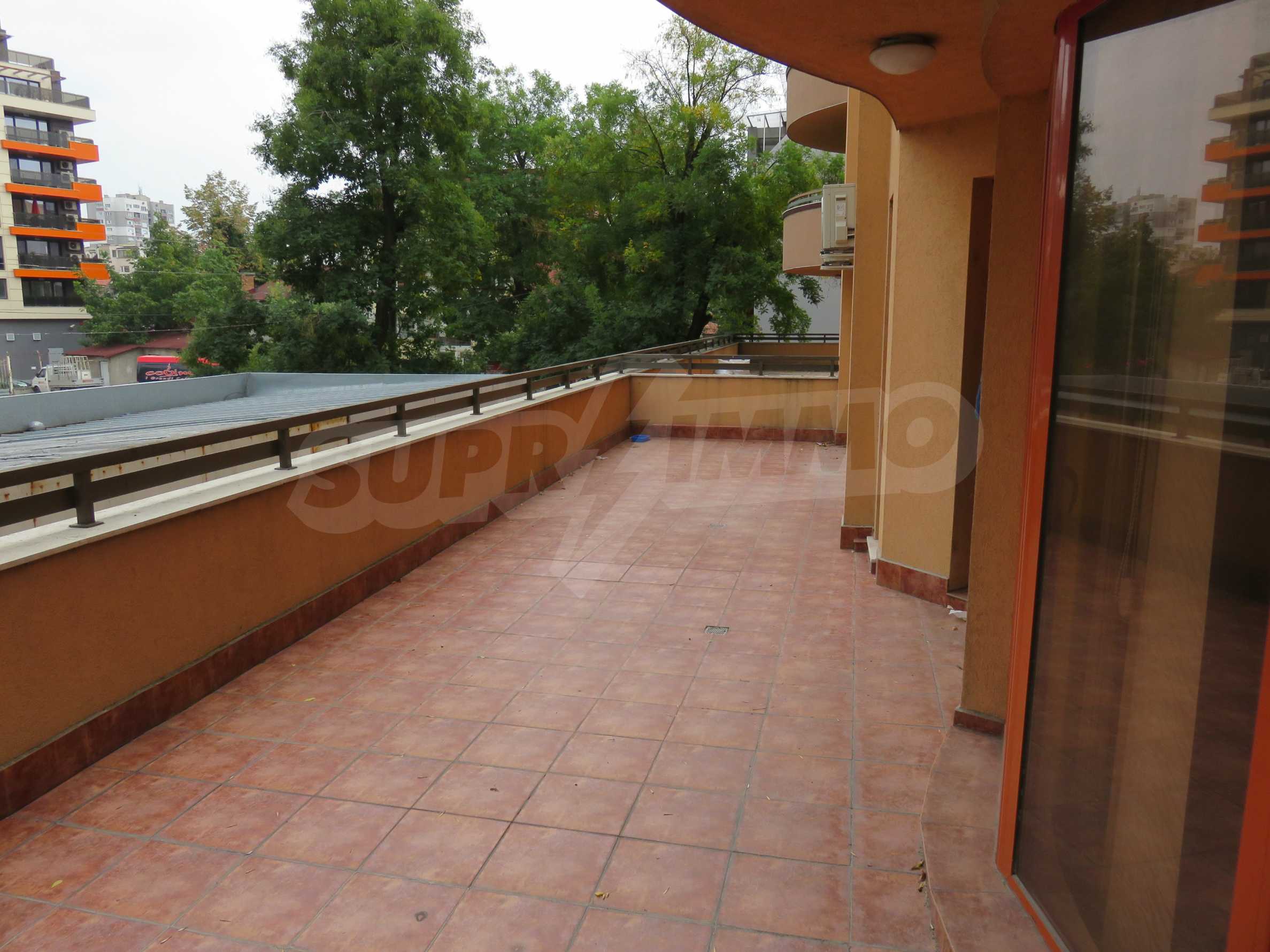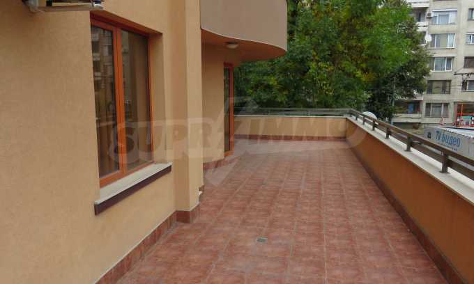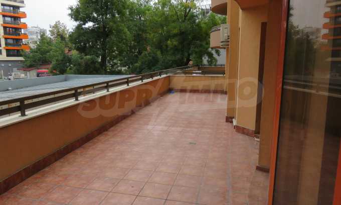 The apartment is located on the 2/9 floor in a well-maintained new building (2010) with a porter and elevator. The total area of the apartment is 168 sq.m., living area - 163 sq.m. The flat consists of a living room with kitchenette, two bedrooms, a bathroom and WC and a shower box, a separate toilet, a hallway and a large terrace that surrounds the whole apartment. The property is facing east and it is finished with laminate and tiled flooring, painted walls, PVC joinery. The heating is central and with air conditioning. The dwelling has cable TV, Internet and security system. The property includes a basement.