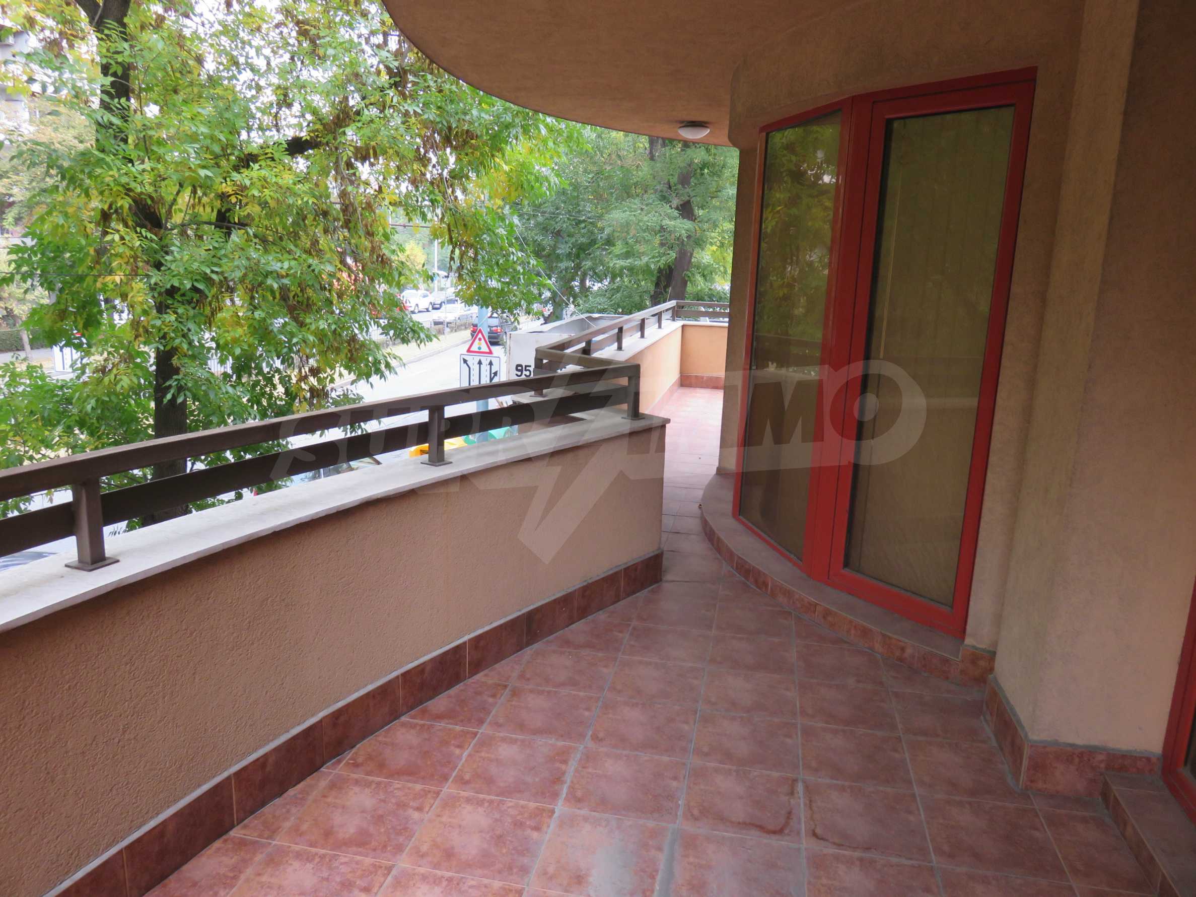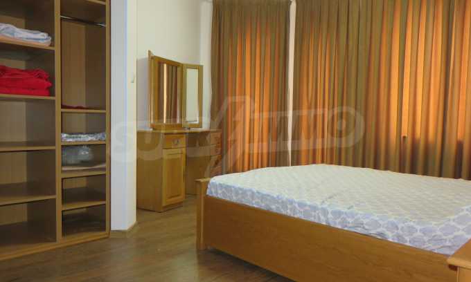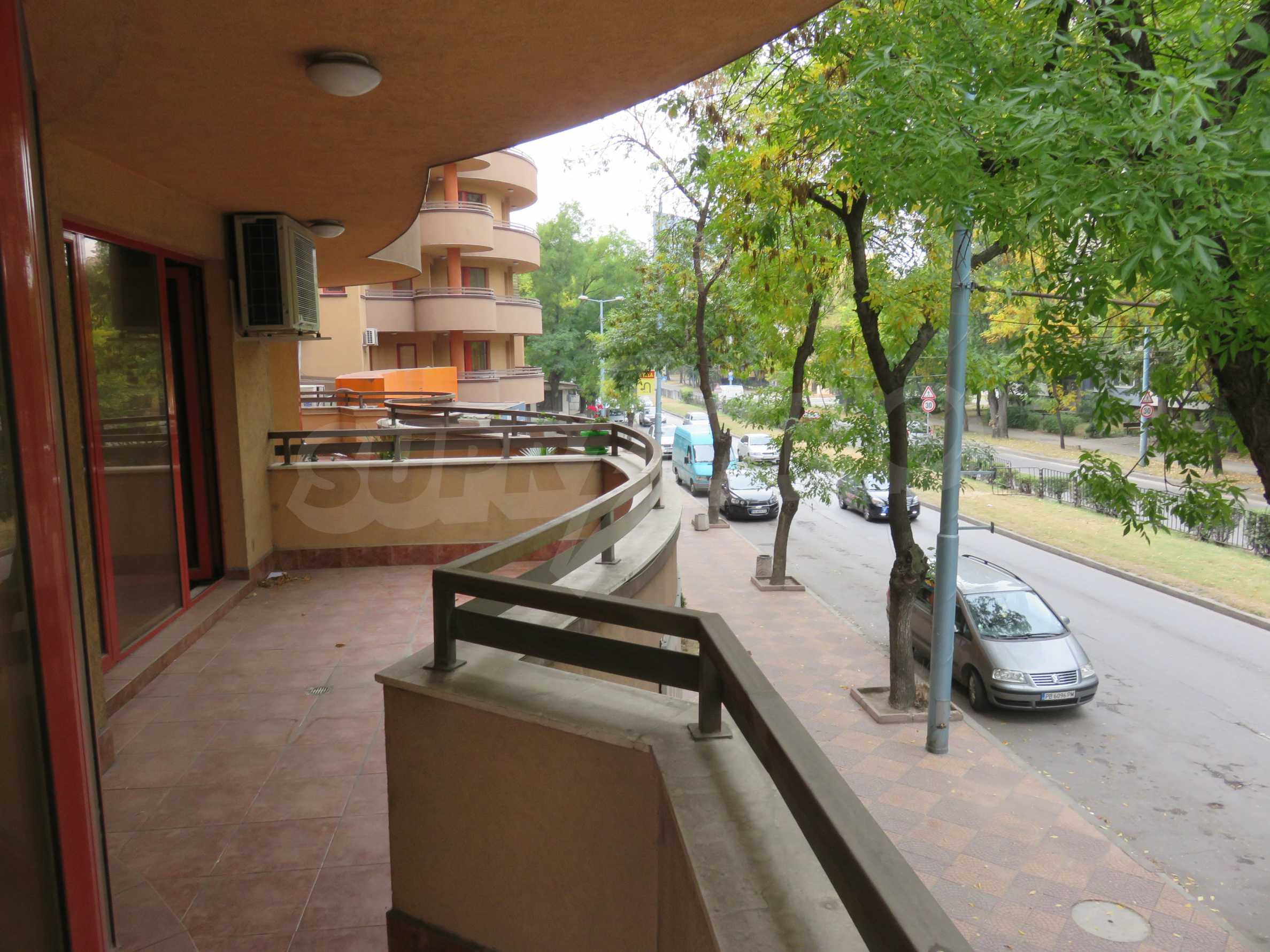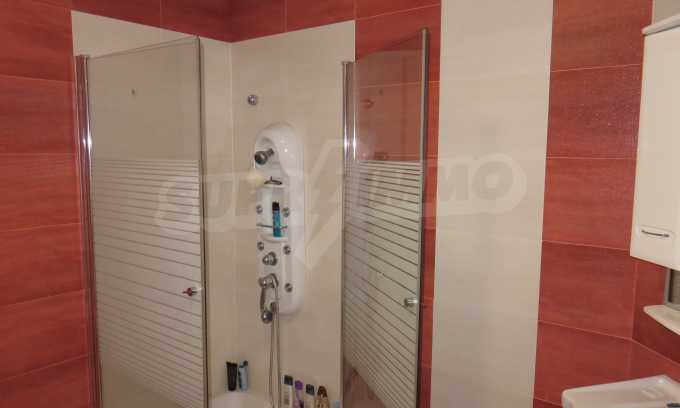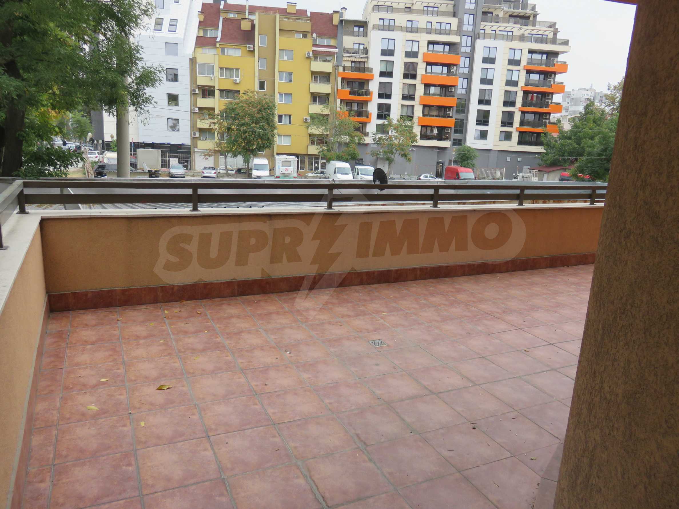 The apartment is located on the 2/9 floor in a well-maintained new building (2010) with a porter and elevator. The total area of the apartment is 168 sq.m., living area - 163 sq.m. The flat consists of a living room with kitchenette, two bedrooms, a bathroom and WC and a shower box, a separate toilet, a hallway and a large terrace that surrounds the whole apartment. The property is facing east and it is finished with laminate and tiled flooring, painted walls, PVC joinery. The heating is central and with air conditioning. The dwelling has cable TV, Internet and security system. The property includes a basement.