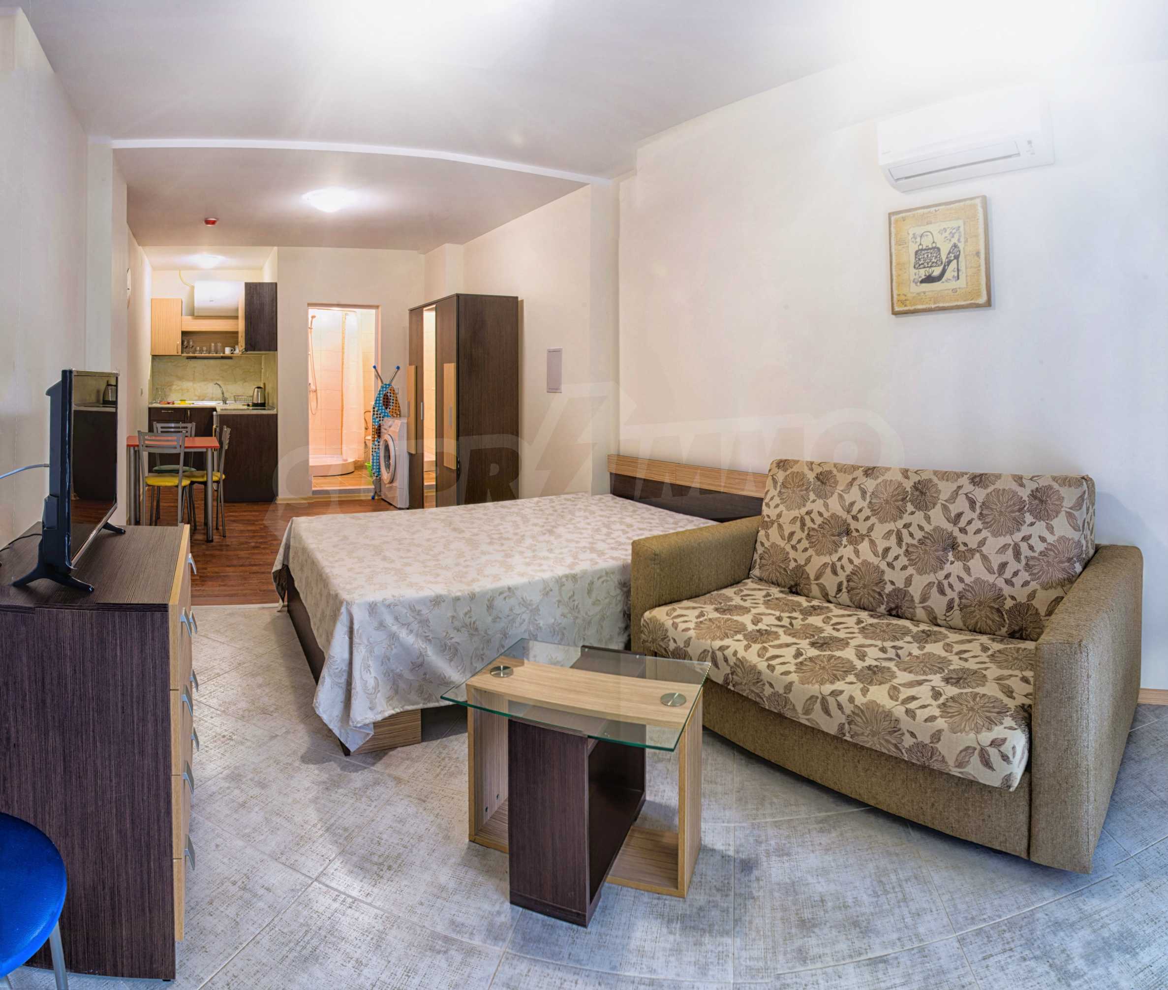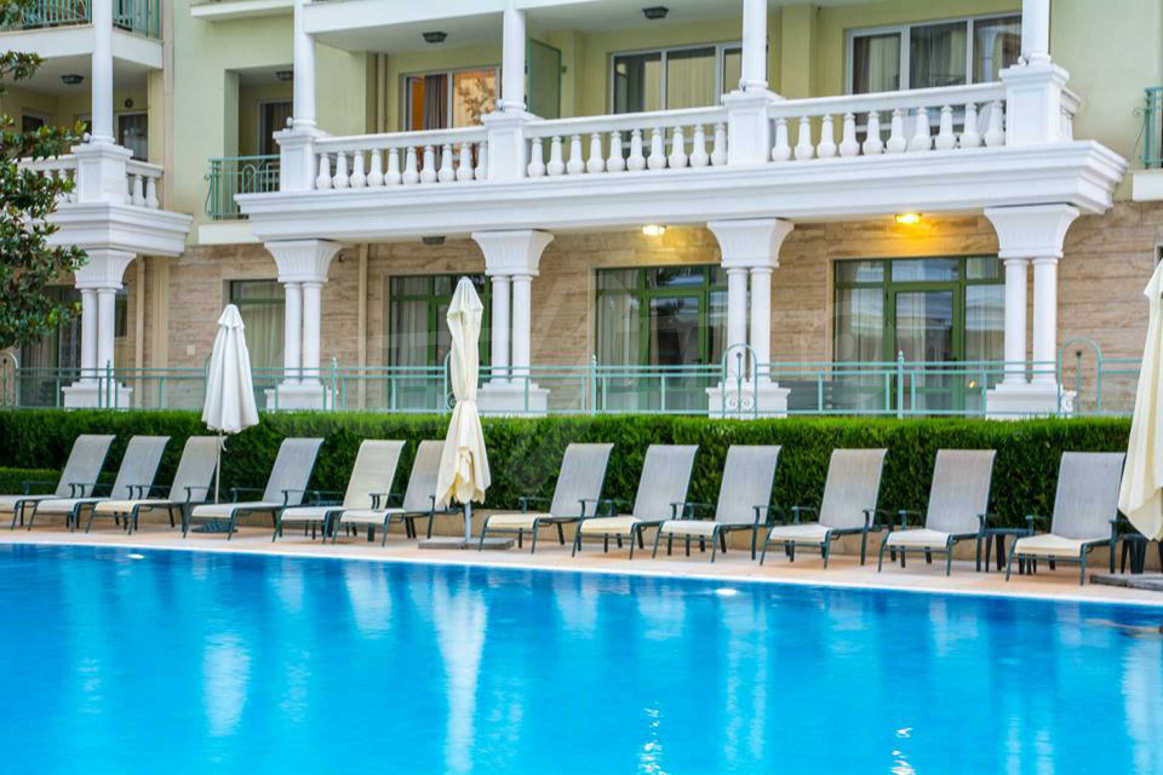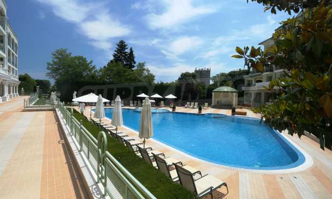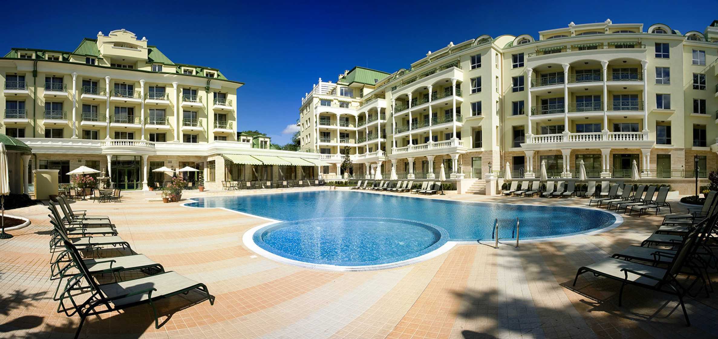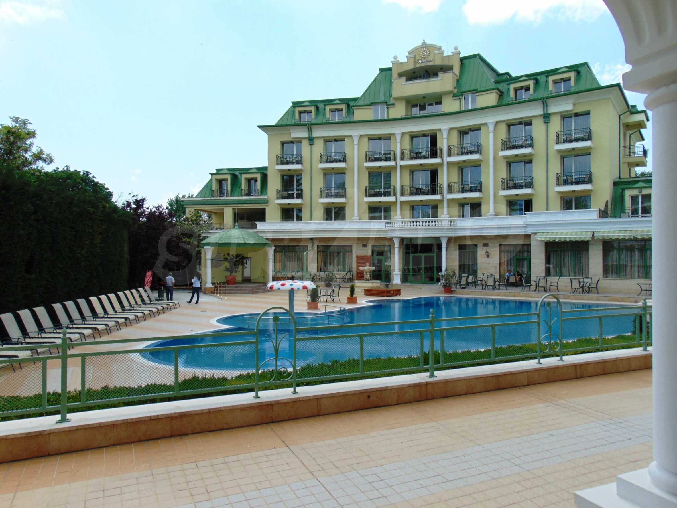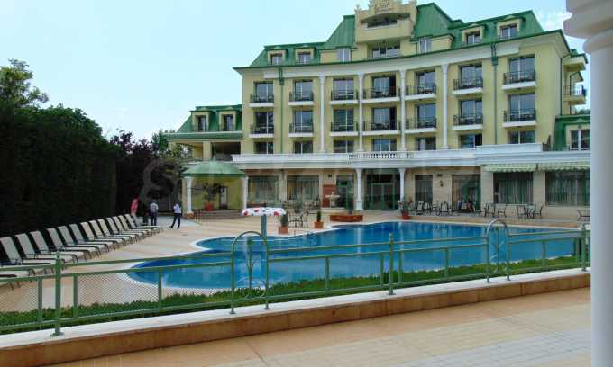 An attractive offer for a ready to move studios in SPA Hotel Romance Splendid, 300 m from the beach. The apartments overlook the swimming pool. St. St. Constantine and Helena is the oldest Bulgarian Black Sea resort. It is located 8 km north of the city center of Varna. Here you will find many places for entertainment - clubs, restaurants, bars, souvenir and clothing shops, race track, water sports, jet skis, surfing and more. The resort has police station, post office, pharmacy, gas station and health center, as well as regular bus lines for connection with the train station and the city center of Varna.