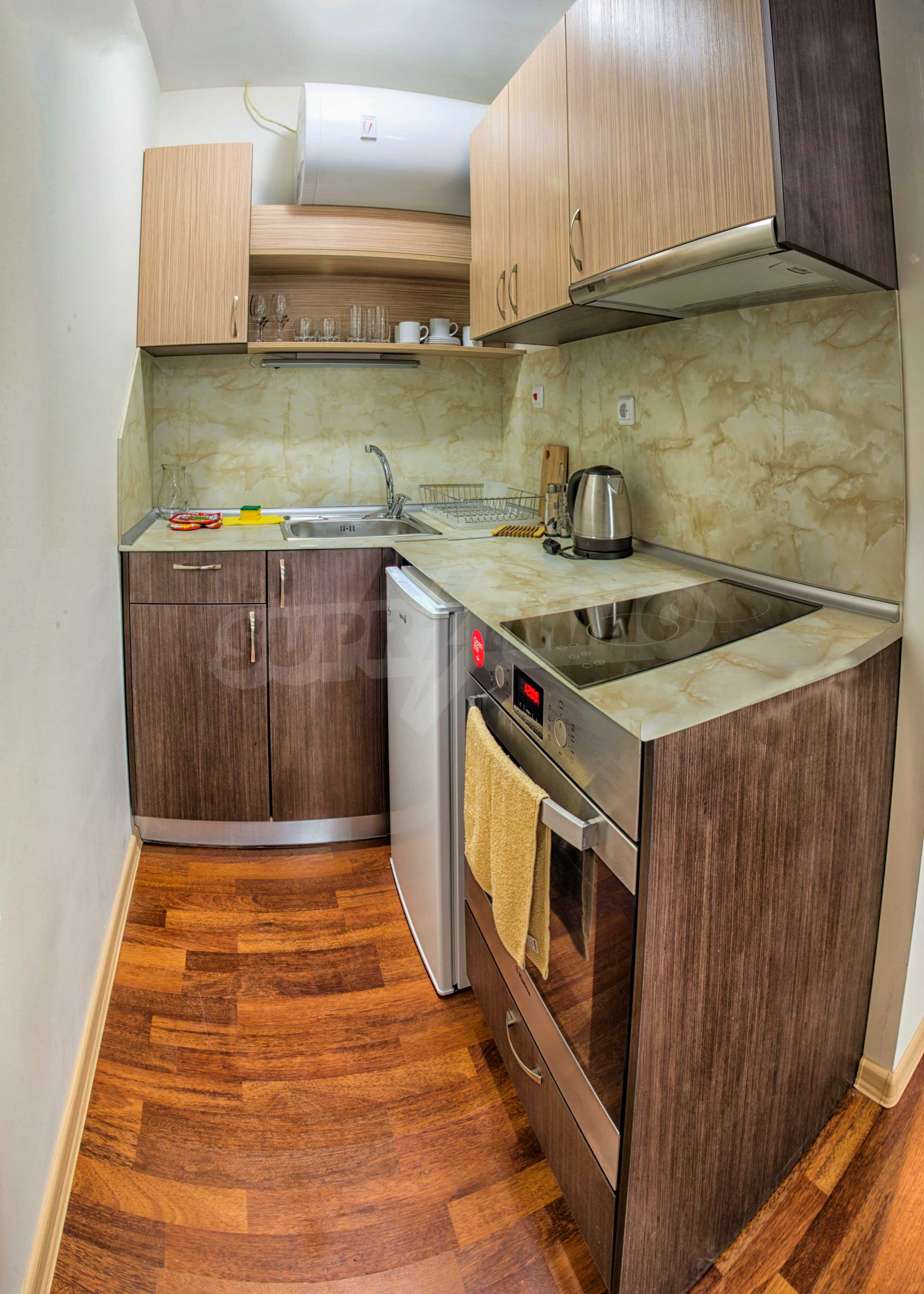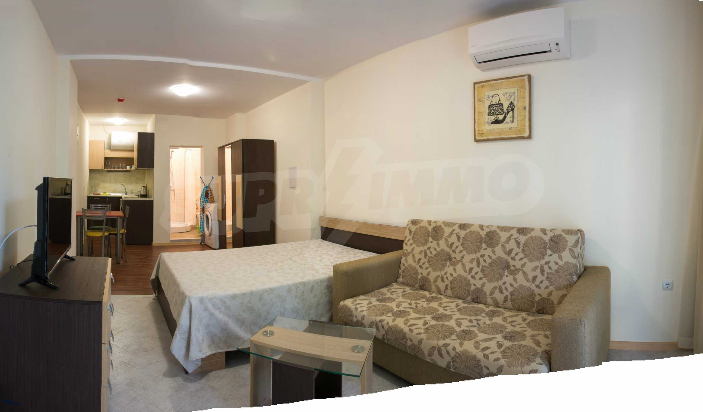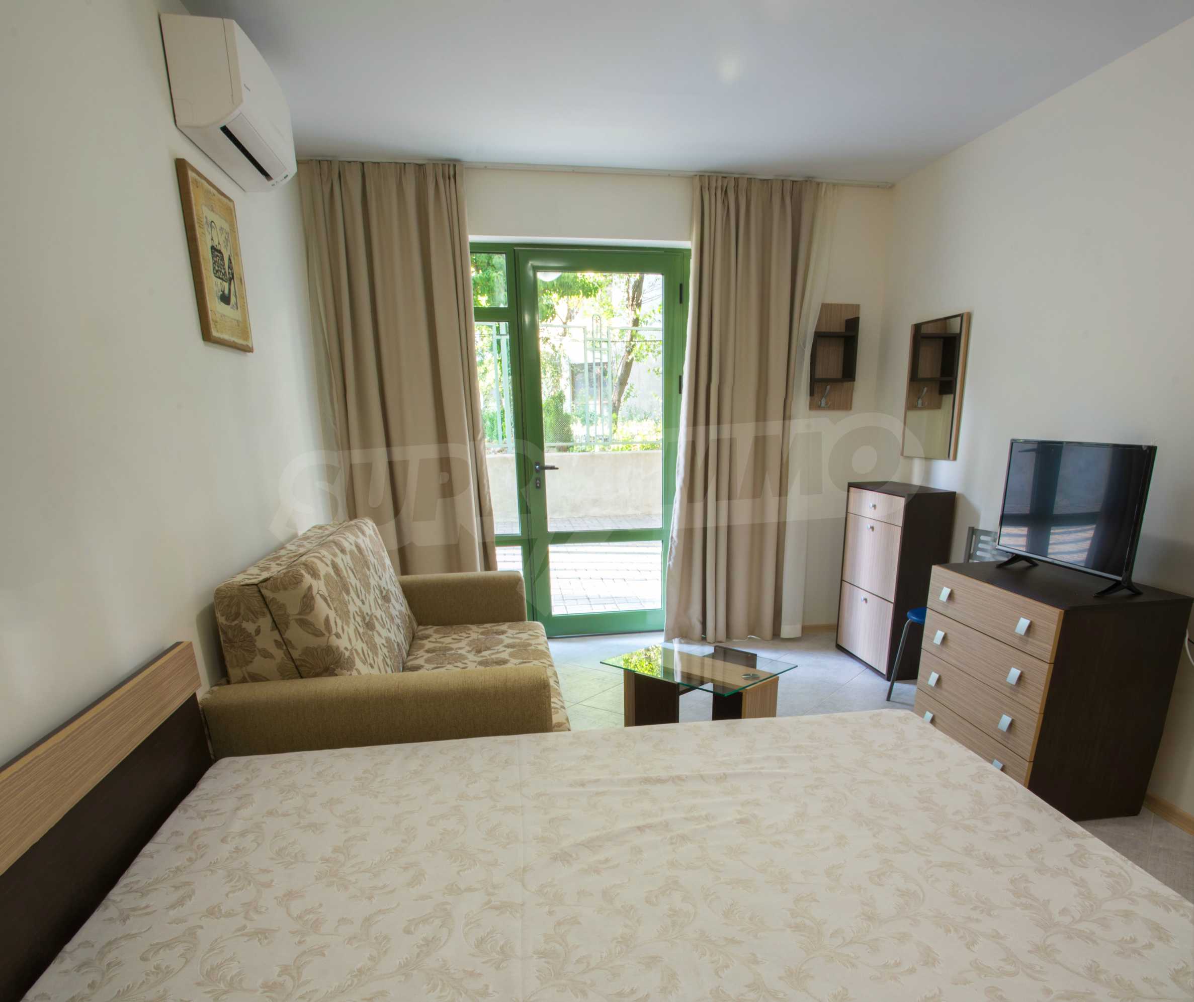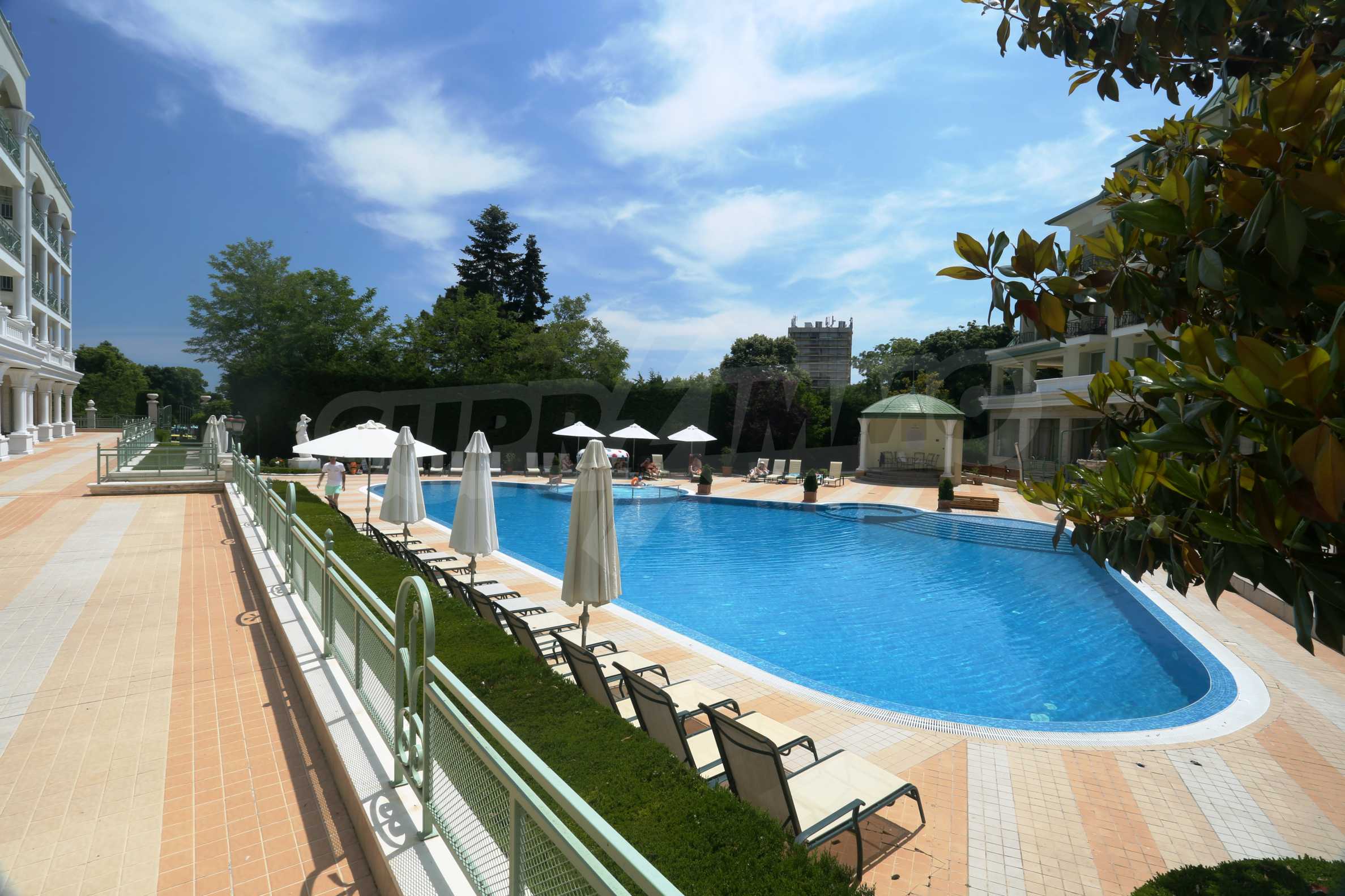 An attractive offer for a ready to move studios in SPA Hotel Romance Splendid, 300 m from the beach. The apartments overlook the swimming pool. St. St. Constantine and Helena is the oldest Bulgarian Black Sea resort. It is located 8 km north of the city center of Varna. Here you will find many places for entertainment - clubs, restaurants, bars, souvenir and clothing shops, race track, water sports, jet skis, surfing and more. The resort has police station, post office, pharmacy, gas station and health center, as well as regular bus lines for connection with the train station and the city center of Varna.