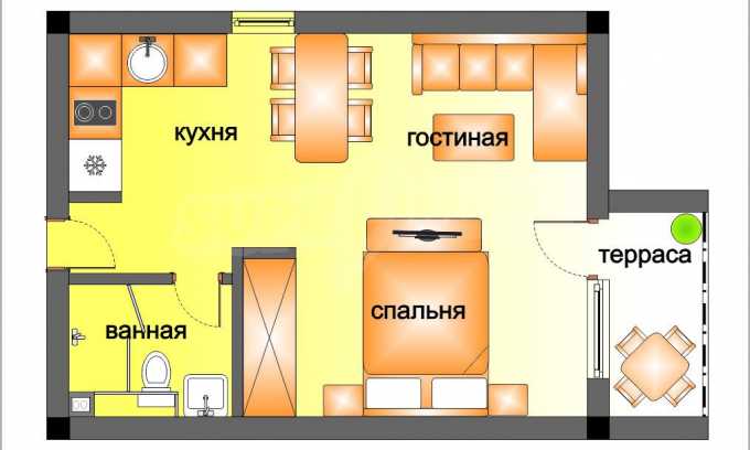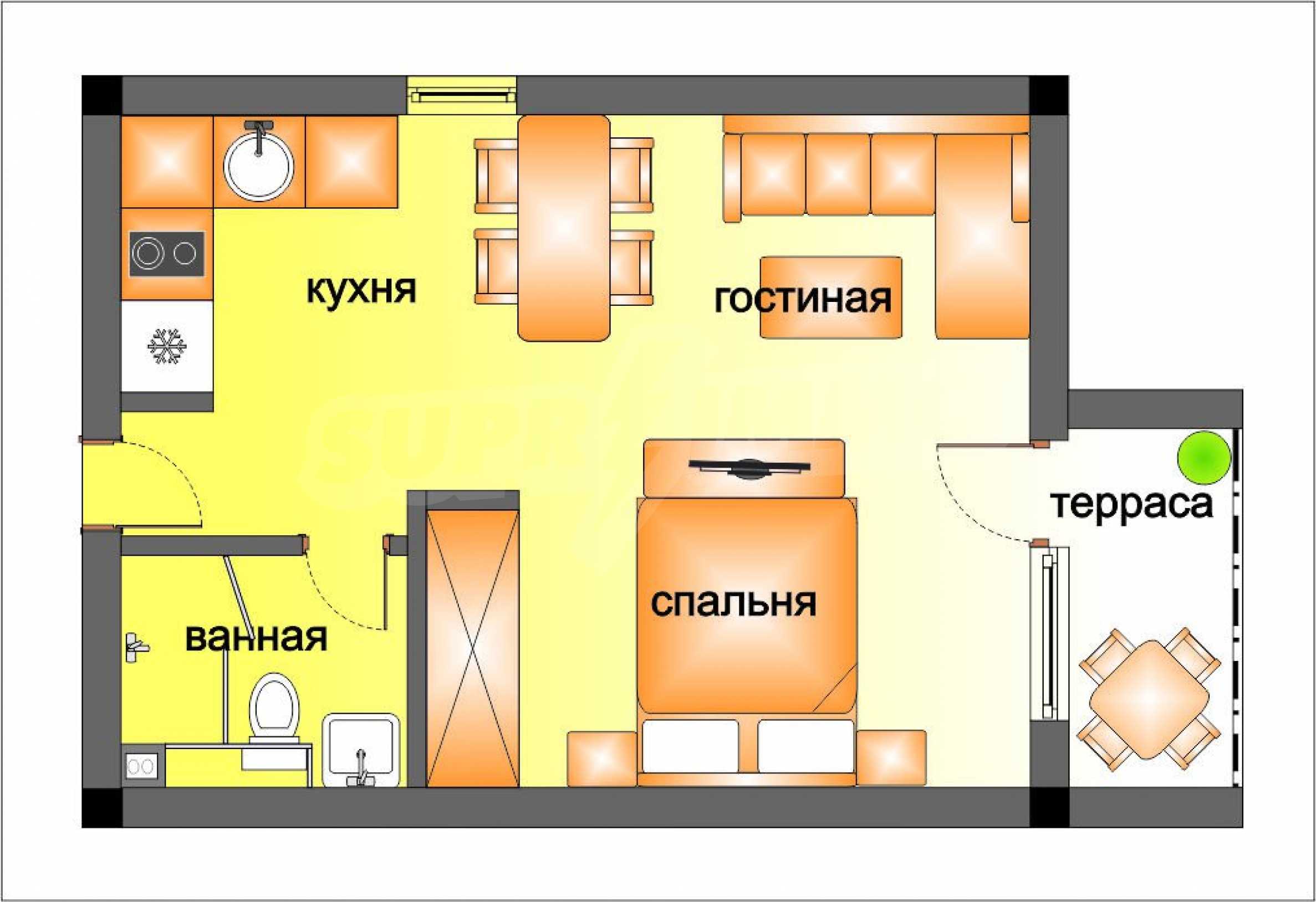 Layout: very functional for one-room apartment: separate area for kitchen and living room, bedroom zone, bathroom with toilet, spacious terrace;
