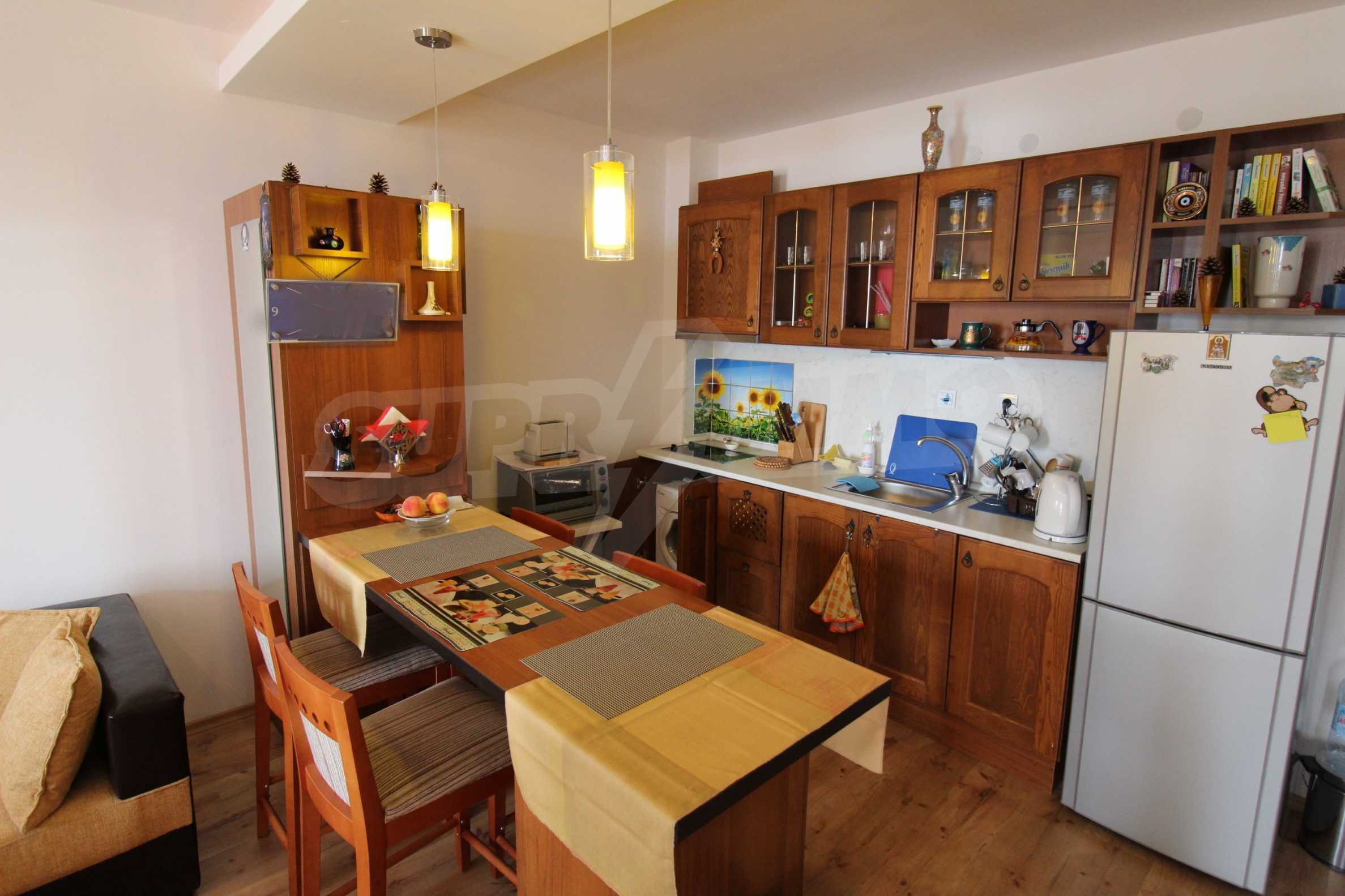 The condition of the apartment is very good. The apartment is offered with quality flooring of natural parquet, walls - latex, double glazed windows PVC window frames, french type windows, interior doors, equipped bathroom, and kitchen. The apartment is fully furnished, ready-to-move-in and comes with everything needed for comfortable living.