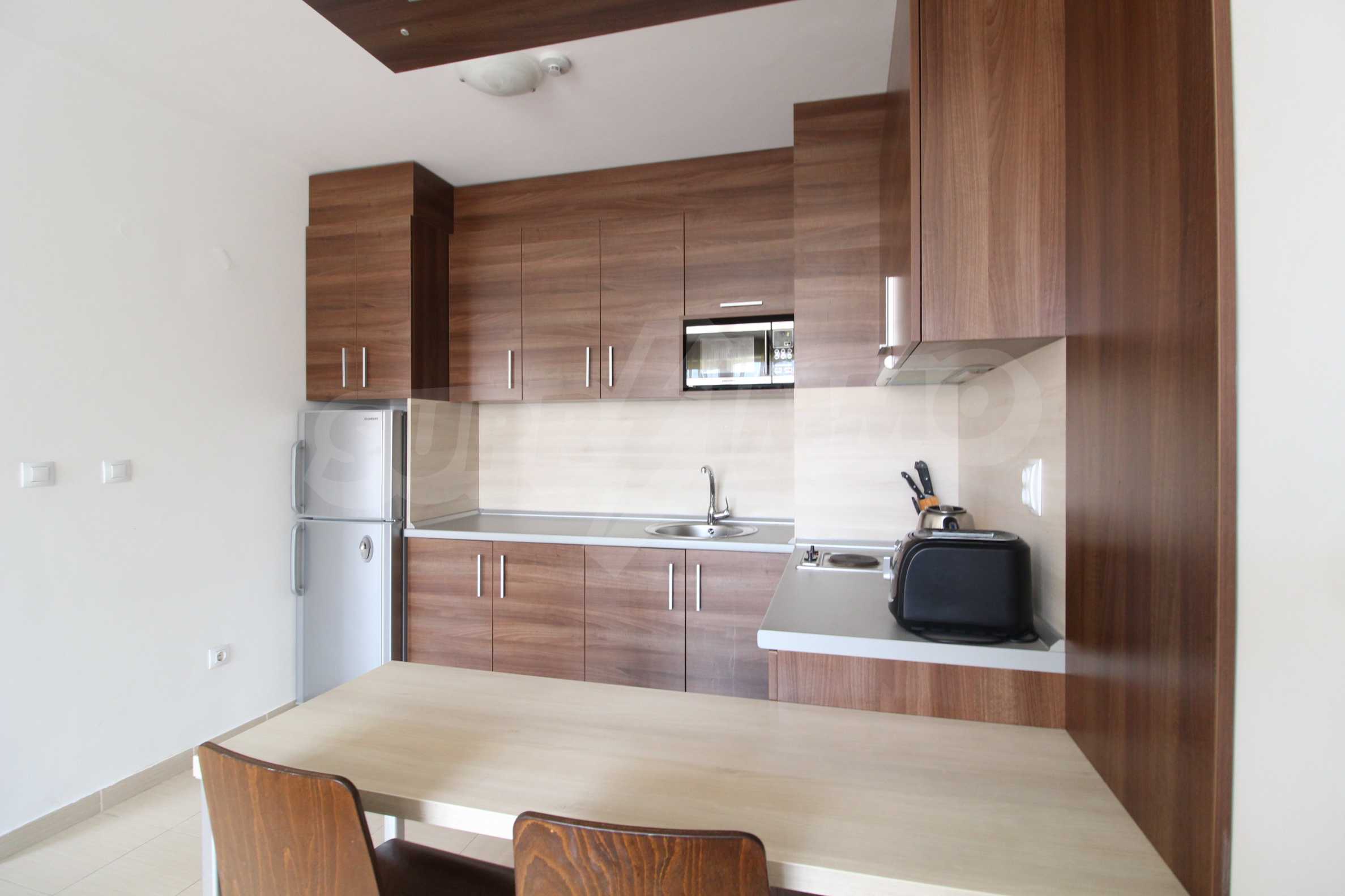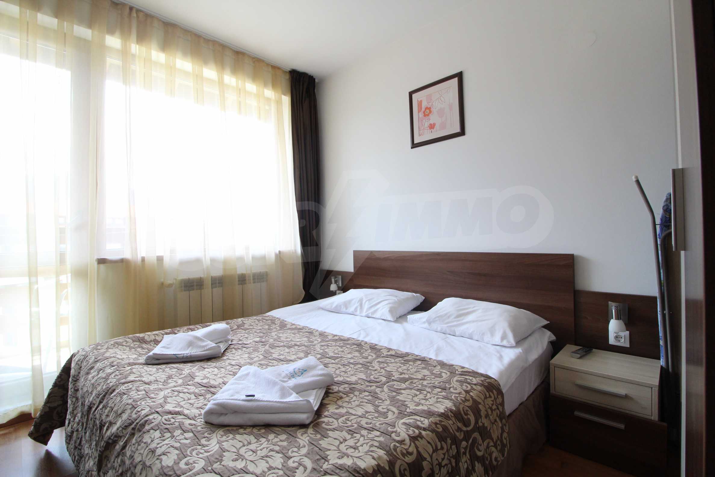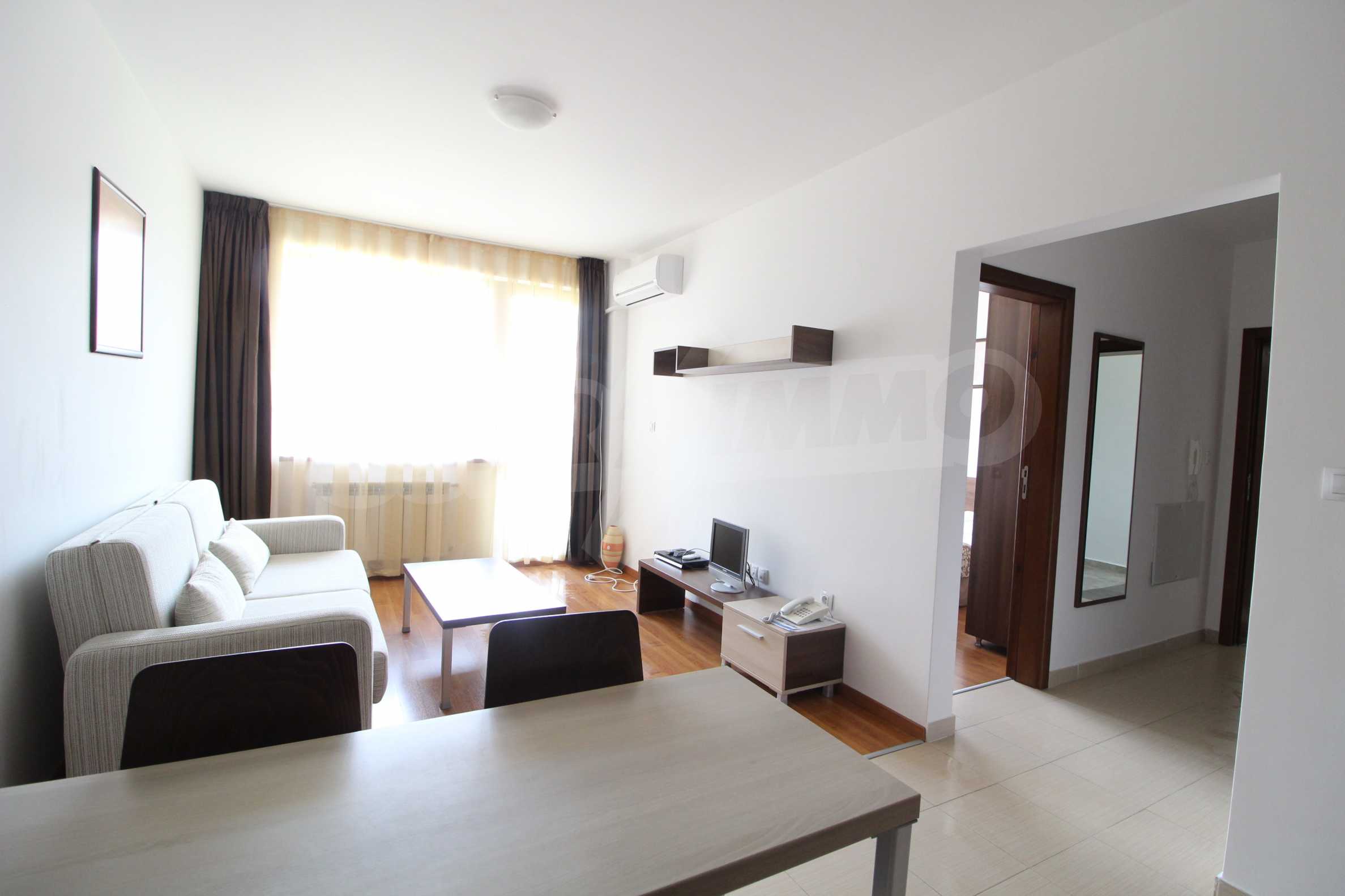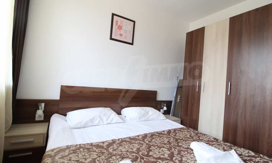 One-bedroom apartment with an area of 58.06 sq.m., which is located in Belvedere Holiday Club complex. The property offers: an equipped kitchen with living room and terrace, one bedroom and bathroom with toilet. The apartment is located on the fifth floor. The kitchen consists of kitchen cupboards, refrigerator, stove and dining table. The living room is furnished with sofa, armchair and TV. The bedroom offers double bed, bedside tables and wardrobe.